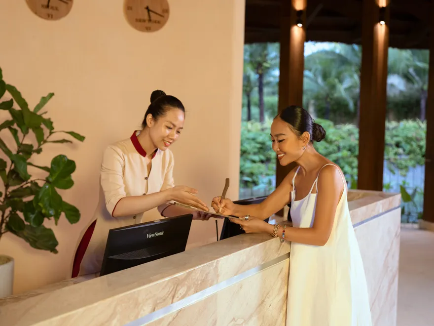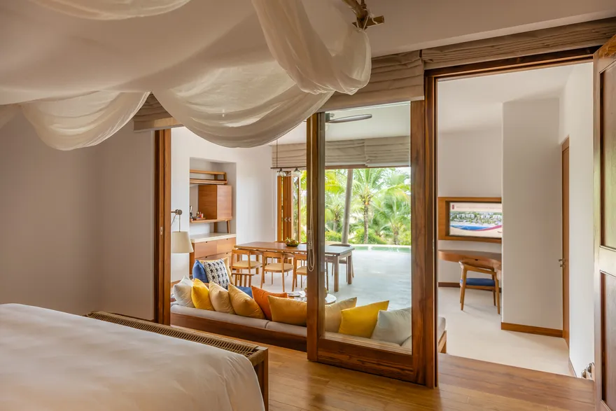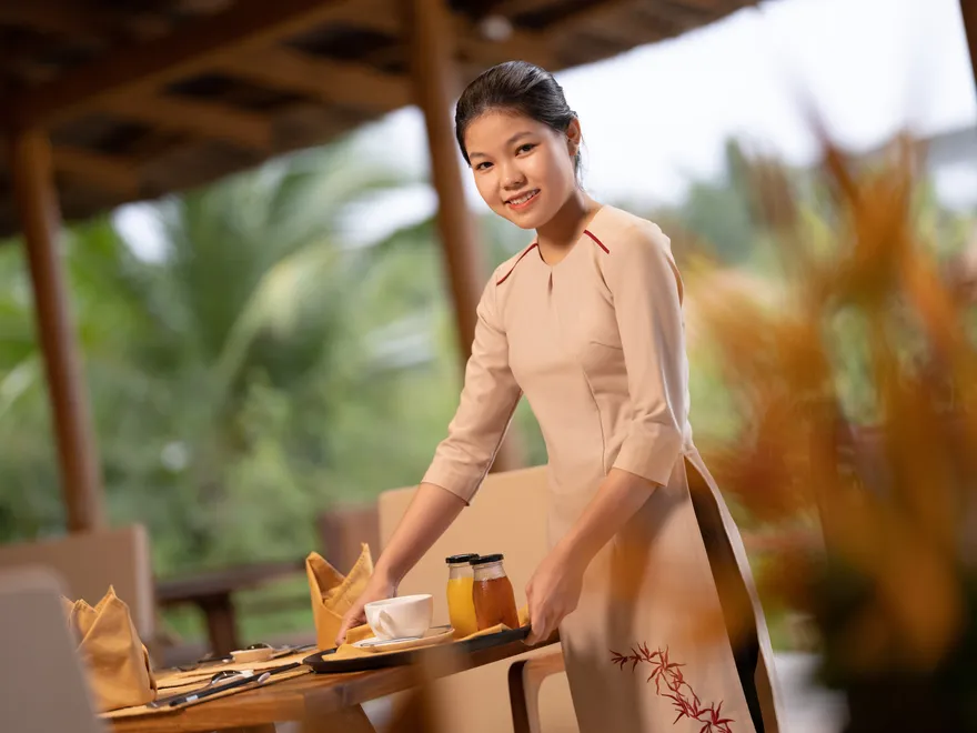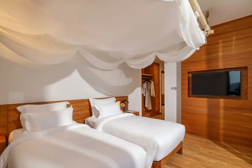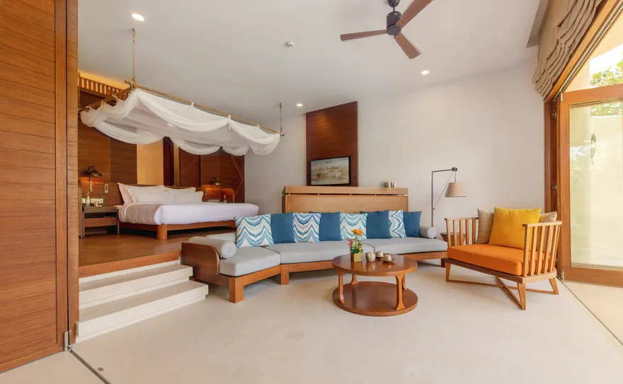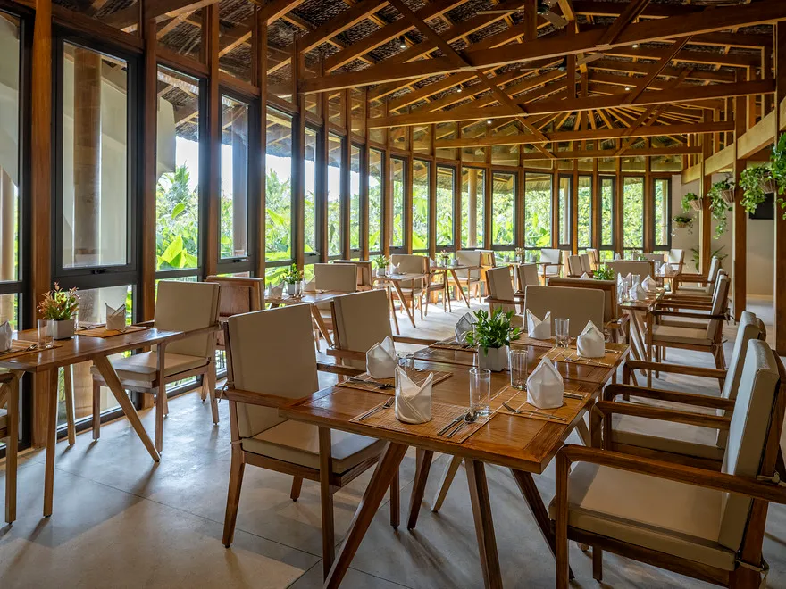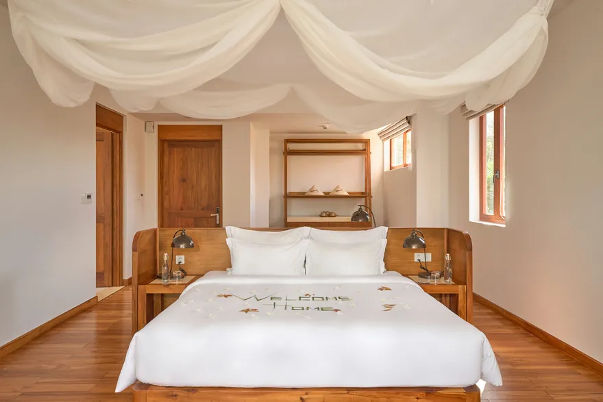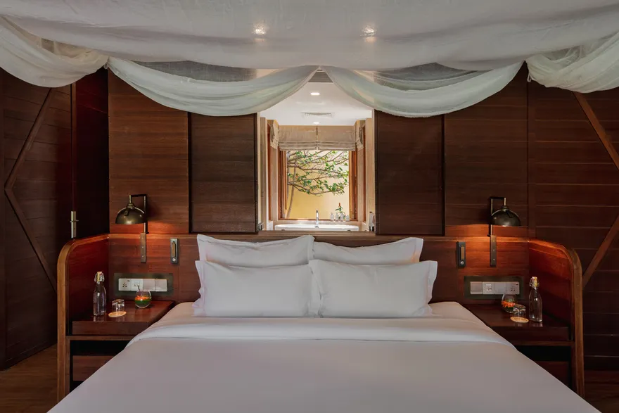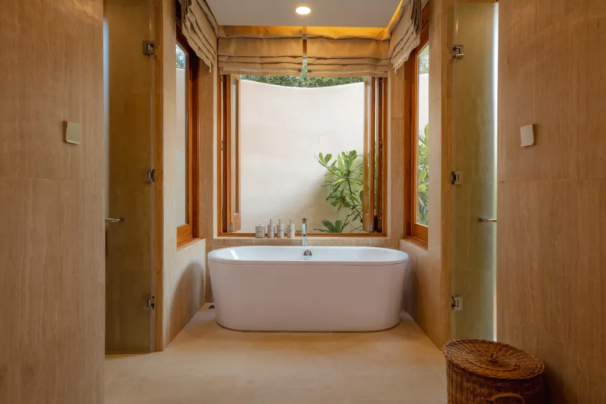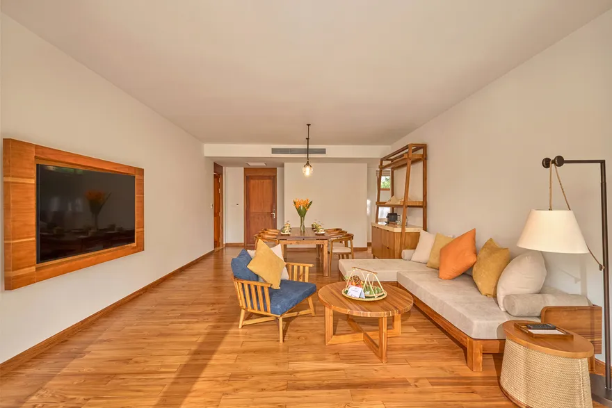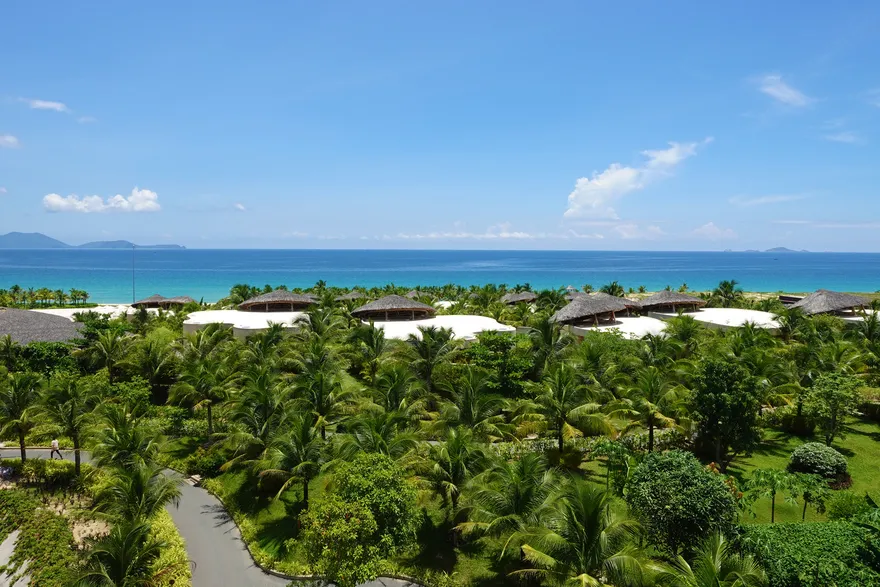 Sự sang trọng tại đây không đến từ những khối bê tông hào nhoáng mà nằm ở chiều sâu của hơi thở Indochine kết hợp cùng các vật liệu tự nhiên bản địa. Sự kết hợp tinh tế giữa gỗ ấm áp, đá thô mộc và gốm sứ tinh xảo trong từng ngóc ngách của resort tạo nên một không gian tĩnh lặng, gần gũi với đất mẹ. Lối thiết kế ưu tiên không gian mở giúp ranh giới giữa con người và thiên nhiên trở nên mờ nhạt, nơi du khách có thể chạm tay vào ánh nắng và cảm nhận gió biển len lỏi qua từng kẽ lá, mang lại trải nghiệm thư giãn tuyệt đối cho tâm hồn.