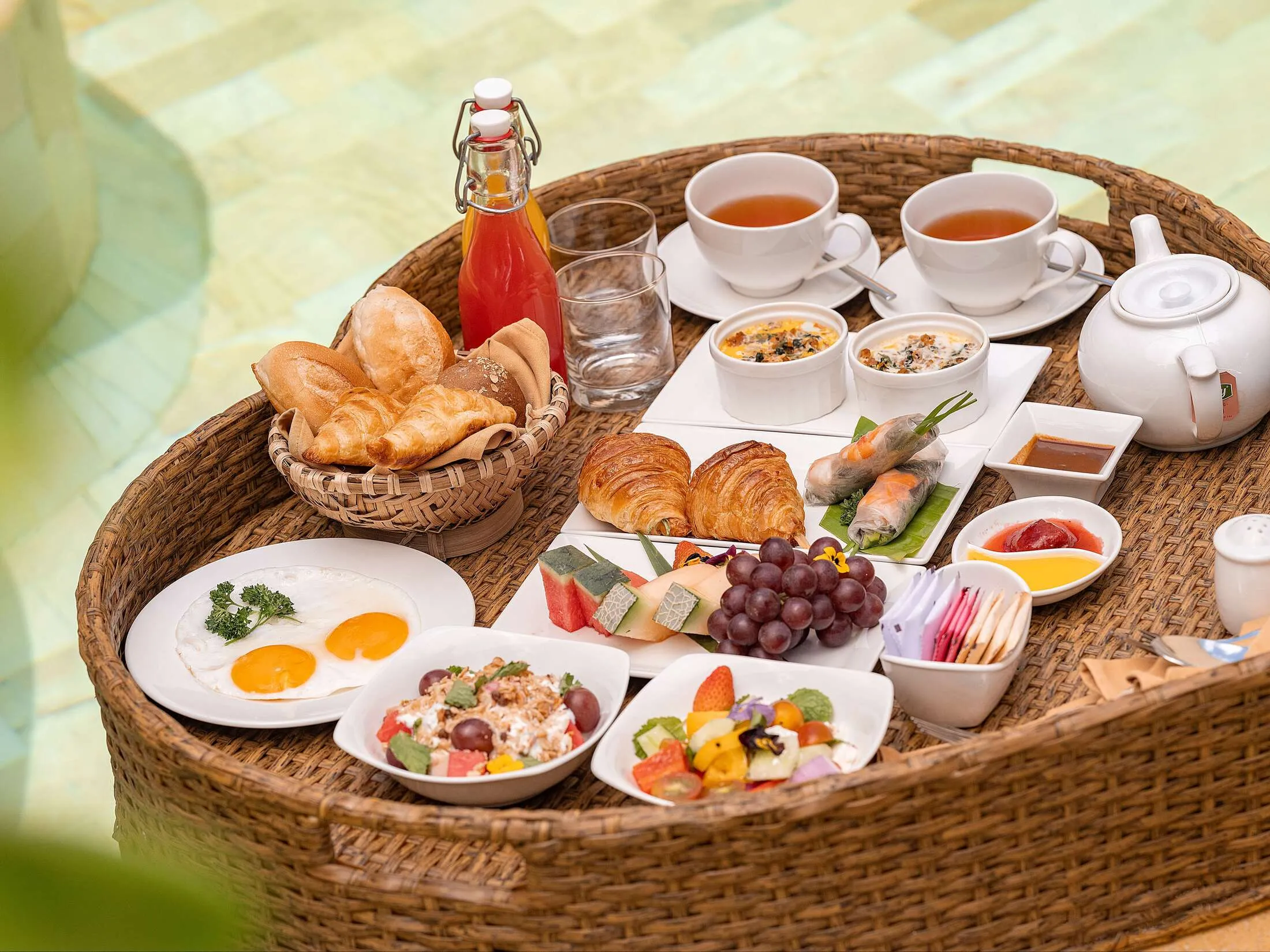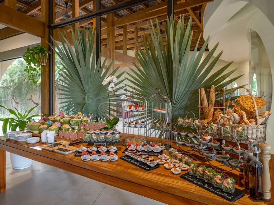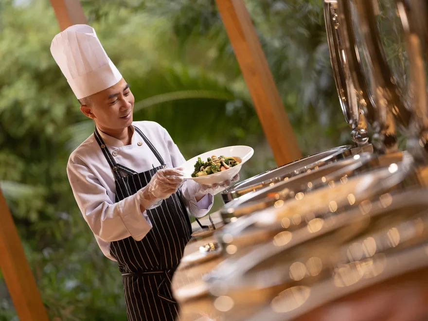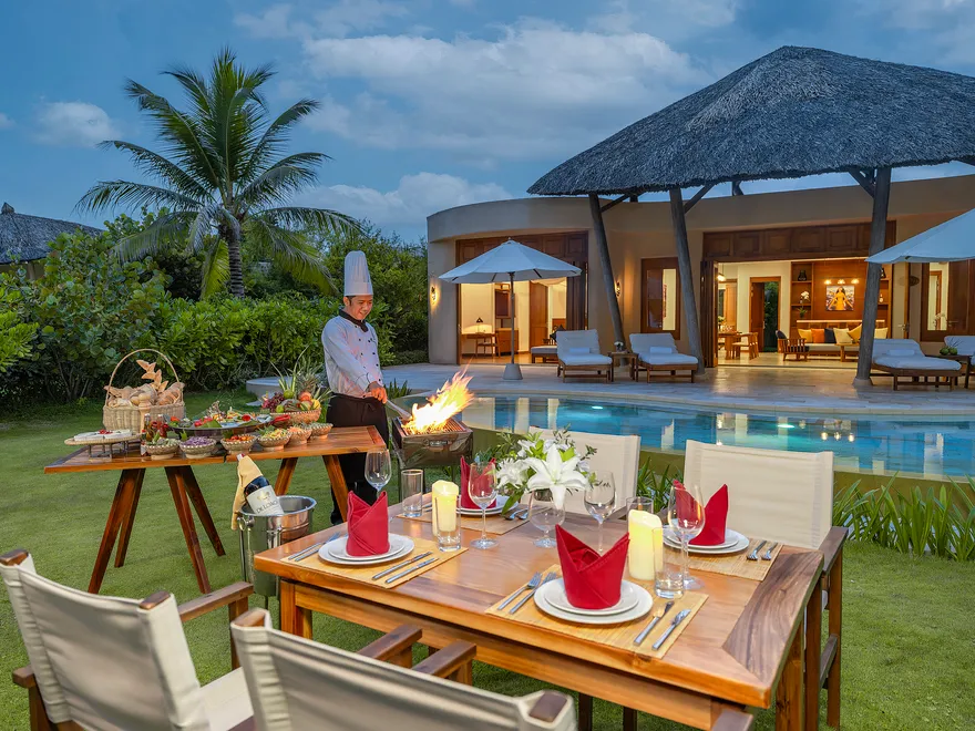 Để nâng tầm trải nghiệm cá nhân hóa, khu nghỉ dưỡng còn kiến tạo những khoảnh khắc ẩm thực mang tính biểu tượng như “Bữa sáng nổi” (Floating Breakfast) đầy sắc màu ngay tại hồ bơi riêng của biệt thự, khởi đầu ngày mới theo cách rực rỡ và tràn đầy năng lượng nhất. Đối với những buổi sum họp gia đình ấm cúng, dịch vụ tiệc nướng BBQ riêng tư tại Villa là lựa chọn hoàn hảo để tận hưởng sự biệt lập và sang trọng. Đặc biệt, triết lý “từ vườn đến bàn ăn” được thể hiện rõ nét khi nguồn nguyên liệu rau thơm và gia vị được thu hái trực tiếp từ vườn thảo mộc Organic ngay trong khuôn viên, đảm bảo mỗi món ăn không chỉ thơm ngon mà còn trọn vẹn dưỡng chất và sự tươi mới.