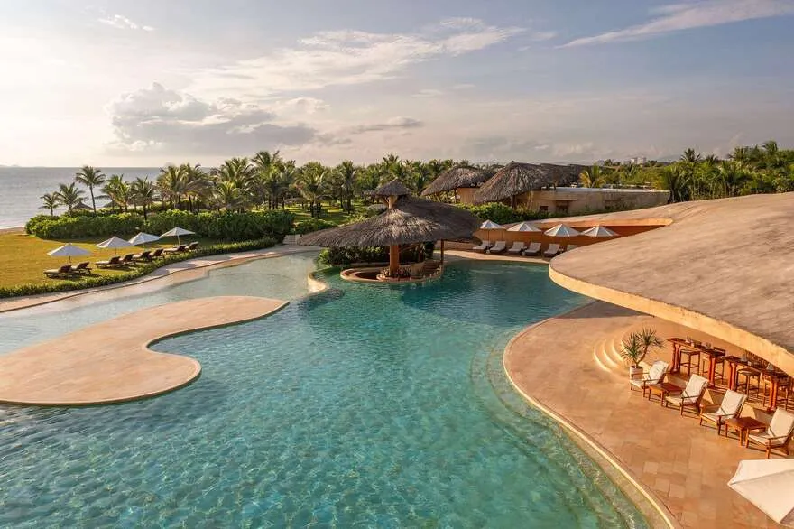 Kiến trúc của Ana Mandara Cam Ranh không chỉ dừng lại ở một công trình lưu trú mà còn là một tác phẩm nghệ thuật tôn vinh bản sắc Việt giữa dòng chảy hiện đại. Điểm nhấn độc bản khiến du khách ấn tượng ngay từ cái nhìn đầu tiên chính là hình ảnh chiếc nón lá cách điệu khổng lồ được lồng ghép khéo léo vào thiết kế của khu vực sảnh và hồ bơi vô cực. Những đường cong mềm mại của mái nón không chỉ mang tính biểu tượng văn hóa sâu sắc mà còn tạo ra cấu trúc mở thông minh, giúp điều hòa nhiệt độ tự nhiên và tận dụng tối đa luồng gió biển mặn mòi của vịnh Cam Ranh.