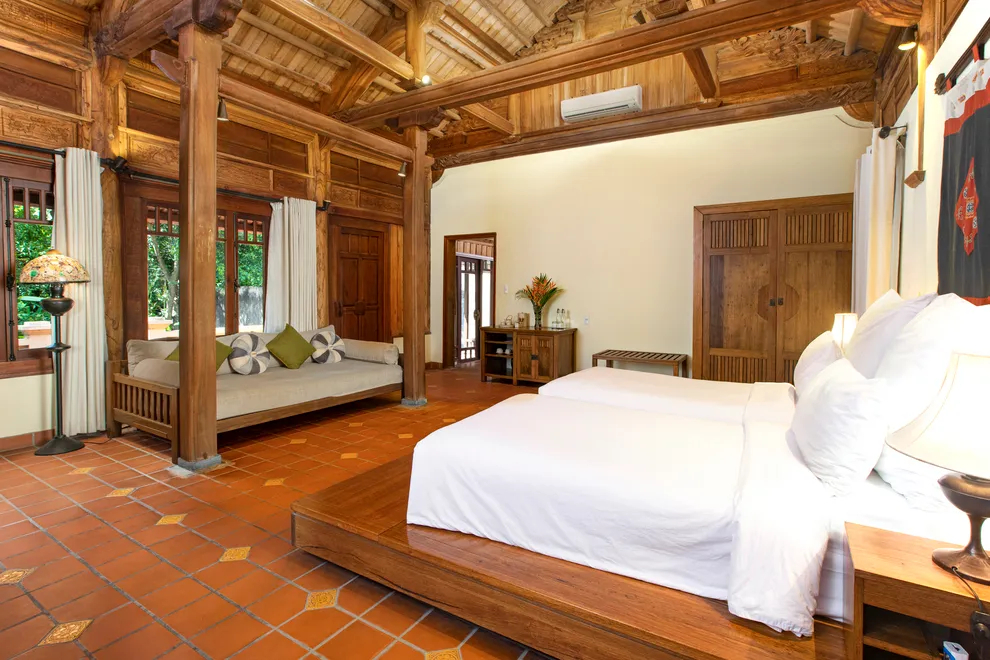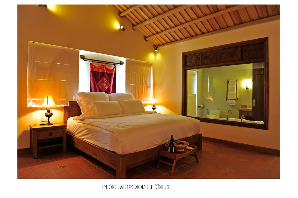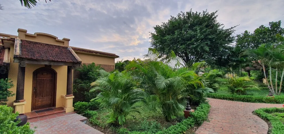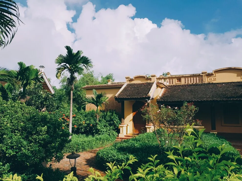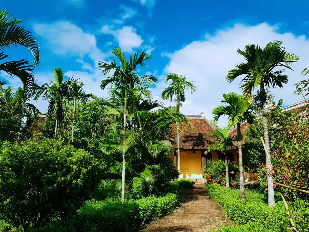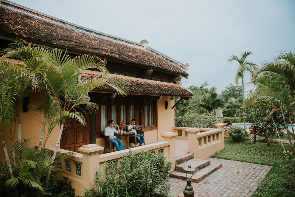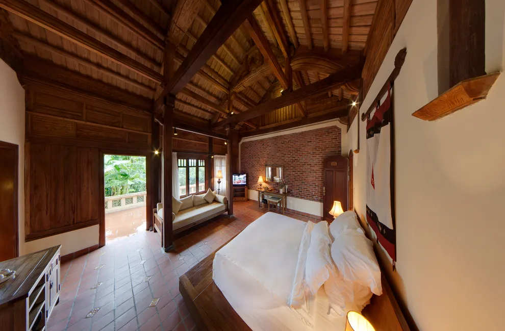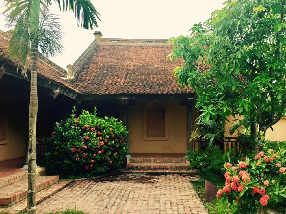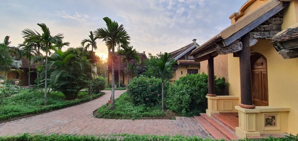 Kiến trúc của resort là một hành trình trở về quá khứ, tái hiện trọn vẹn hồn cốt của làng quê Bắc Bộ xưa với mái ngói đỏ thẫm rêu phong, đà gỗ chạm khắc tinh xảo và nền gạch gốm cổ. Điểm độc đáo nhất trong quy hoạch chính là việc phân bổ 172 phòng nghỉ vào 9 cụm xóm riêng biệt với những cái tên dân dã như Xóm Cau, Xóm Mít, Xóm Đông, Xóm Xoài. Mỗi xóm thường sở hữu một khoảng sân chung hoặc hồ bơi riêng, tạo nên sự biệt lập cần thiết nhưng vẫn giữ được tinh thần kết nối cộng đồng. Toàn bộ công trình ưu tiên sử dụng vật liệu tự nhiên như gỗ, tre, đá và gạch đất nung, khẳng định cam kết đối với du lịch bền vững và bảo vệ môi trường.