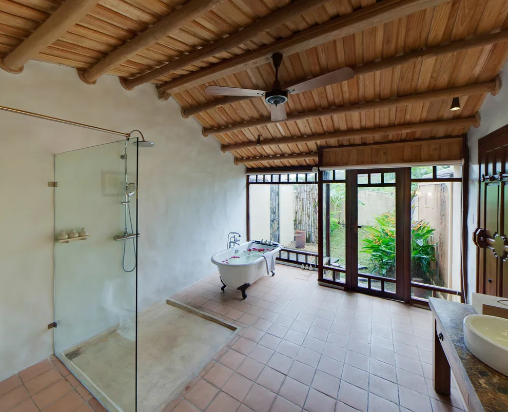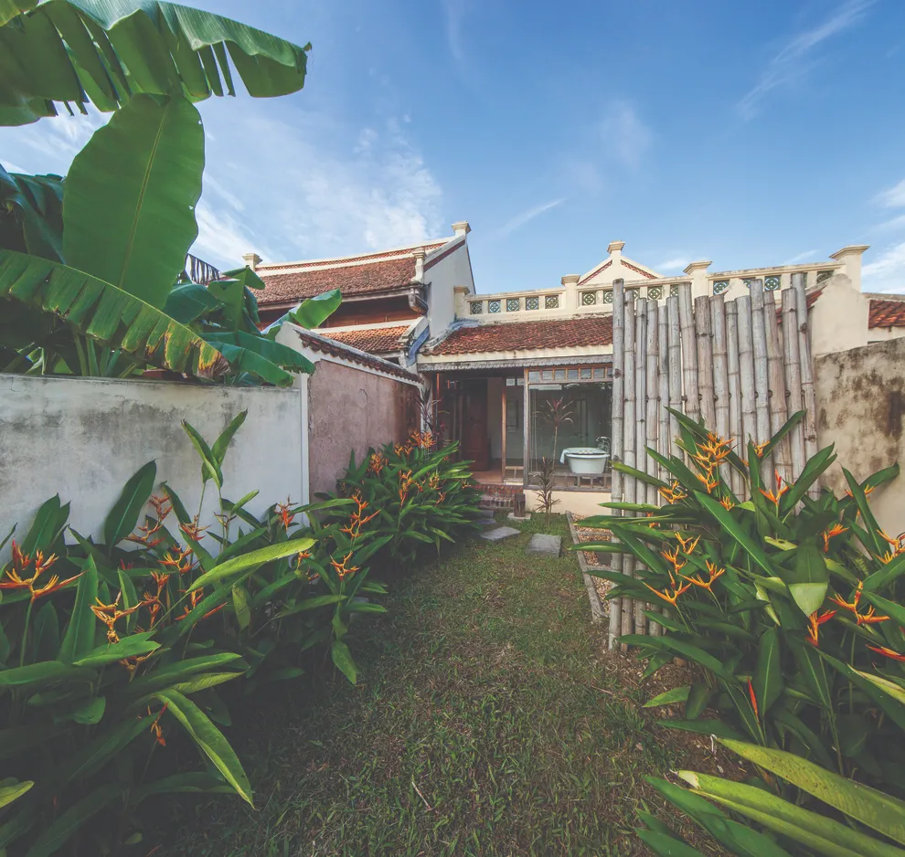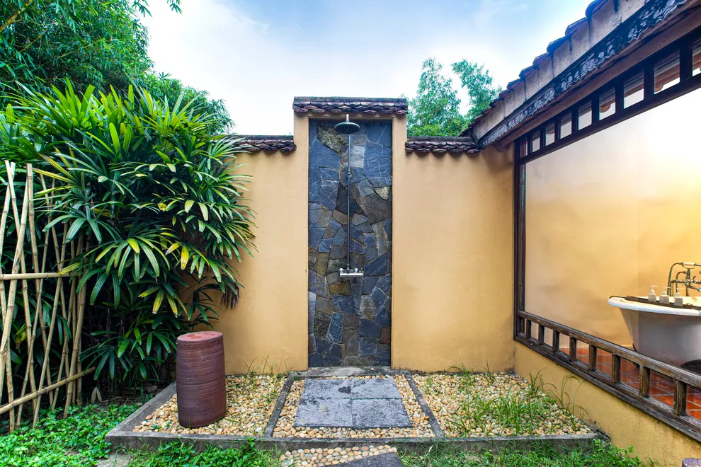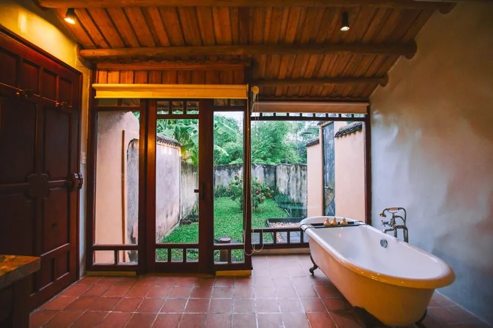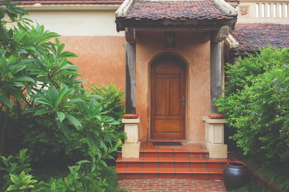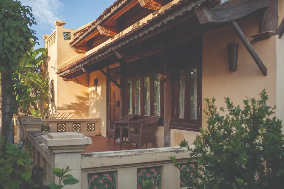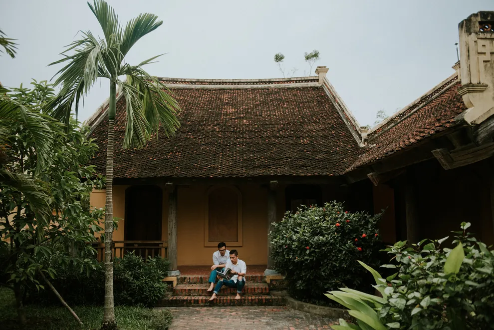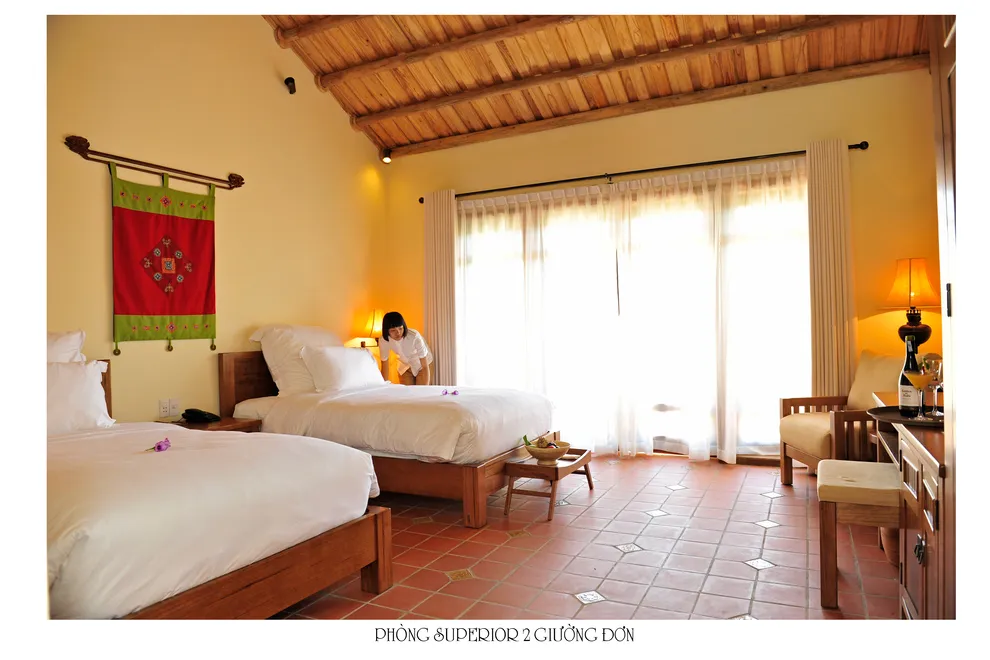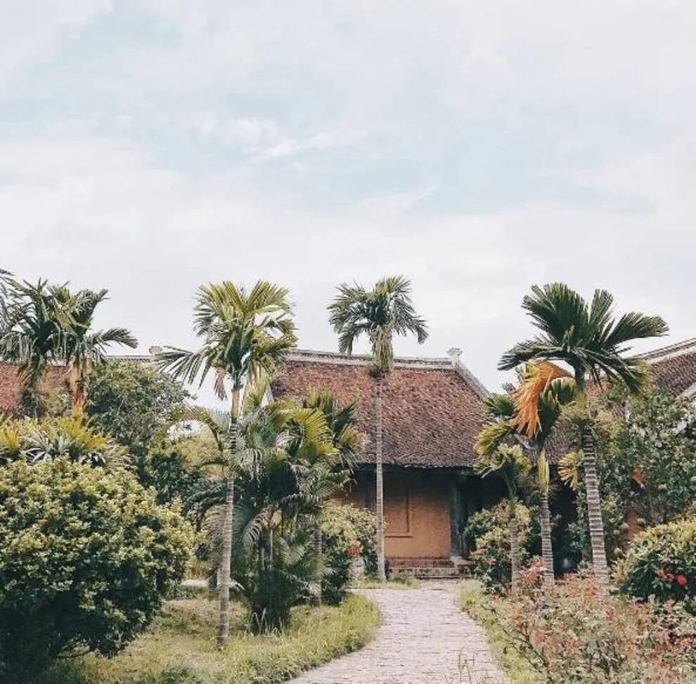 Kiến trúc của resort là một hành trình trở về quá khứ, tái hiện trọn vẹn hồn cốt của làng quê Bắc Bộ xưa với mái ngói đỏ thẫm rêu phong, đà gỗ chạm khắc tinh xảo và nền gạch gốm cổ. Điểm độc đáo nhất trong quy hoạch chính là việc phân bổ 172 phòng nghỉ vào 9 cụm xóm riêng biệt với những cái tên dân dã như Xóm Cau, Xóm Mít, Xóm Đông, Xóm Xoài. Mỗi xóm thường sở hữu một khoảng sân chung hoặc hồ bơi riêng, tạo nên sự biệt lập cần thiết nhưng vẫn giữ được tinh thần kết nối cộng đồng. Toàn bộ công trình ưu tiên sử dụng vật liệu tự nhiên như gỗ, tre, đá và gạch đất nung, khẳng định cam kết đối với du lịch bền vững và bảo vệ môi trường.