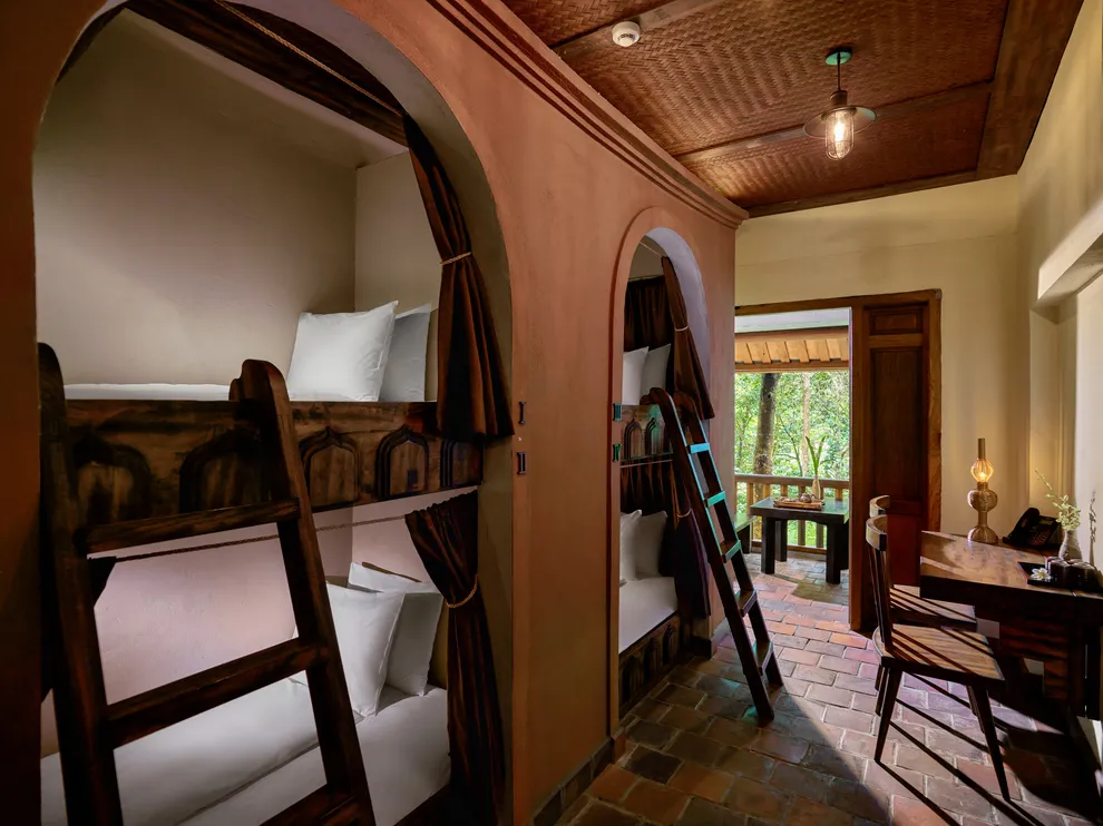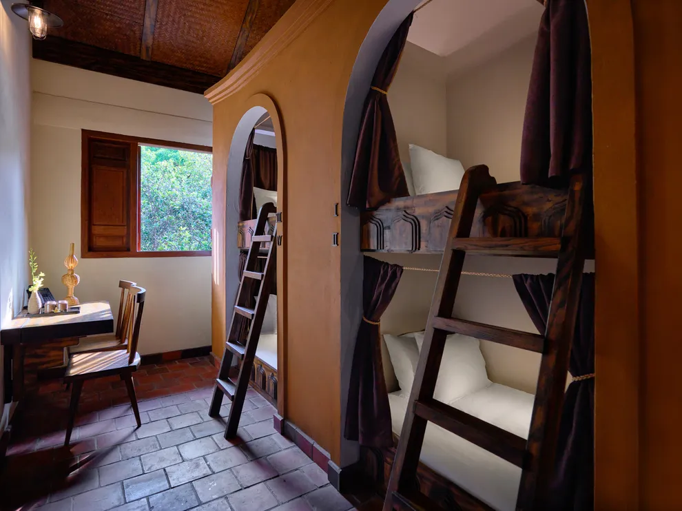 Phòng nghỉ tại Làng Nương được thiết kế độc đáo dạng “kén ngủ” (Cocoon) hoặc giường tầng, tối ưu cho nhóm 4 người ở chung nhưng vẫn đảm bảo sự riêng tư và tiện nghi cơ bản. Đây là lựa chọn lý tưởng cho gia đình hoặc nhóm bạn với ngân sách hợp lý.