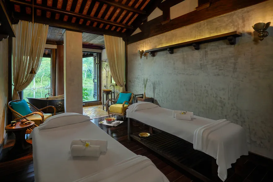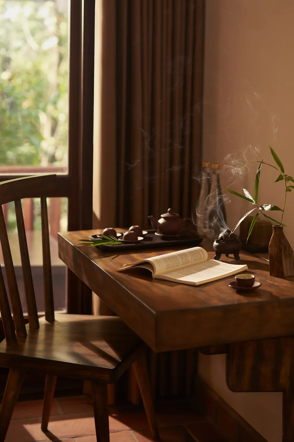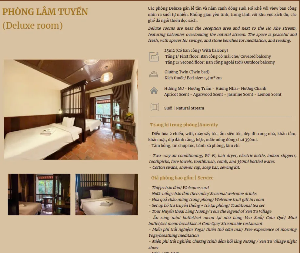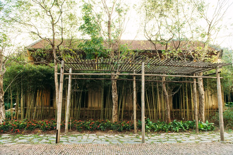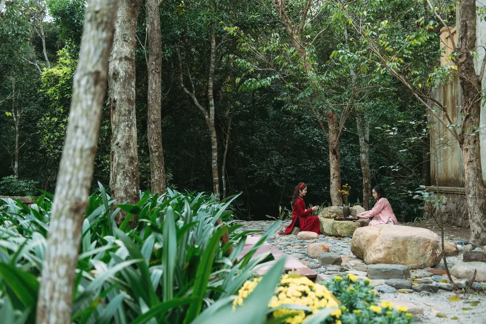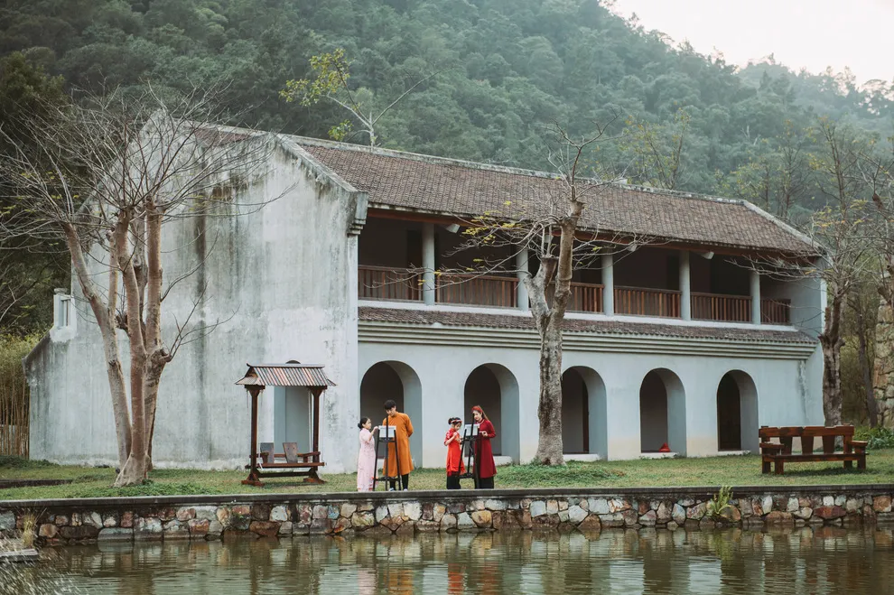 Đối lập với vẻ uy nghi của Legacy là sự mộc mạc, gần gũi của Làng Nương Yên Tử – một “viên ngọc ẩn” dành cho những tâm hồn yêu văn hóa làng quê. Khu nghỉ dưỡng này tái hiện trọn vẹn hình ảnh ngôi làng Bắc Bộ xưa với tường trình đất, mái ngói nâu trầm, đường gạch và dòng suối Giải Oan thơ mộng chảy qua làng. Các khu nhà được đặt tên theo các loài thảo mộc thân thuộc như Hương Sen, Hương Cau, Hương Quế, Hương Mơ, tạo cảm giác thư thái ngay từ tên gọi.