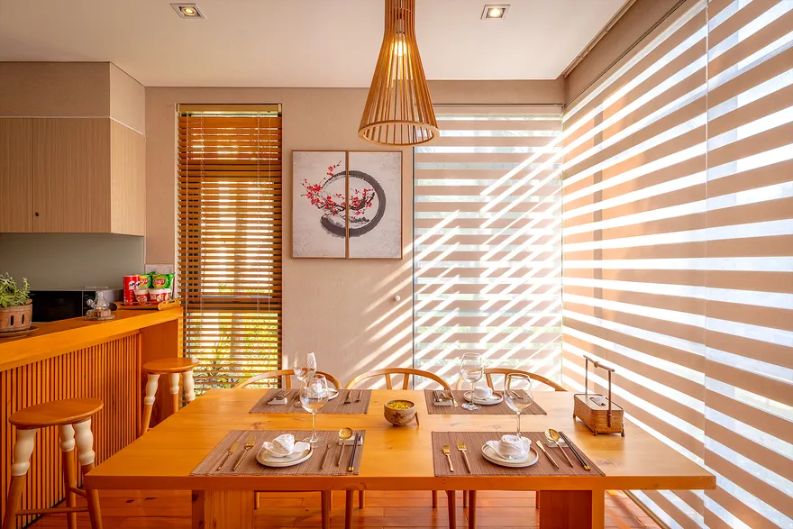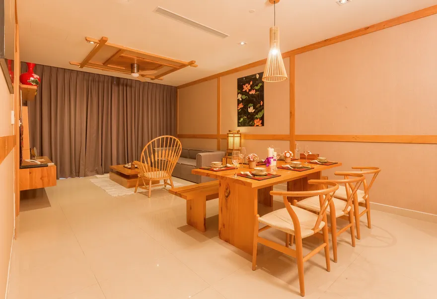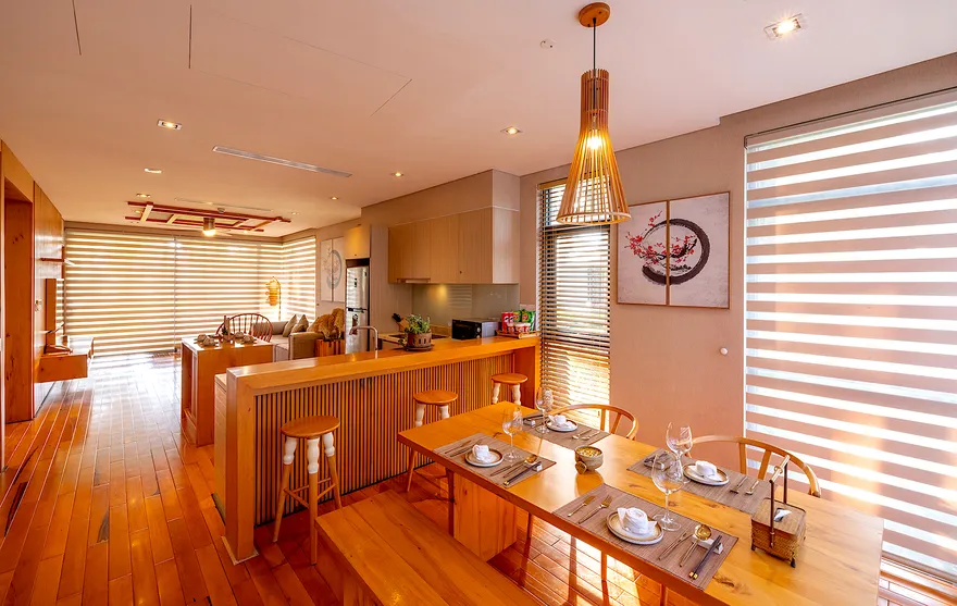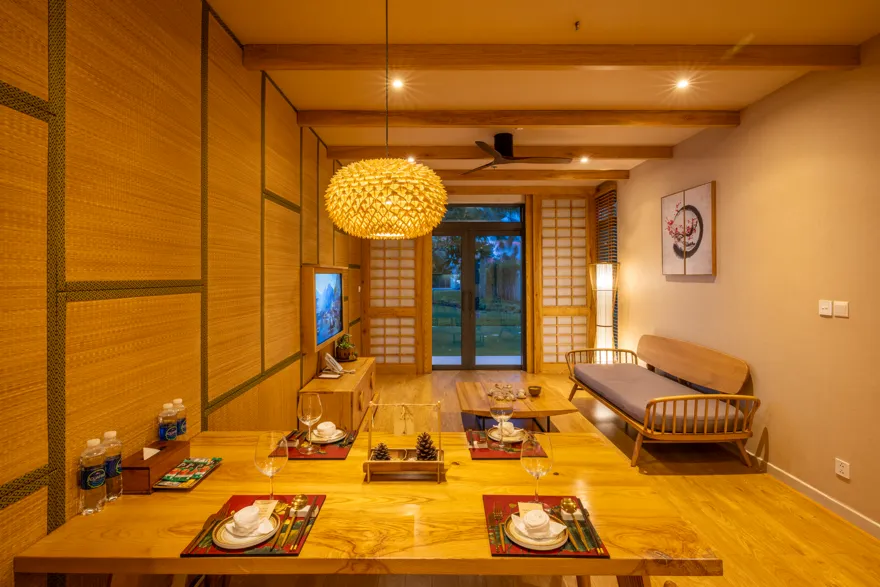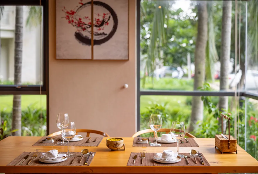 Ngôn ngữ kiến trúc tại đây là sự thực hành về triết lý Zen tối giản, kết hợp tinh tế giữa phong cách Nhật Bản và nét mộc mạc của Bali trên nền chất liệu gỗ tự nhiên chủ đạo. Không gian được thiết kế mở với hệ thống cửa kính lớn đón ánh sáng và gió biển, cùng cảnh quan “7 Nét Vườn” như Vườn Buddha, Vườn Quán Âm hay Vườn Trúc Lâm, tái hiện triết lý 7 bước chân sen của bậc giác ngộ trong từng bước đi của thực khách. Sự hiện diện của các yếu tố nước róc rách và sắc màu trung tính giúp giảm bớt kích thích thị giác, đưa tâm trí về trạng thái tĩnh lặng tuyệt đối.