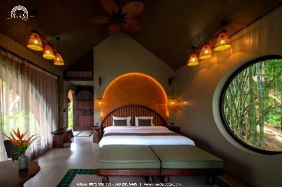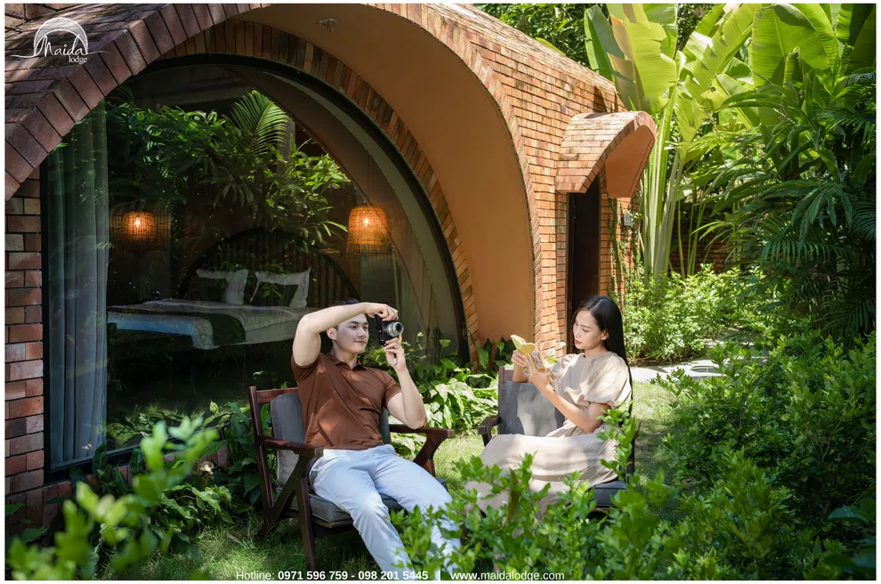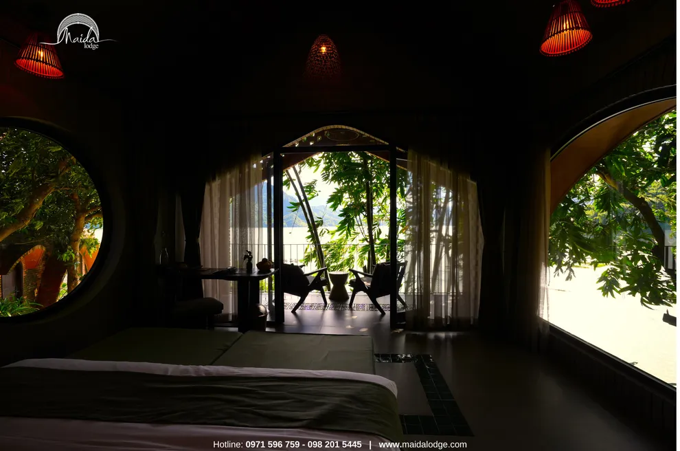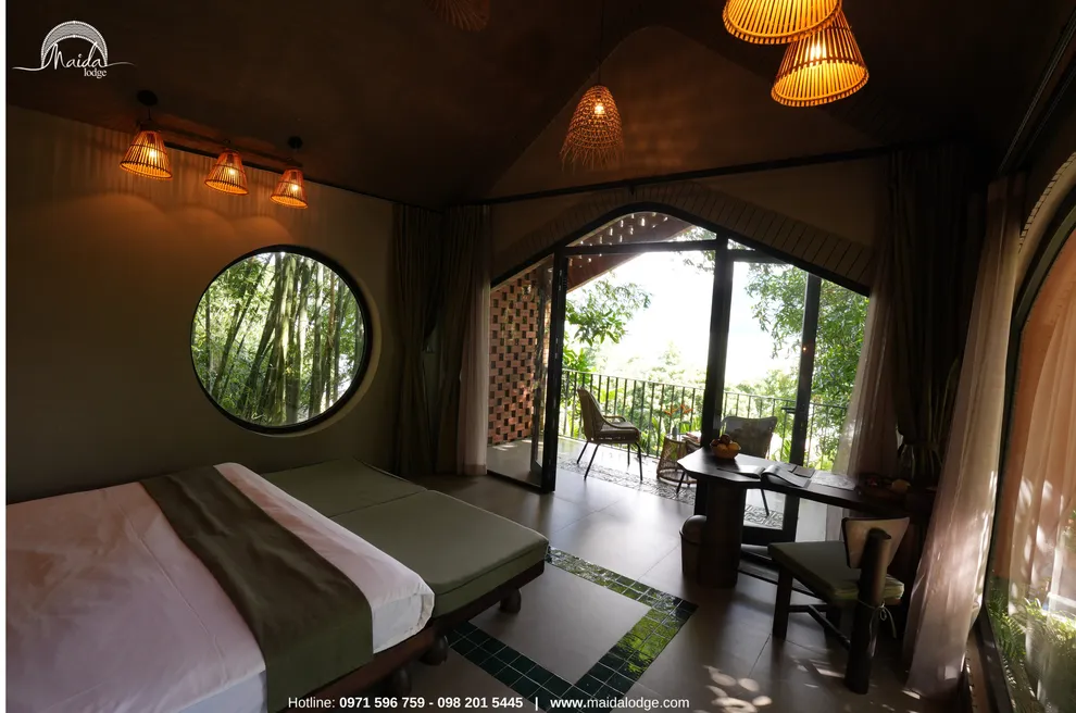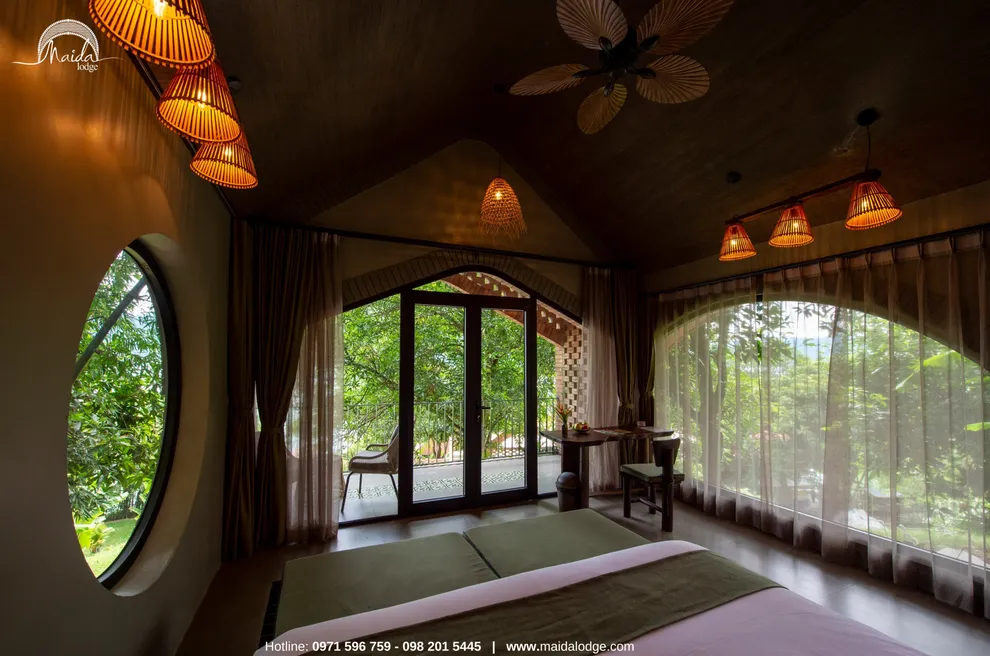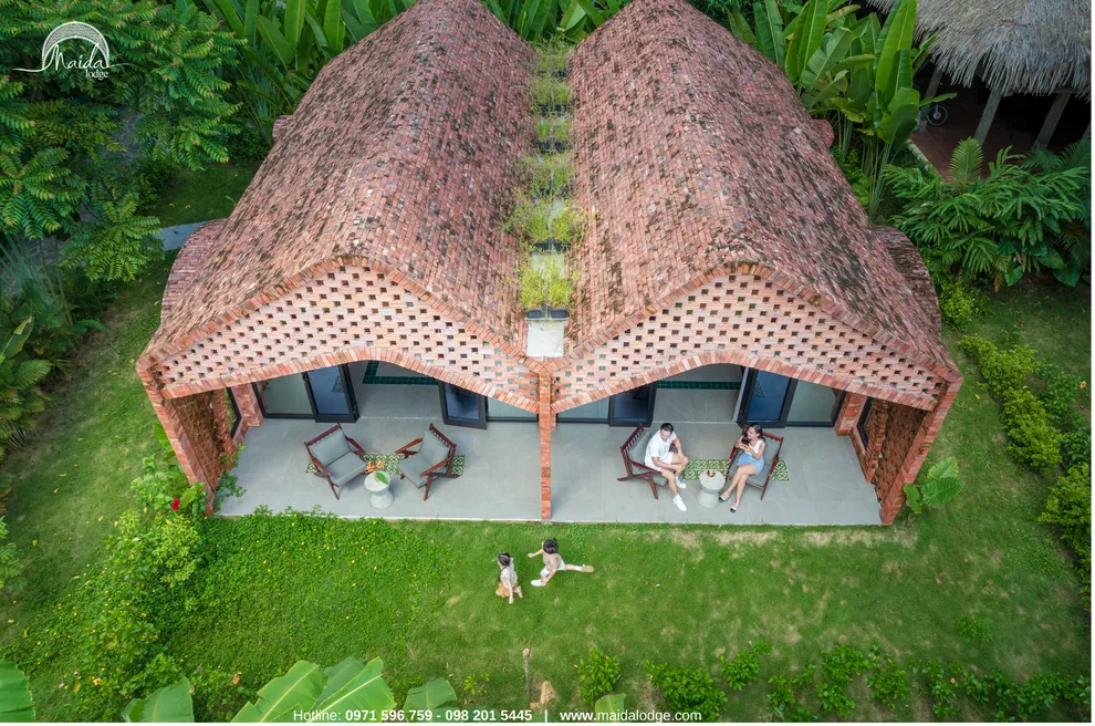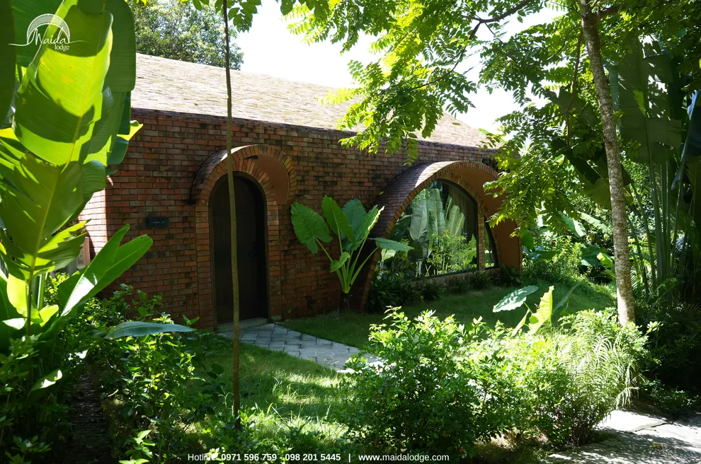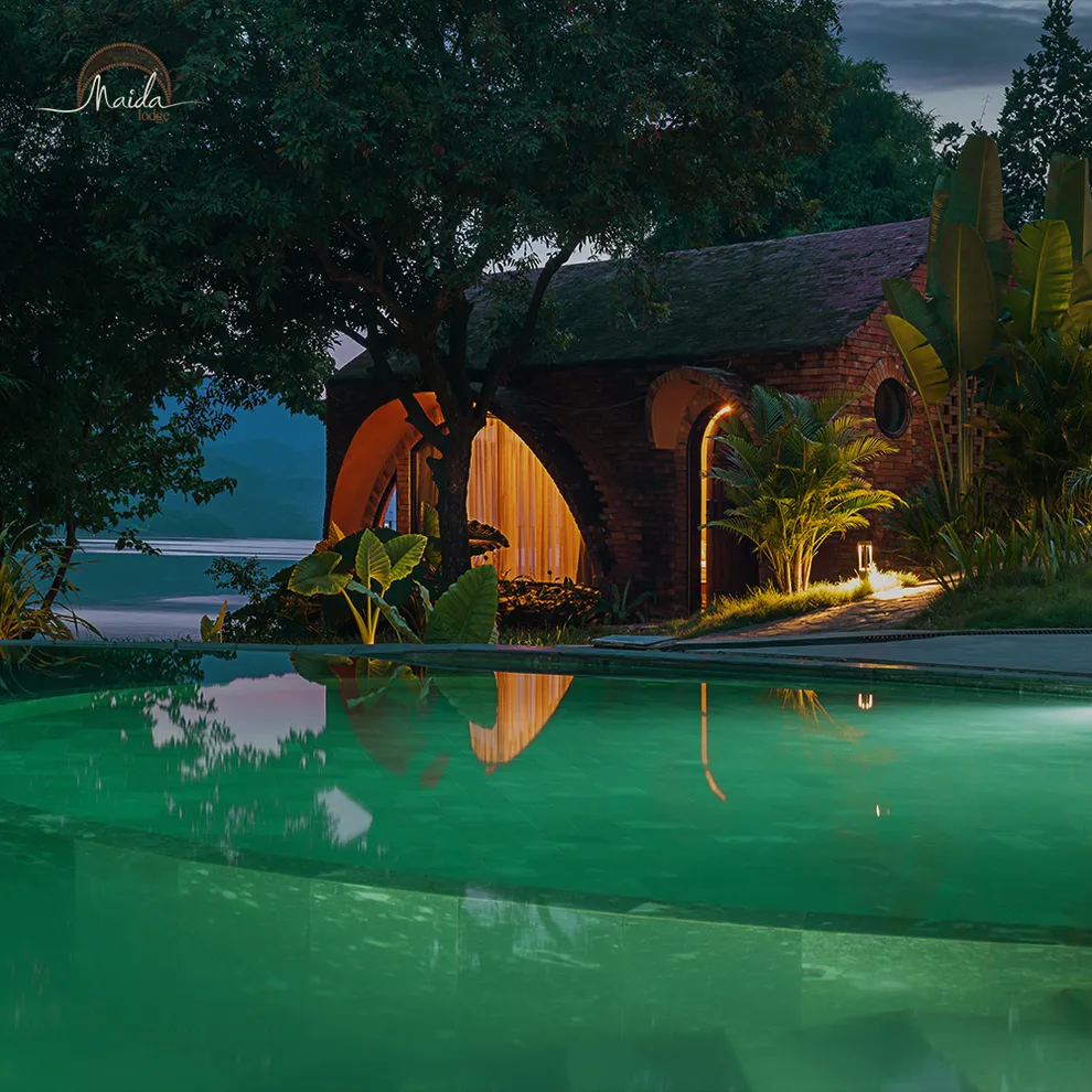 Tọa lạc tại xóm Đoàn Kết, xã Tiền Phong, huyện Đà Bắc, Maida Lodge cách trung tâm Hà Nội khoảng 120km, đủ xa để tạo nên một thế giới biệt lập nhưng cũng đủ gần cho những chuyến hành trình ngắn ngày. Kiến trúc nơi đây là sự giao thoa nhuần nhuyễn giữa phong cách mộc mạc và tinh tế, nổi bật với những mảng tường gạch đỏ trần ấm cúng. Những đường cong vòm cửa mềm mại kết hợp cùng mái nhà lượn sóng mô phỏng sinh động nhịp sóng của dòng Đà Giang, tạo nên một tổng thể hài hòa và sống động giữa màu xanh bạt ngàn của tre trúc.