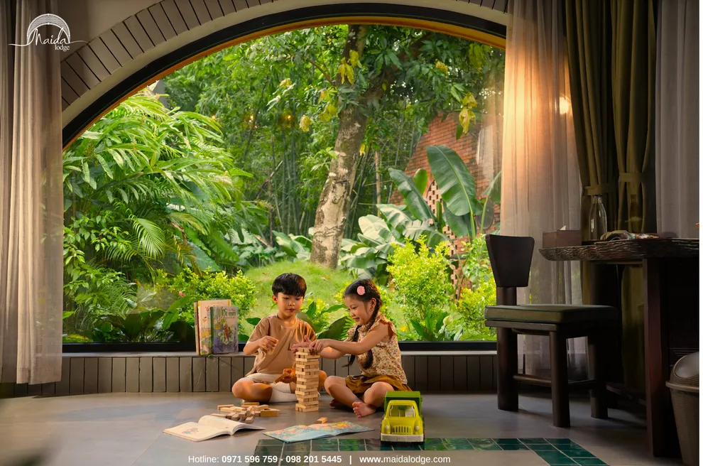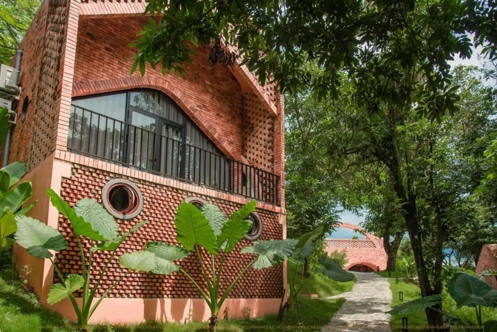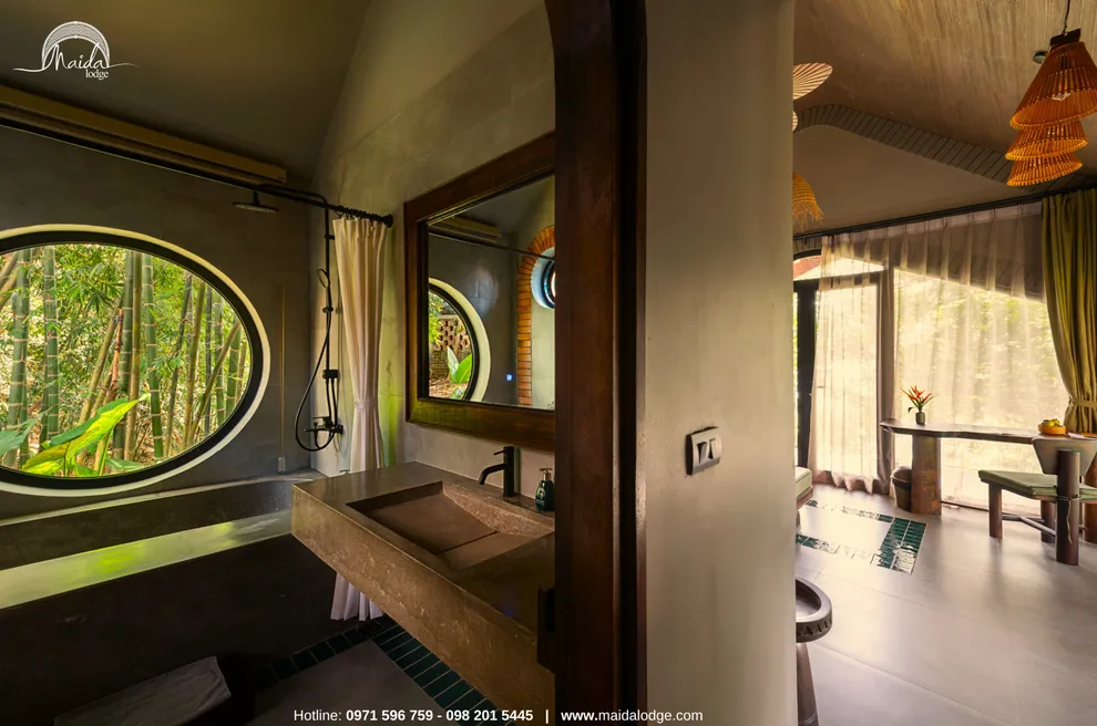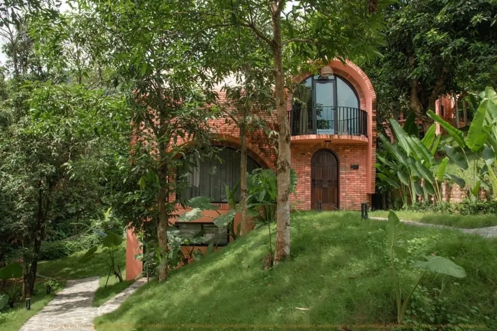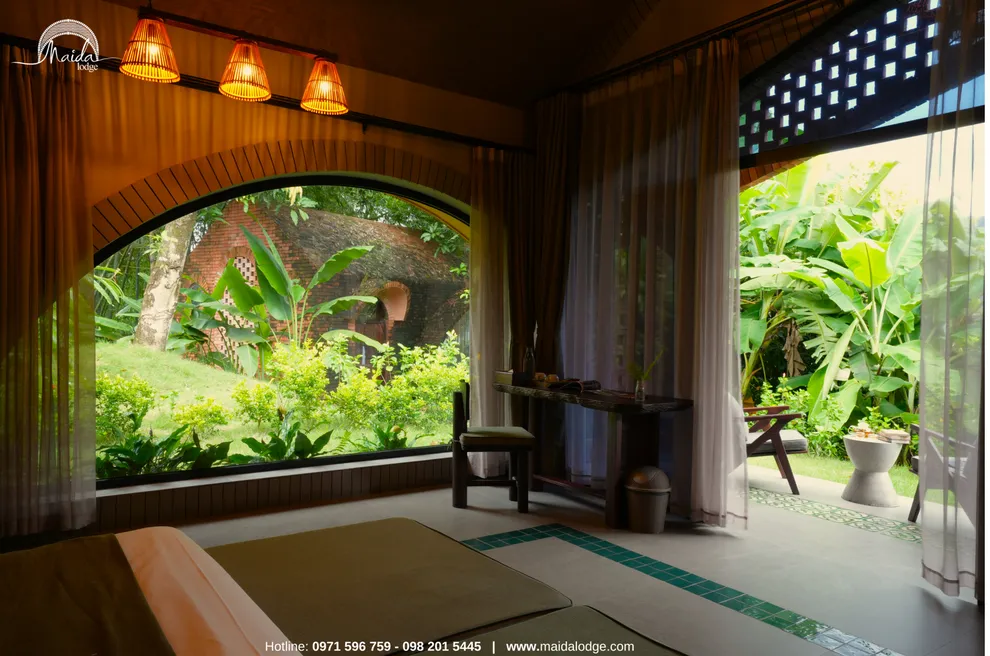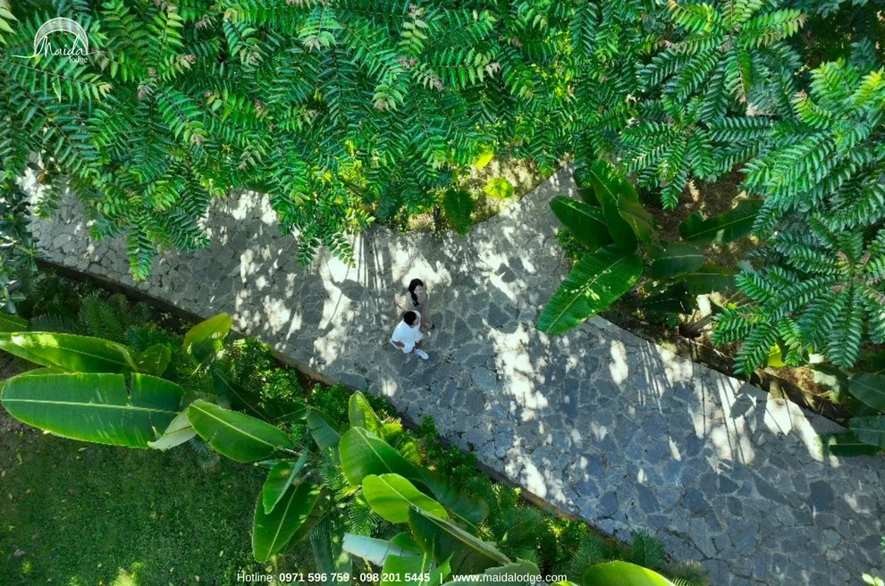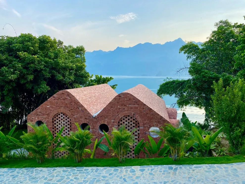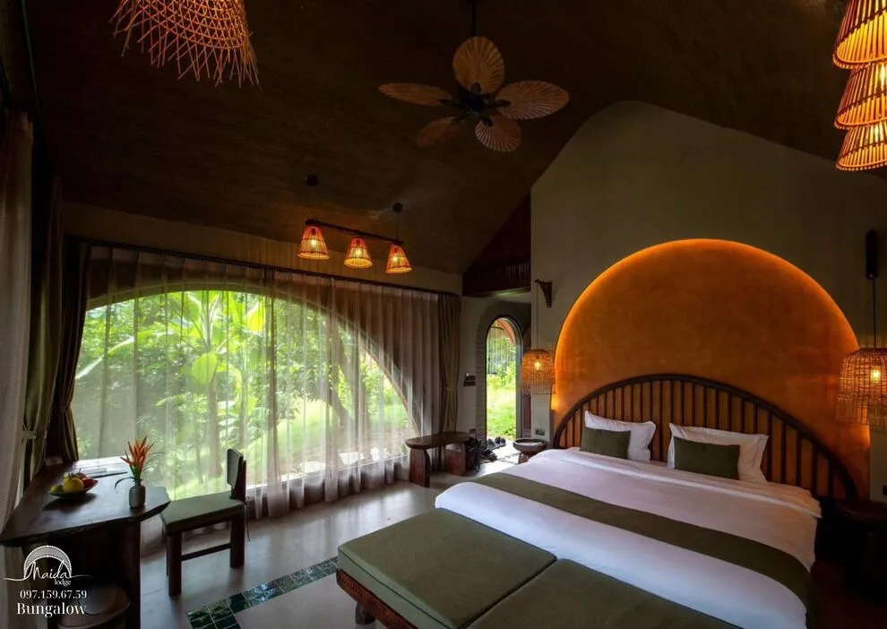 Tọa lạc tại xóm Đoàn Kết, xã Tiền Phong, huyện Đà Bắc, Maida Lodge cách trung tâm Hà Nội khoảng 120km, đủ xa để tạo nên một thế giới biệt lập nhưng cũng đủ gần cho những chuyến hành trình ngắn ngày. Kiến trúc nơi đây là sự giao thoa nhuần nhuyễn giữa phong cách mộc mạc và tinh tế, nổi bật với những mảng tường gạch đỏ trần ấm cúng. Những đường cong vòm cửa mềm mại kết hợp cùng mái nhà lượn sóng mô phỏng sinh động nhịp sóng của dòng Đà Giang, tạo nên một tổng thể hài hòa và sống động giữa màu xanh bạt ngàn của tre trúc.