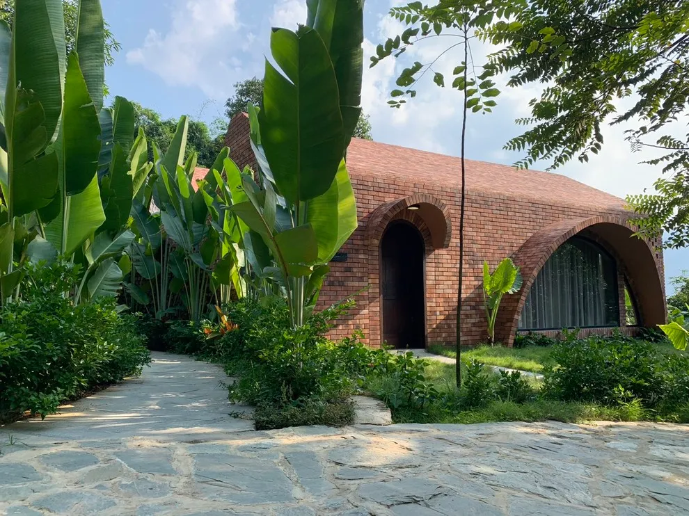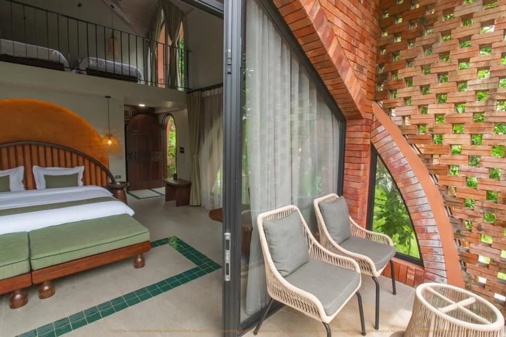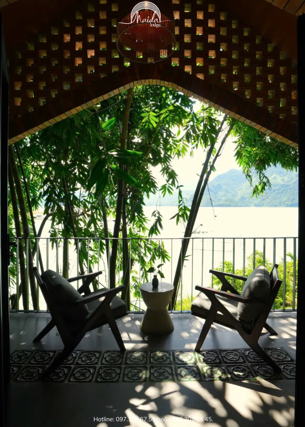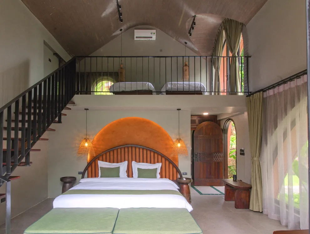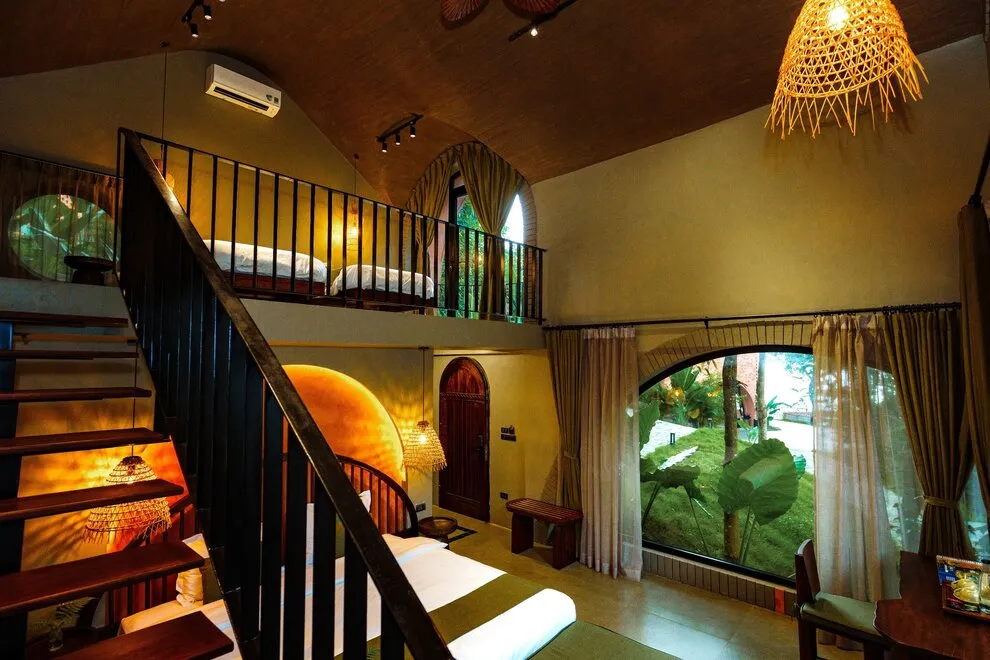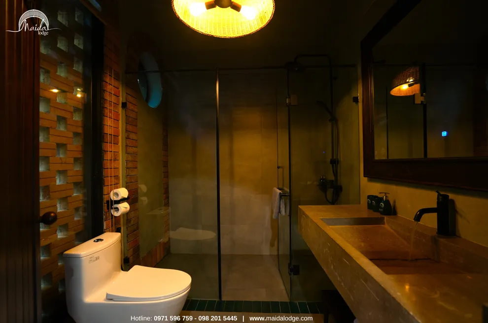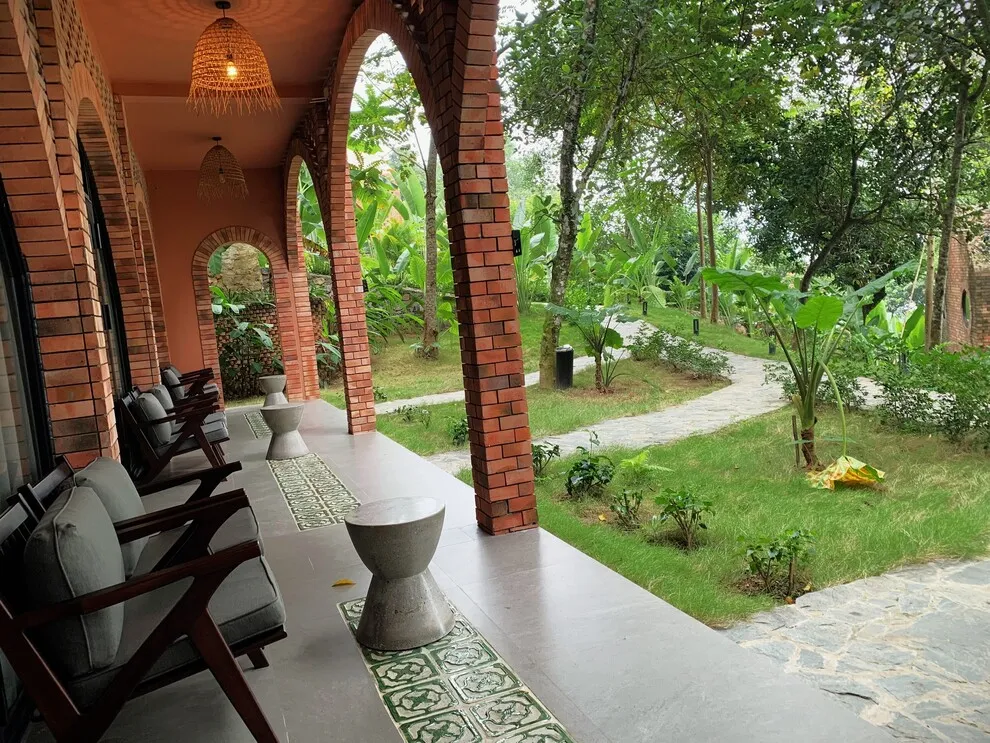 Tọa lạc tại xóm Đoàn Kết, xã Tiền Phong, huyện Đà Bắc, Maida Lodge cách trung tâm Hà Nội khoảng 120km, đủ xa để tạo nên một thế giới biệt lập nhưng cũng đủ gần cho những chuyến hành trình ngắn ngày. Kiến trúc nơi đây là sự giao thoa nhuần nhuyễn giữa phong cách mộc mạc và tinh tế, nổi bật với những mảng tường gạch đỏ trần ấm cúng. Những đường cong vòm cửa mềm mại kết hợp cùng mái nhà lượn sóng mô phỏng sinh động nhịp sóng của dòng Đà Giang, tạo nên một tổng thể hài hòa và sống động giữa màu xanh bạt ngàn của tre trúc.