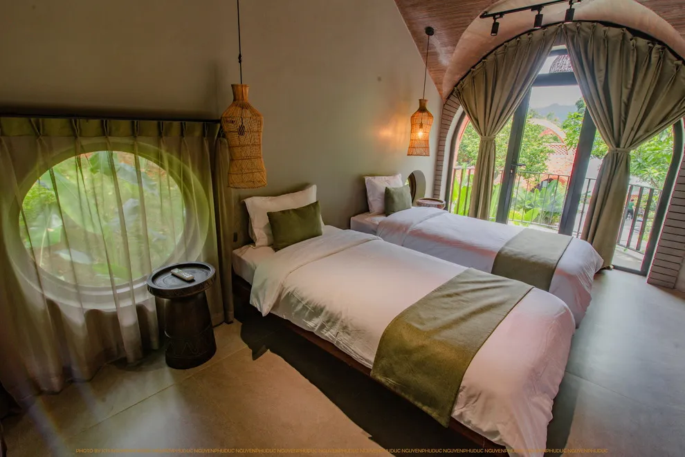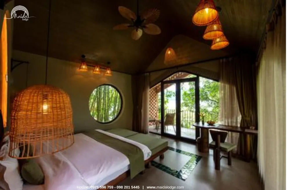 Hệ thống lưu trú tại đây bao gồm 17 đơn vị phòng nghỉ, trong đó có 11 căn bungalow biệt lập và 6 phòng khách sạn tiện nghi. Mỗi phòng đều sở hữu ban công riêng với tầm nhìn bao la hướng ra mặt hồ Hòa Bình và những dãy núi đá vôi trùng điệp, cho phép du khách tận hưởng sự yên bình mỗi sớm mai hay vẻ đẹp lãng mạn lúc chiều tà. Khi nghỉ dưỡng tại đây, du khách sẽ được tận hưởng các tiện ích đi kèm như bữa sáng đa dạng, trà cafe trong phòng và đặc biệt là quyền lợi sử dụng bể bơi vô cực hiện đại.