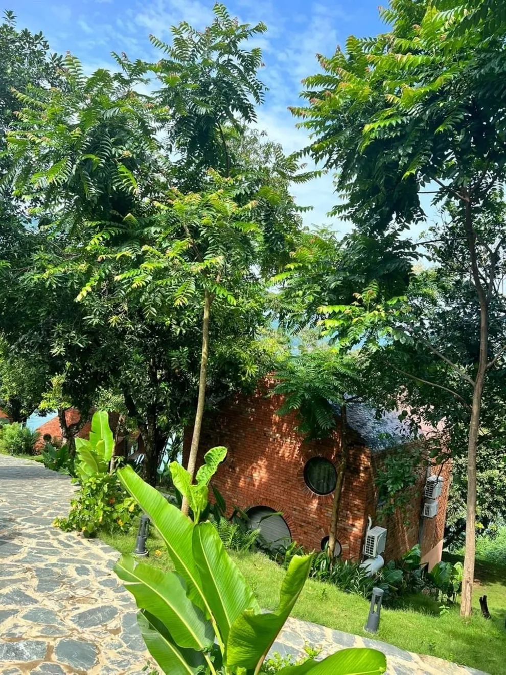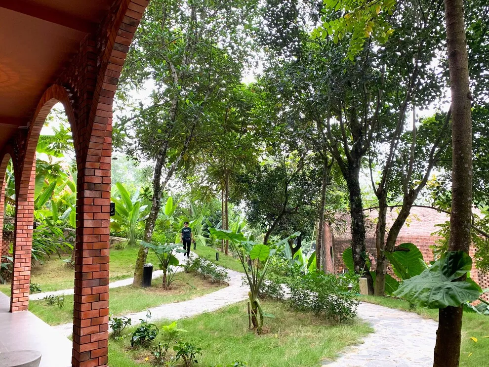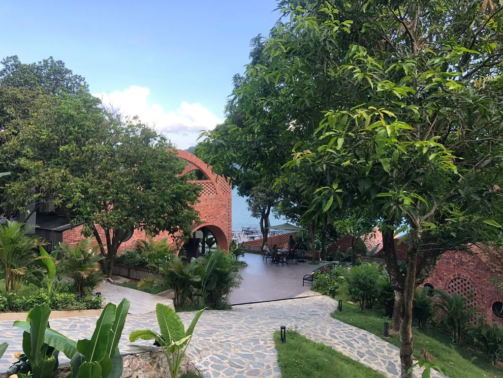 Địa hình: Kiến trúc của resort có nhiều lối đi nhỏ, uốn lượn dưới bóng cây và các bậc thang dẫn ra khu vực ven hồ.