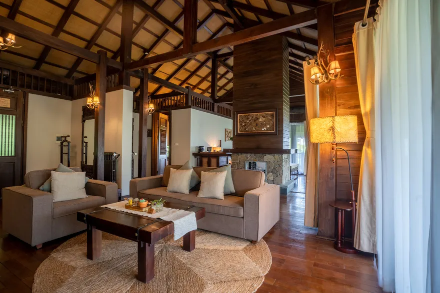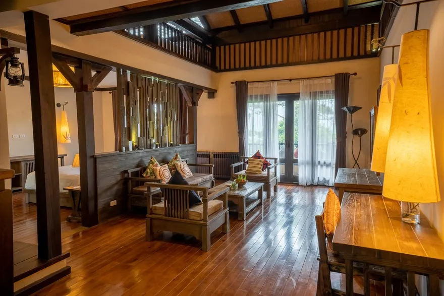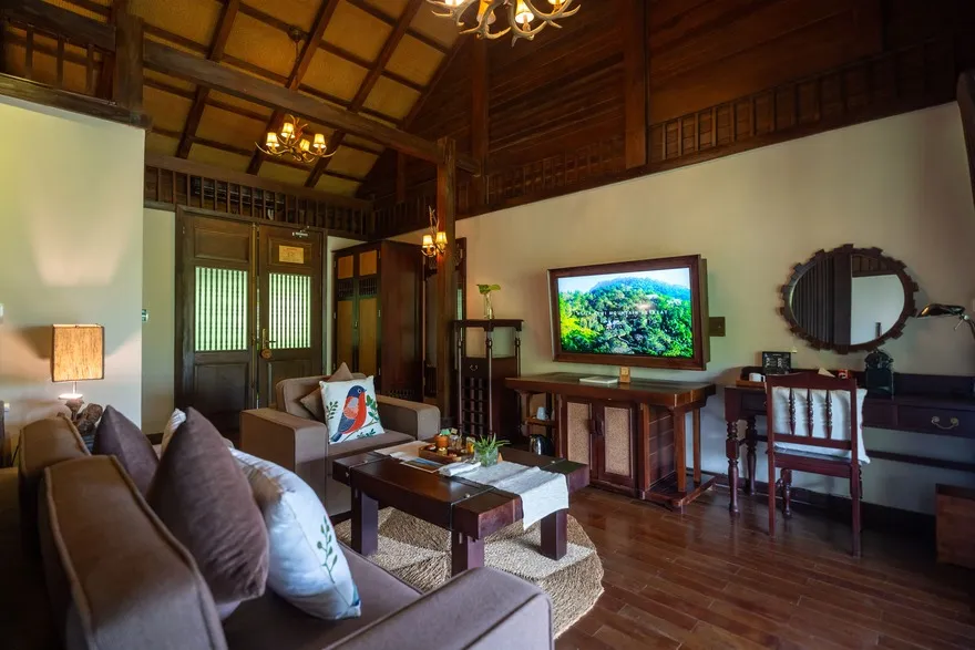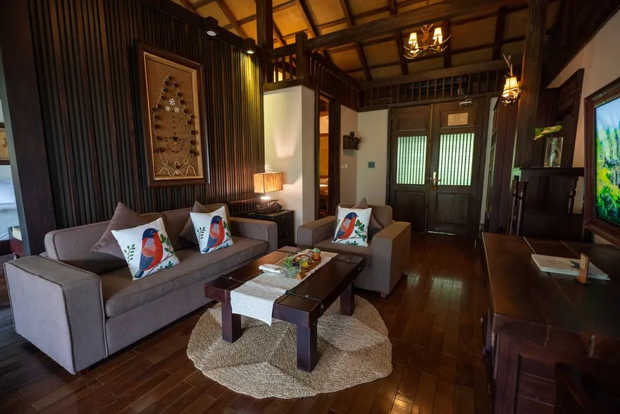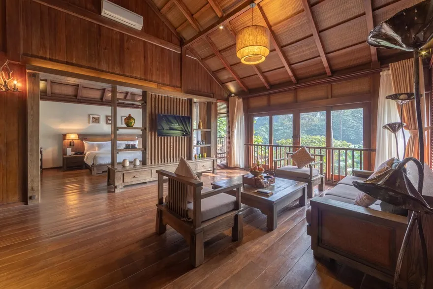 Sức hút đặc biệt của nơi này nằm ở việc tận dụng khéo léo những tàn tích lịch sử, khi các công trình hiện đại được xây dựng trực tiếp trên nền móng cũ của các biệt thự và khu quân sự Pháp từ những năm 1940. Những điểm nhấn như Nhà thờ cổ không mái tại cốt 800, các đường hầm chỉ huy hay bãi đáp trực thăng cũ đã biến khu nghỉ dưỡng thành một “bảo tàng sống” giữa rừng già. Thiết kế nội thất ưu tiên sử dụng gỗ Địa Trung Hải, đá tự nhiên và không gian mở với những ô cửa kính lớn để đưa thiên nhiên tràn ngập vào từng ngõ ngách.