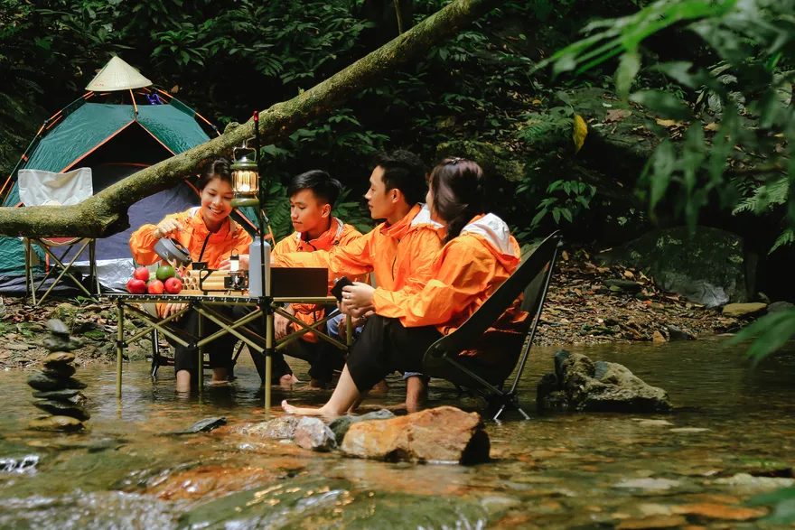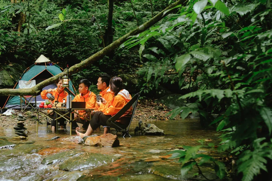 Suối Ngọc Hoa: Dòng suối thơ mộng gắn liền với truyền thuyết về con gái Vua Hùng, nằm trong lộ trình trekking rừng tre ngay tại sảnh.