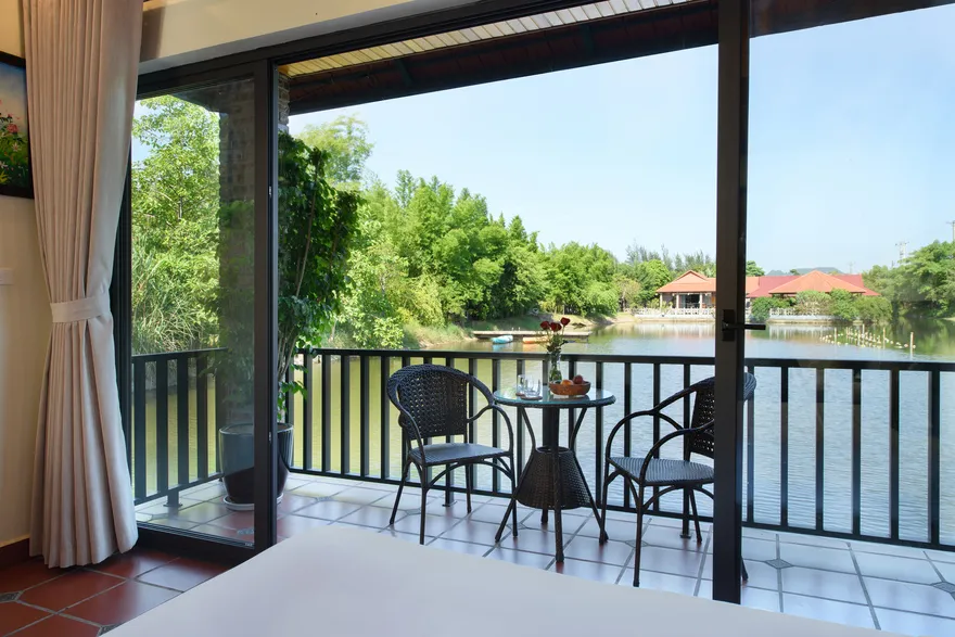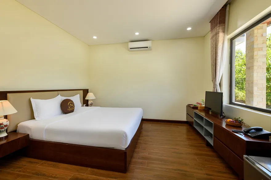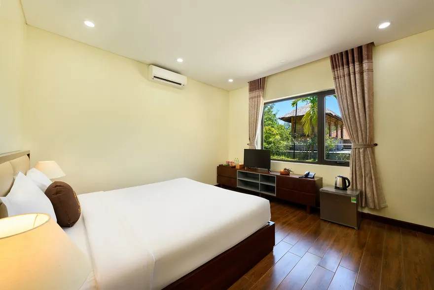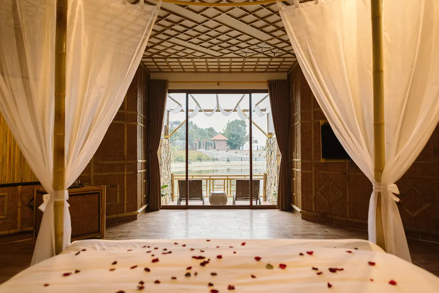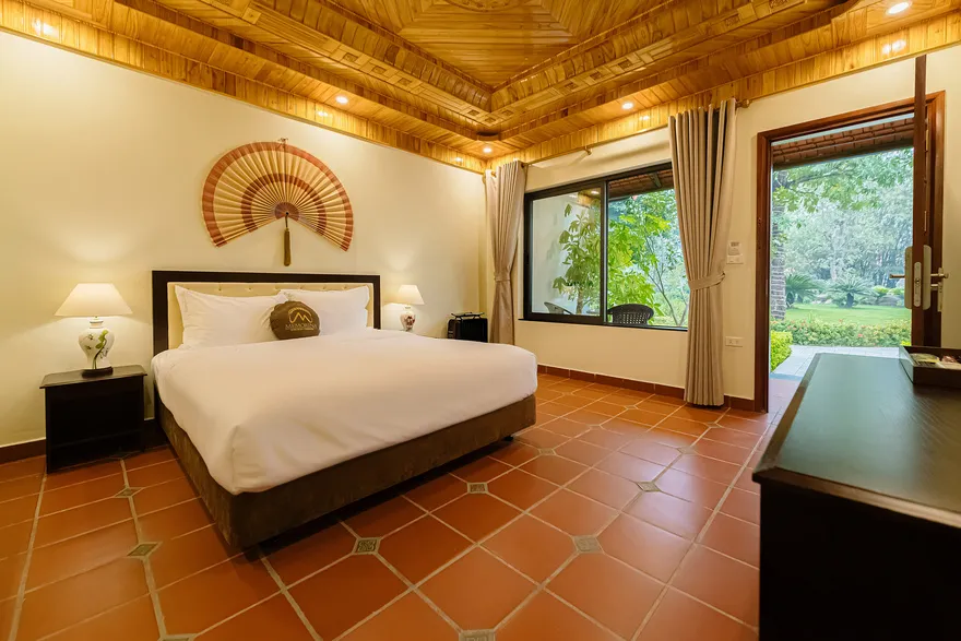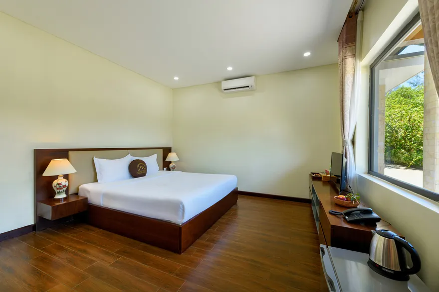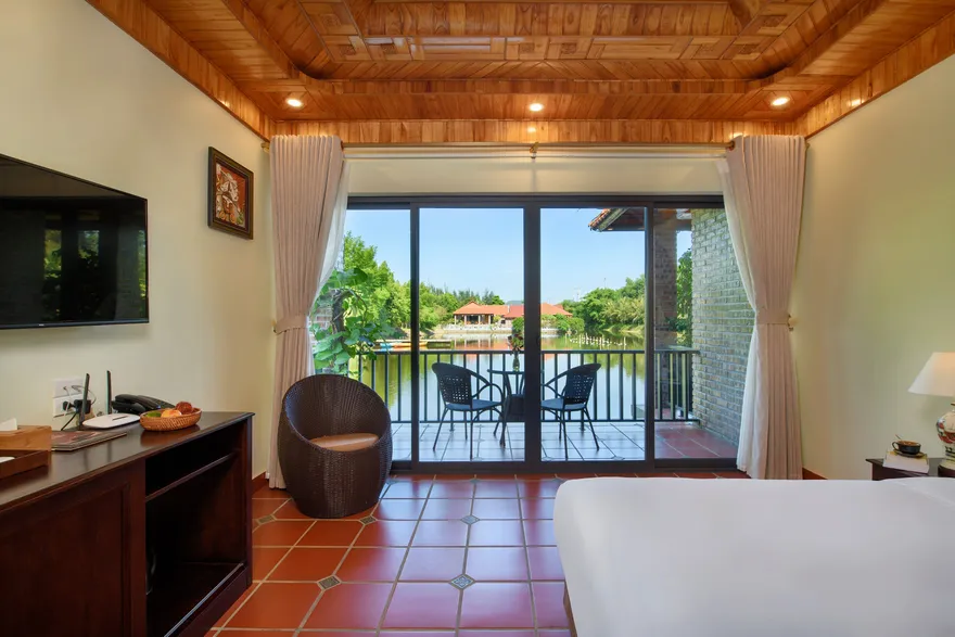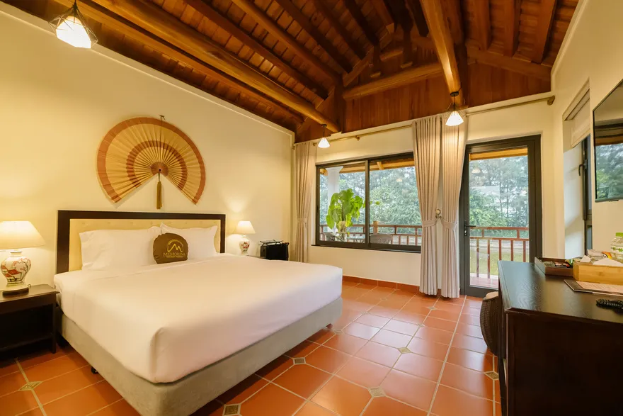 Về hệ thống lưu trú, resort sở hữu tổng cộng 32 phòng nghỉ đa dạng từ các hạng phòng khách sạn tiêu chuẩn đến các bungalow và biệt thự nguyên căn. Các hạng phòng như Deluxe Garden View, Senior Deluxe Lake View hay các căn Suite và Villa đều được trang bị đầy đủ tiện nghi đạt chuẩn 4 sao như điều hòa hai chiều, wifi tốc độ cao và minibar. Tầm nhìn hướng hồ được đánh giá là một trong những giá trị gia tăng lớn nhất, tạo ra một không gian tĩnh lặng tuyệt đối cho việc nghỉ ngơi, trong khi các hạng phòng cao cấp hơn còn sở hữu phòng khách riêng hoặc ban công rộng với tầm nhìn panorama toàn cảnh.