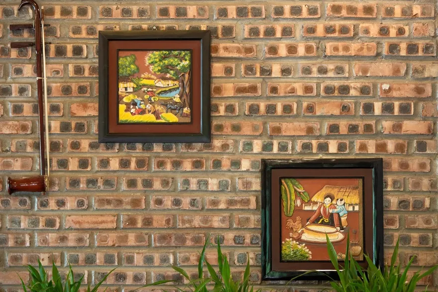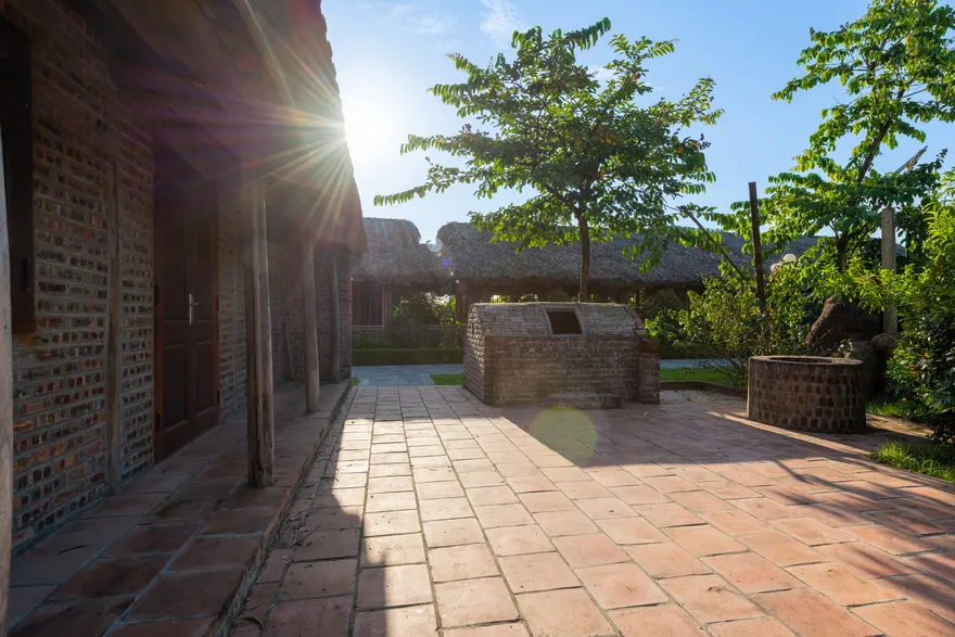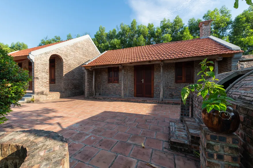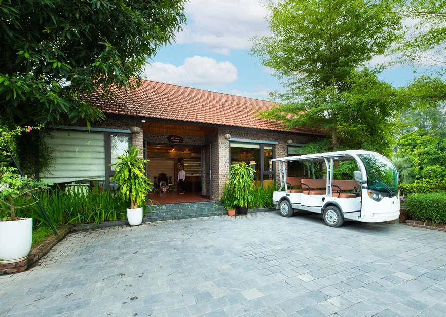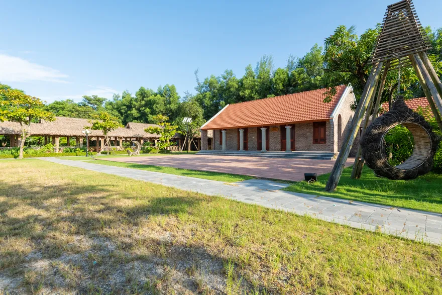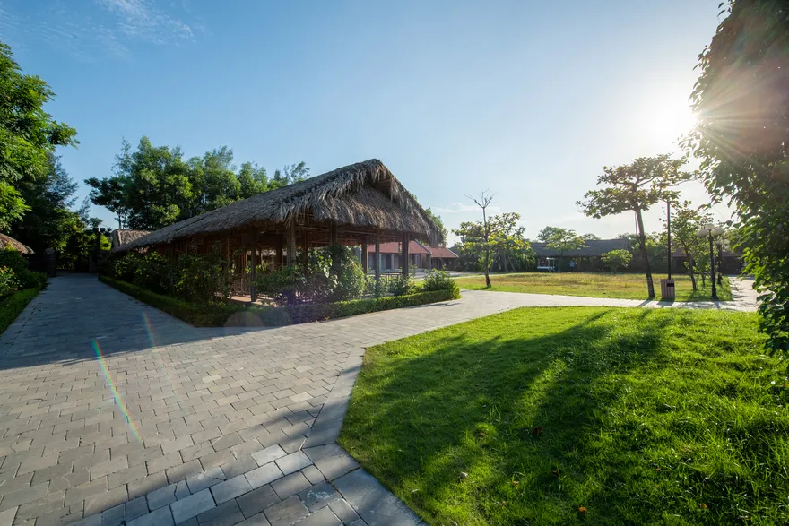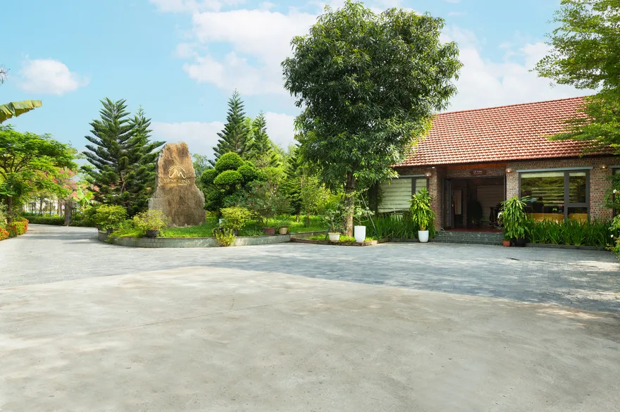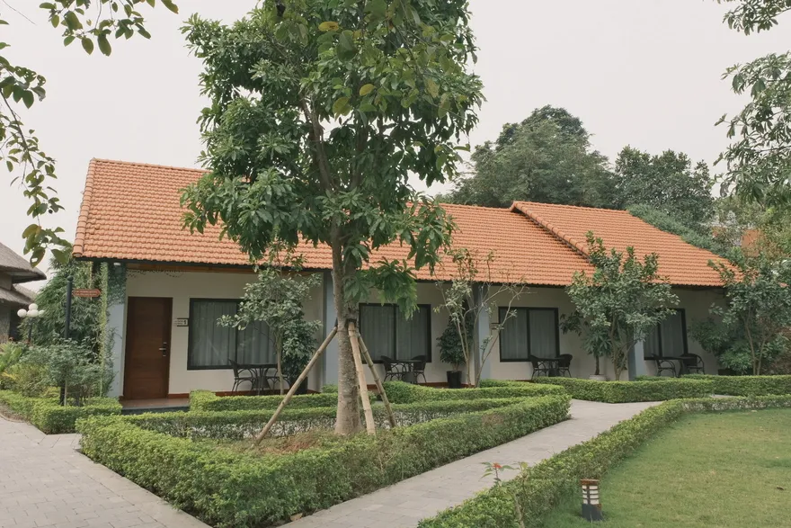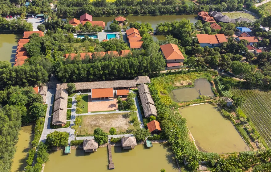 Kiến trúc của resort là một nỗ lực tái hiện sâu sắc không gian làng quê đồng bằng Bắc Bộ thông qua việc sử dụng các vật liệu truyền thống như mái ngói đỏ, sàn gạch nung, tường gạch mộc và nội thất bằng tre, gỗ lim. Không gian mở với diện tích trải nghiệm lên tới 5.000 $m^2$ bao gồm các tiểu cảnh đặc trưng như giếng nước, sân đình và hồ nước bao quanh, làm mờ đi ranh giới giữa một cơ sở lưu trú cao cấp và một ngôi làng nông thôn thực thụ. Sự kết hợp giữa kiến trúc dân gian và các tiện ích hiện đại như hồ bơi vô cực đã tạo ra một sự đối lập thú vị, đáp ứng nhu cầu hưởng thụ nhưng không làm mất đi hồn cốt của một farmstay.