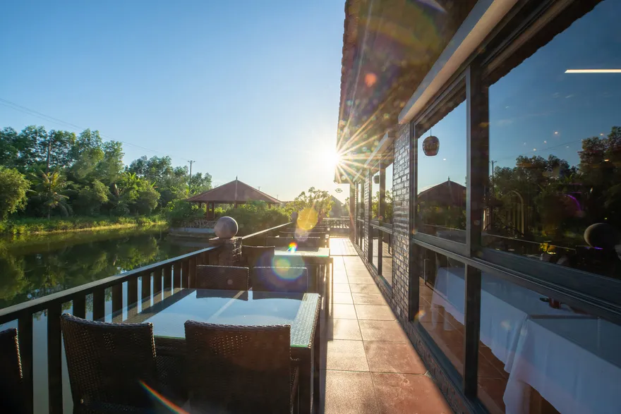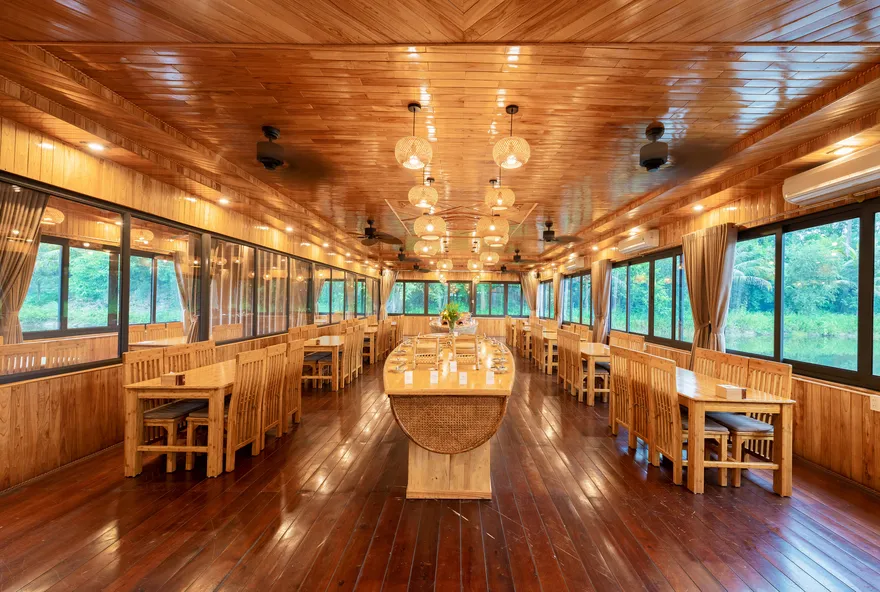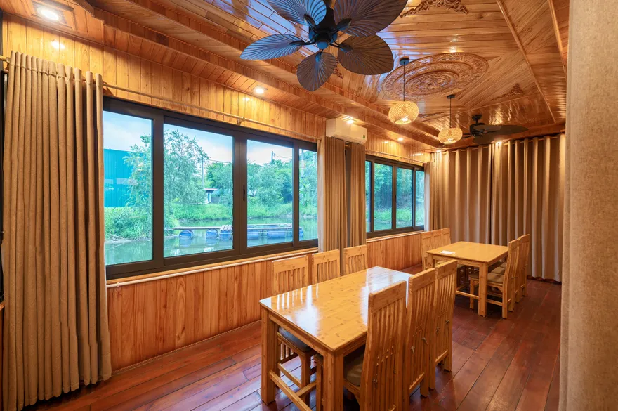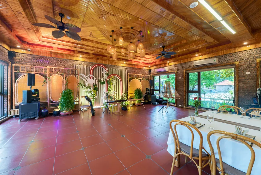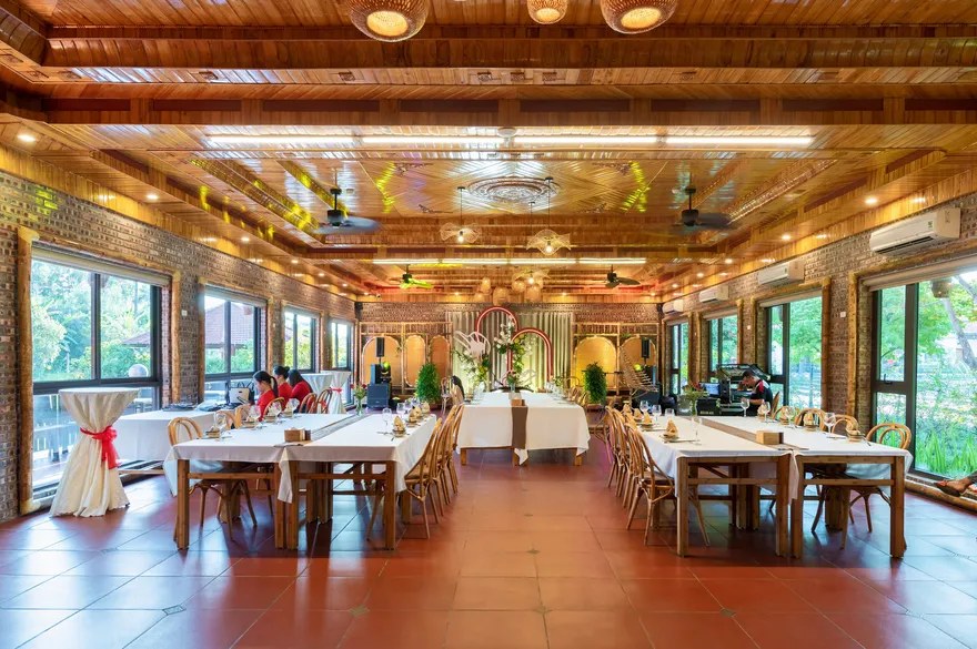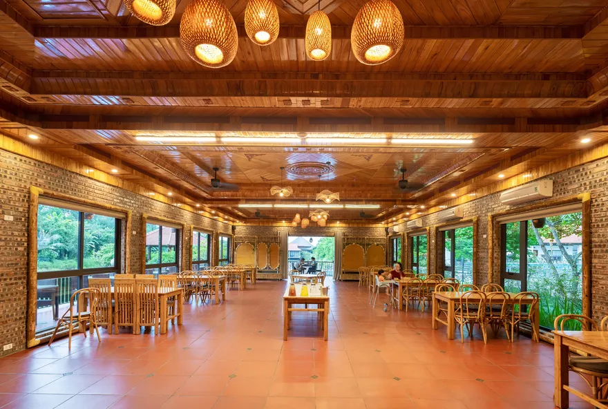 Hệ thống nhà hàng tại đây thực hiện nghiêm ngặt triết lý “Từ trang trại đến bàn ăn”, sử dụng nguyên liệu thu hoạch trực tiếp từ khu nông trại hữu cơ nội khu để đảm bảo độ tươi ngon và an toàn. Thực đơn là một bản giao hưởng của các đặc sản Ninh Bình như thịt dê núi Nho Quan, cơm cháy cố đô, gà đồi và gỏi cá nhệch. Ngoài ra, khách lưu trú còn được tận hưởng nhiều đặc quyền miễn phí như sử dụng phòng tập thể dục, khu vui chơi trẻ em, hồ bơi ngoài trời và xe đạp nội khu để tham quan không gian xanh của resort.