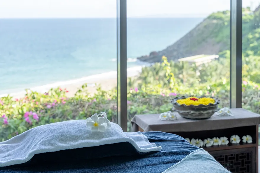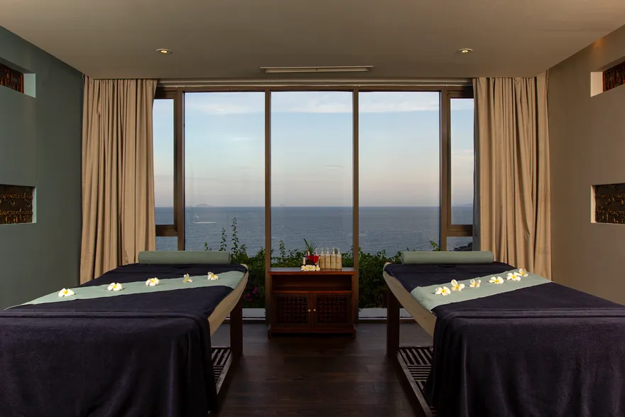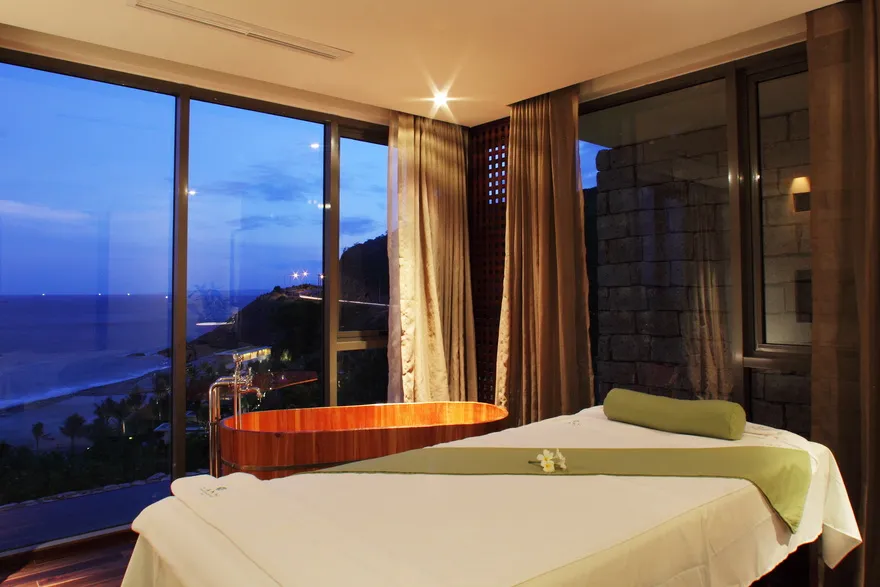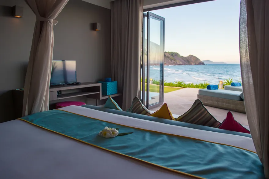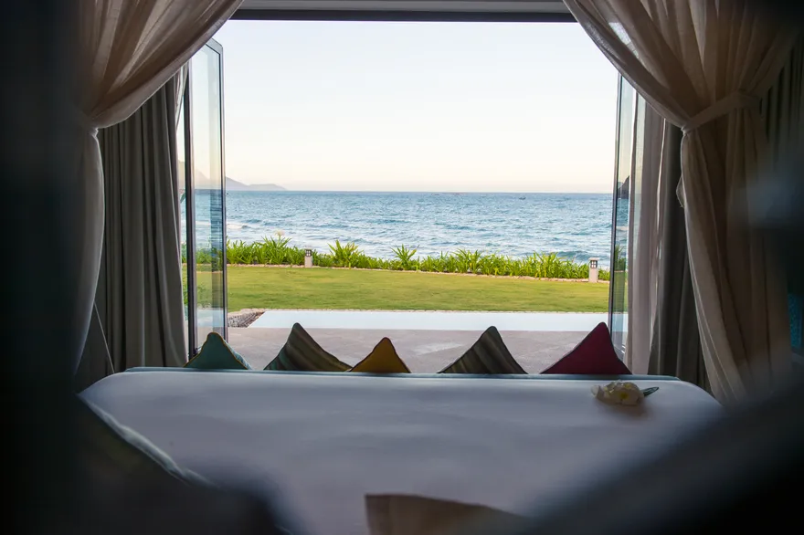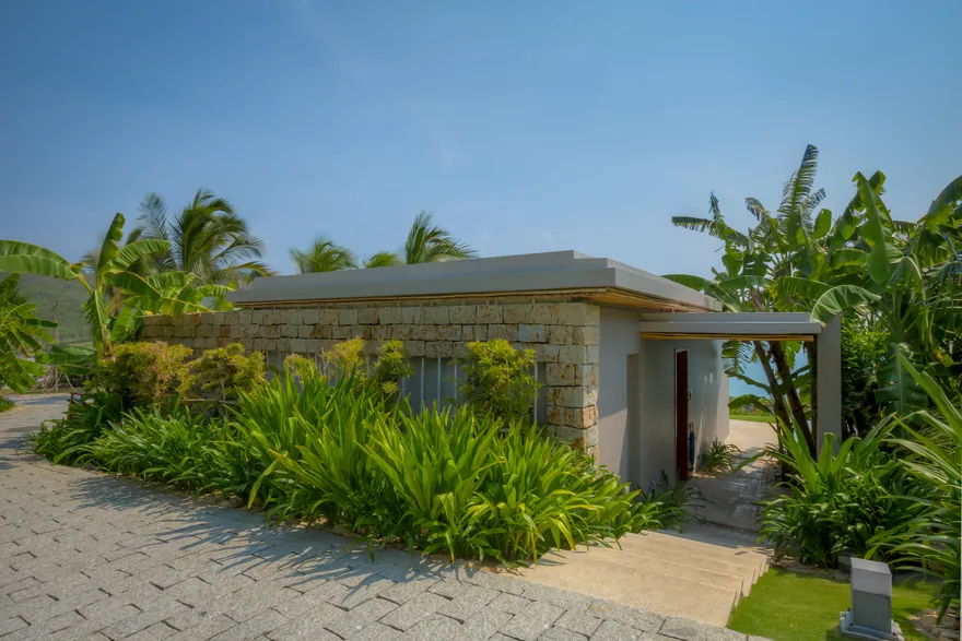 Về vị trí, resort sở hữu một “tọa độ vàng” khi tọa lạc tại Bãi Đông, thuộc xã Cam Hải Đông, huyện Cam Lâm. Đây là một không gian độc bản, nơi khu nghỉ dưỡng nằm ẩn mình giữa những vách đá hùng vĩ và bờ cát mịn màng, tạo nên một ranh giới tự nhiên tách biệt hoàn toàn với sự náo nhiệt bên ngoài. Sự biệt lập này không chỉ mang lại vẻ đẹp hoang sơ mà còn giúp khách lưu trú tận hưởng không gian riêng tư tuyệt đối để tái tạo năng lượng. Để đảm bảo sự thuận tiện tối đa, resort vẫn cung cấp các giải pháp kết nối linh hoạt như dịch vụ xe buýt đưa đón miễn phí theo lịch trình cố định hàng ngày, giúp hành trình khám phá của du khách luôn được liền mạch và thoải mái.