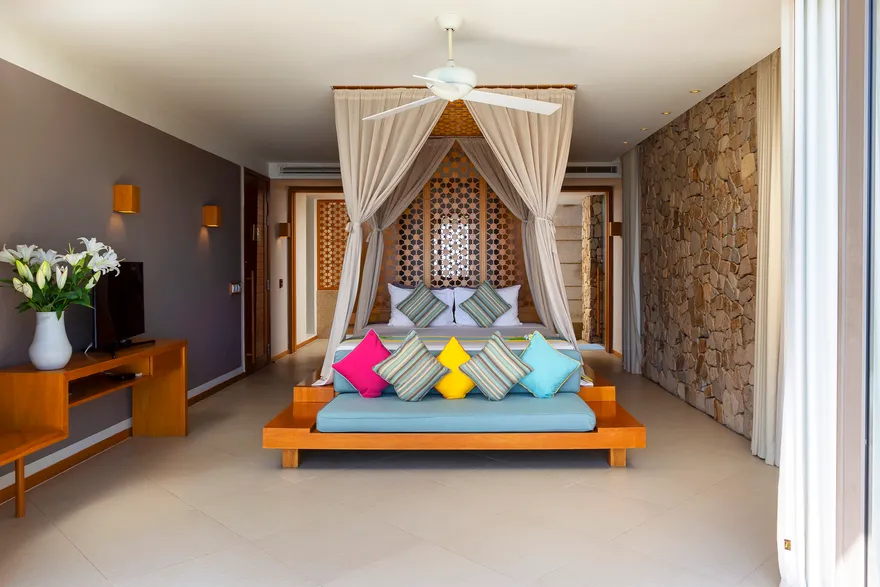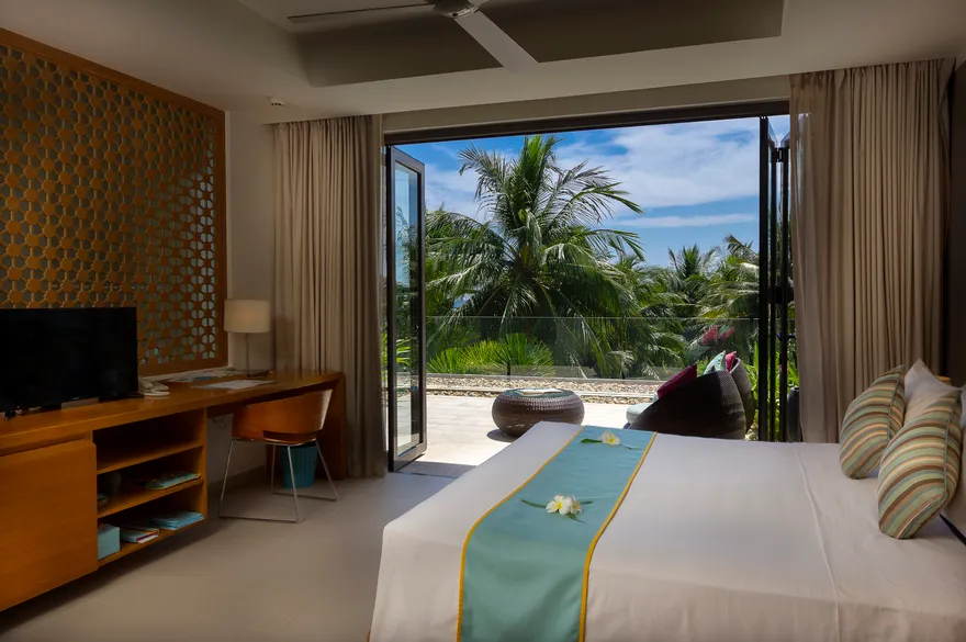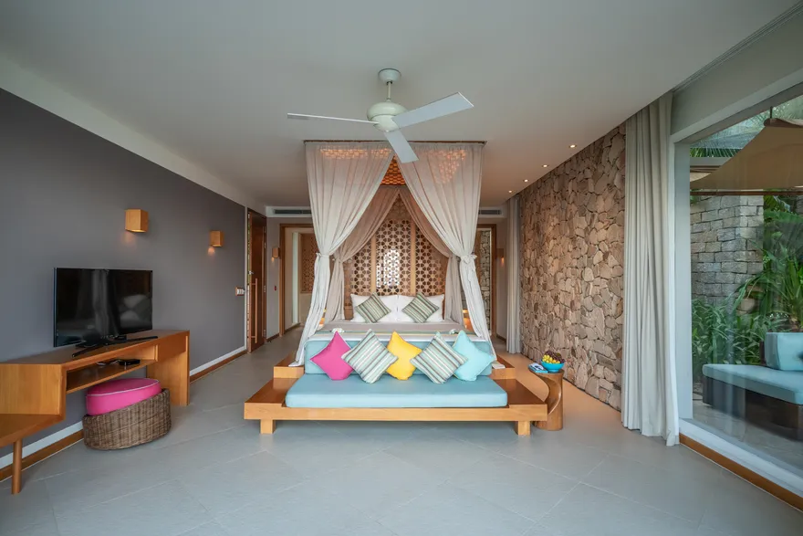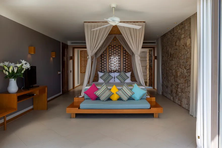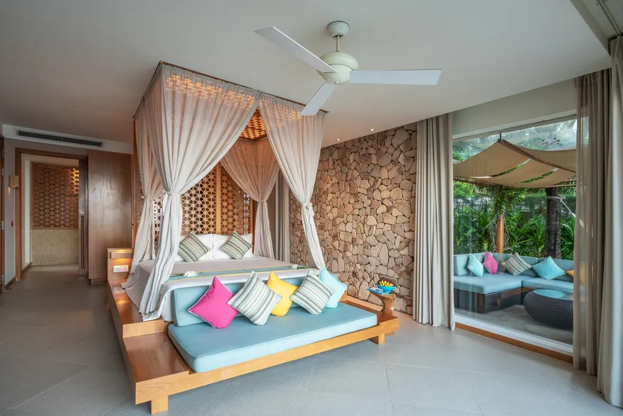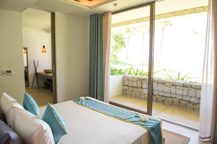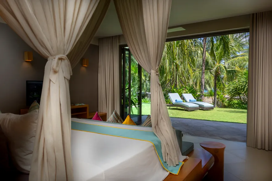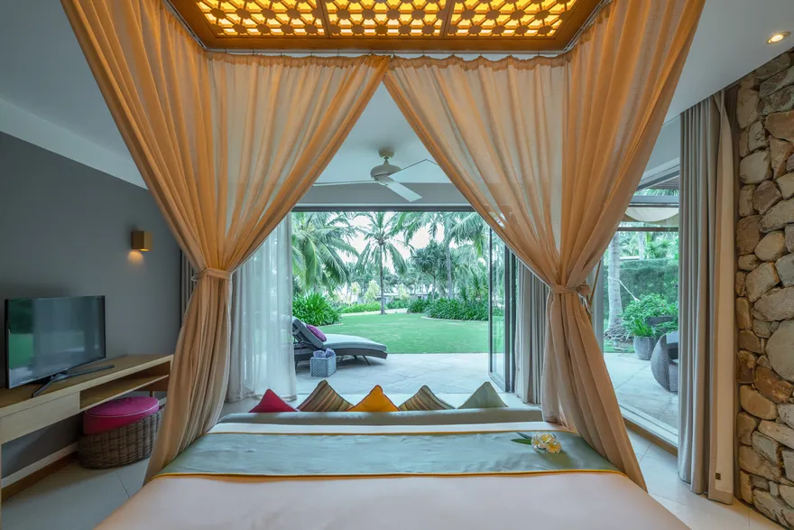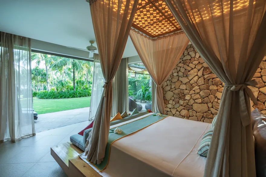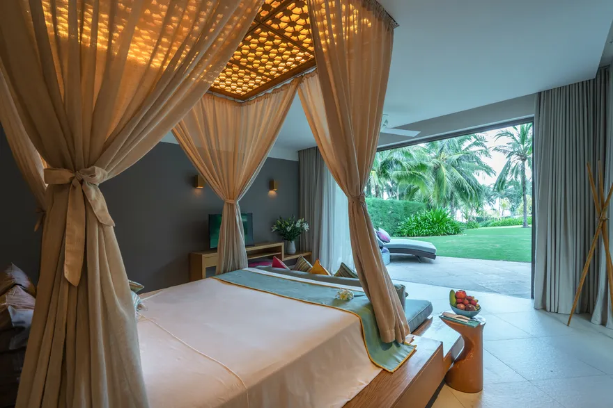 Các căn Garden và Ocean View Condo là lựa chọn lý tưởng cho những ai yêu thích sự tinh tế và tiện nghi chuẩn 5 sao. Điểm nhấn của hạng phòng này chính là thiết kế giường bốn trụ hiện đại mang phong cách hoàng gia và khu vực phòng tắm có vòi sen ngoài trời độc đáo, cho phép du khách tận hưởng sự tự do và hòa mình vào thiên nhiên ngay trong không gian riêng tư.