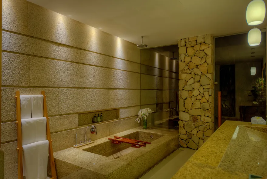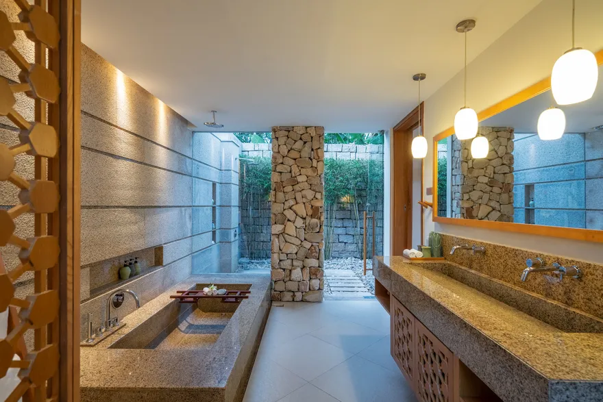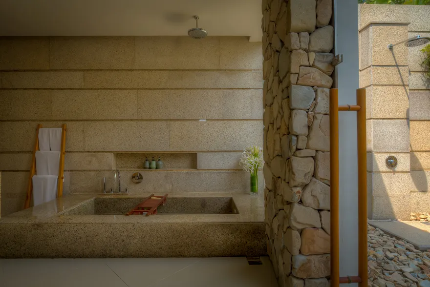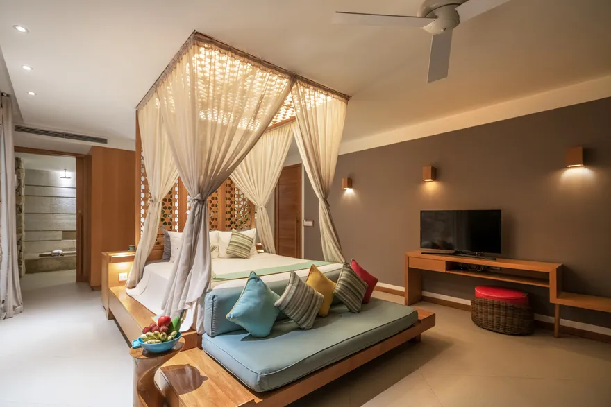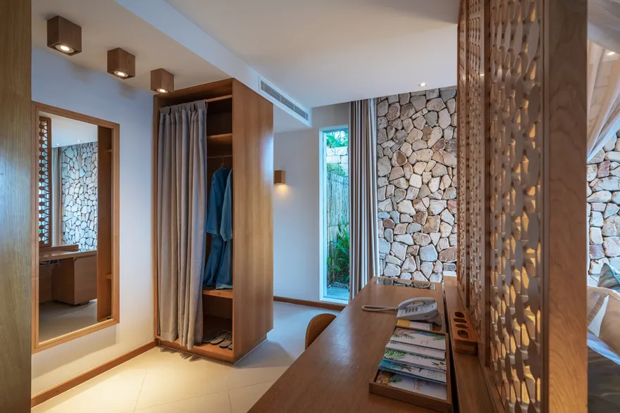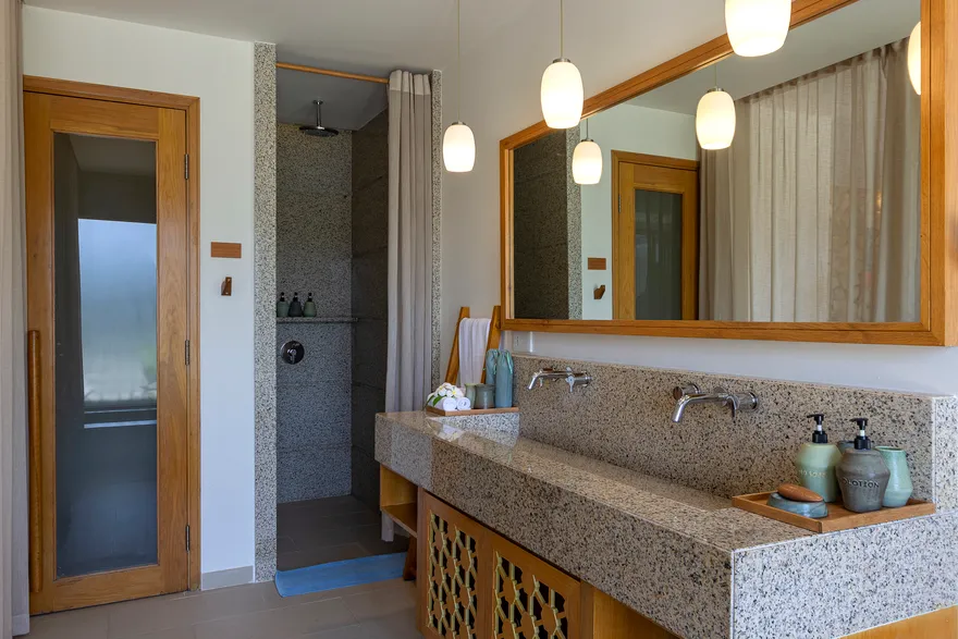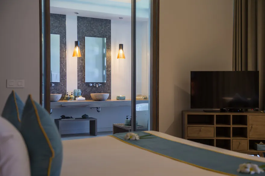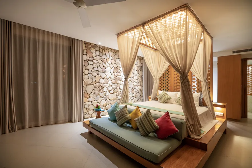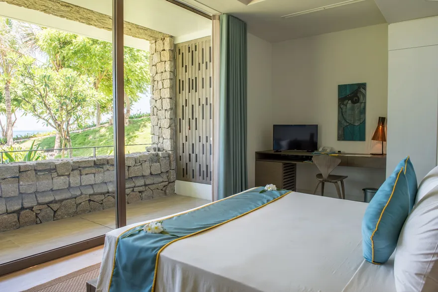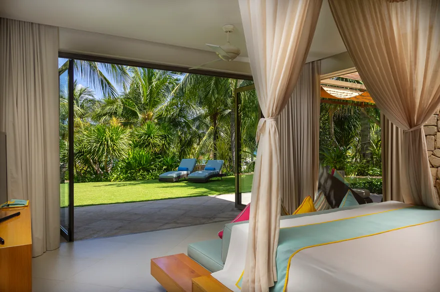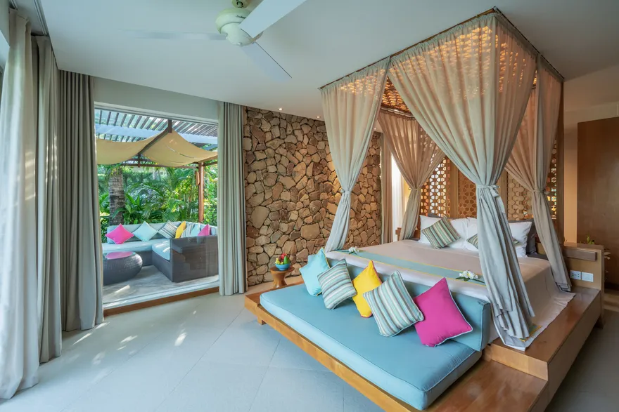 Các căn Garden và Ocean View Condo là lựa chọn lý tưởng cho những ai yêu thích sự tinh tế và tiện nghi chuẩn 5 sao. Điểm nhấn của hạng phòng này chính là thiết kế giường bốn trụ hiện đại mang phong cách hoàng gia và khu vực phòng tắm có vòi sen ngoài trời độc đáo, cho phép du khách tận hưởng sự tự do và hòa mình vào thiên nhiên ngay trong không gian riêng tư.
