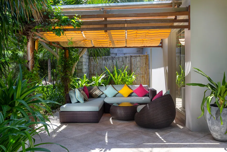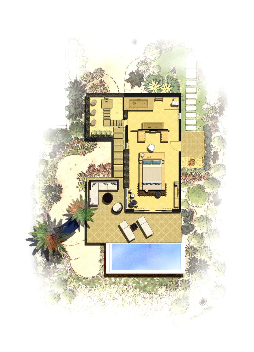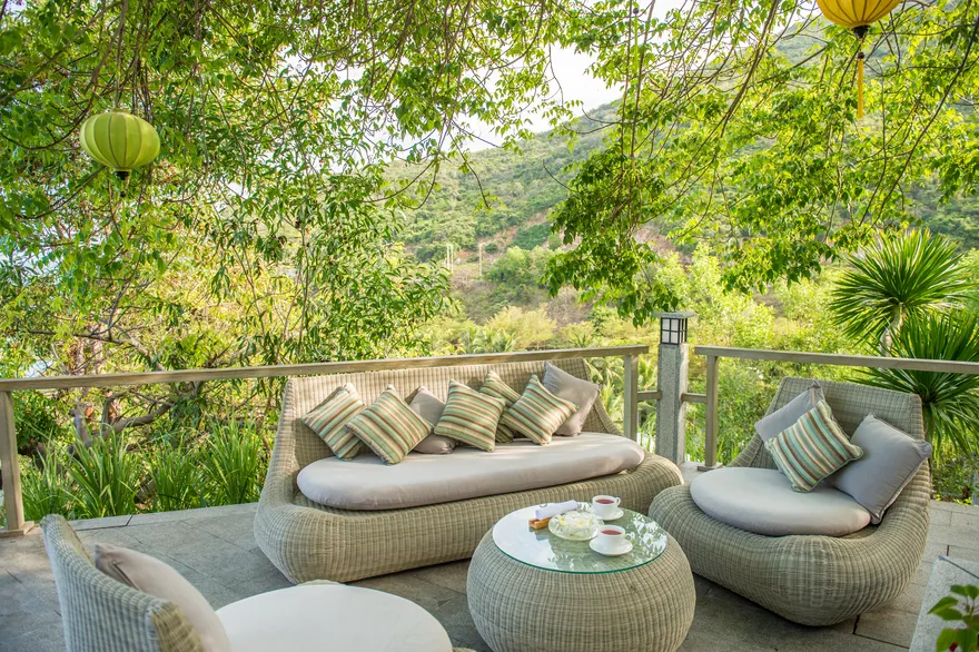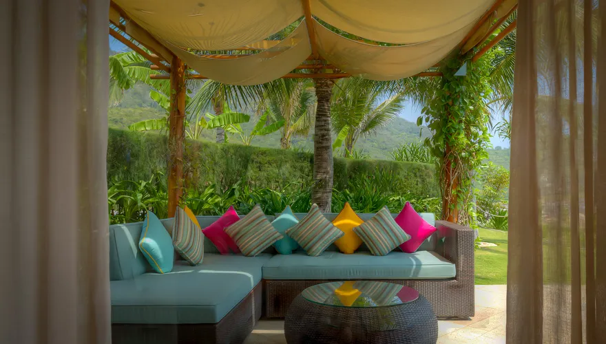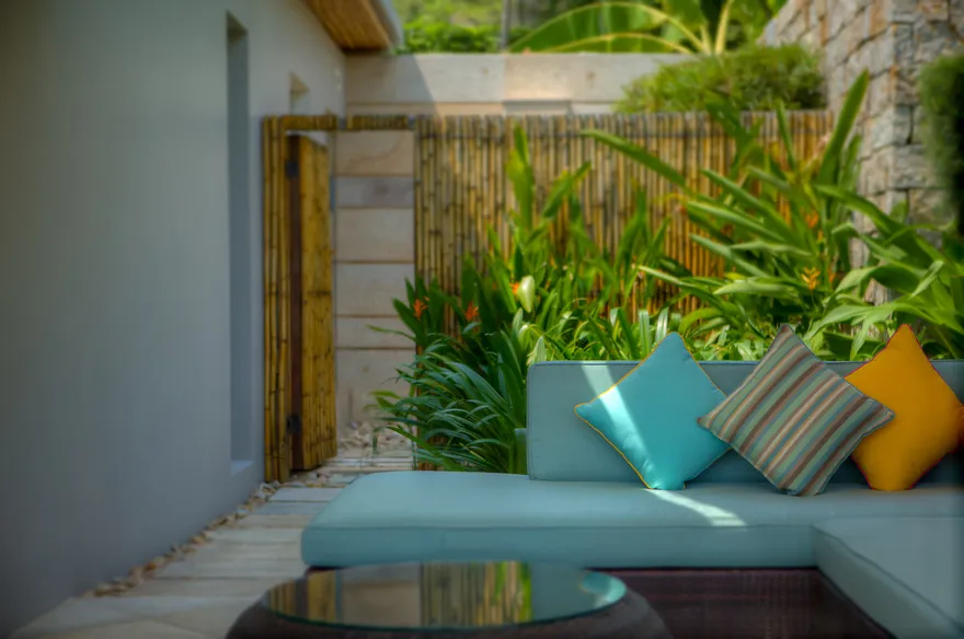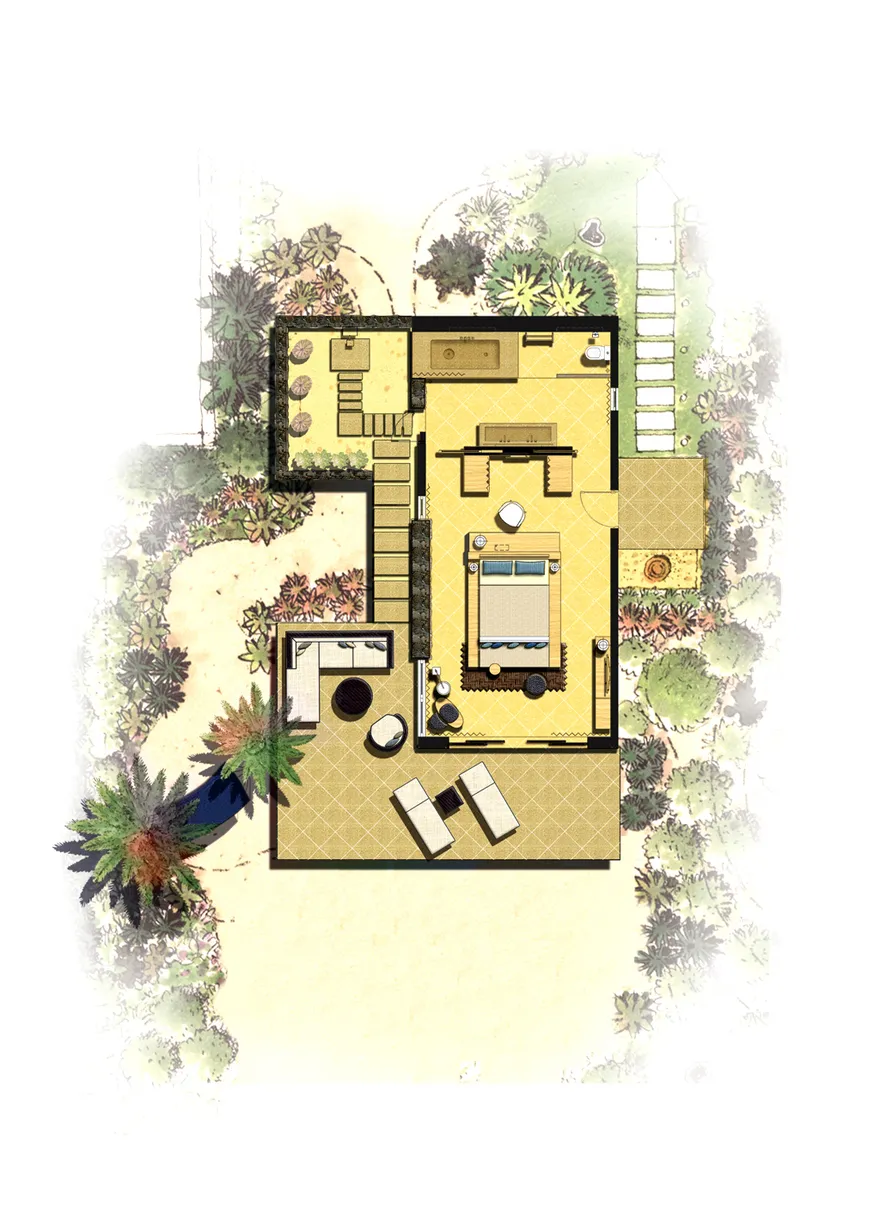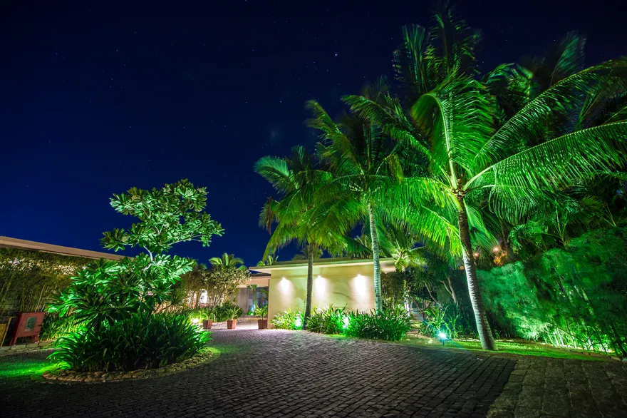 • Vườn nhiệt đới; nằm ẩn mình giữa các hàng dừa và hoa sứ.