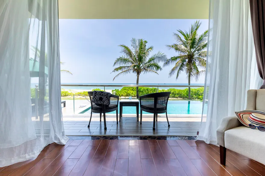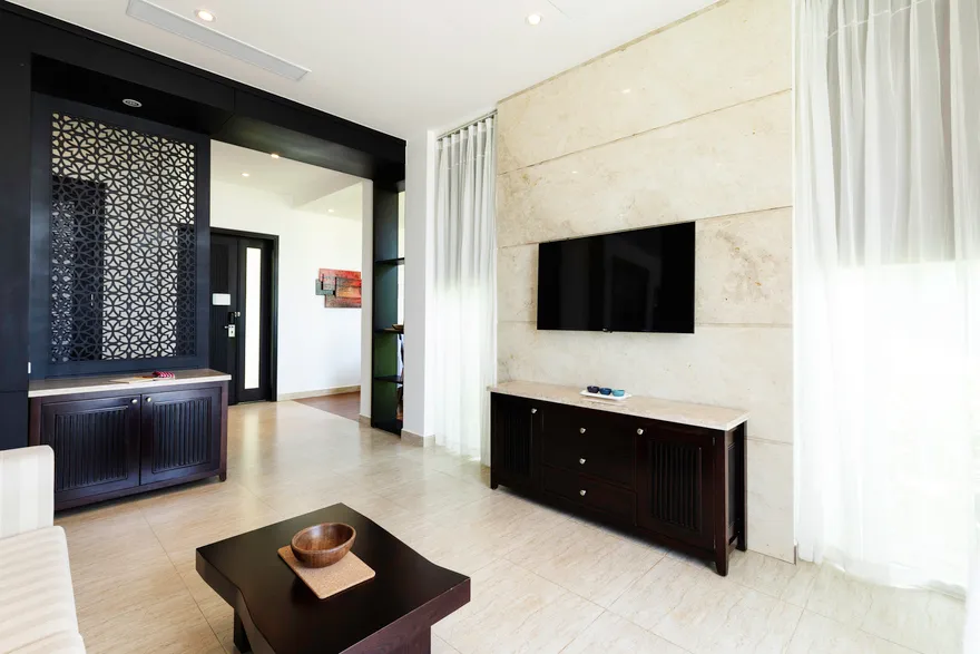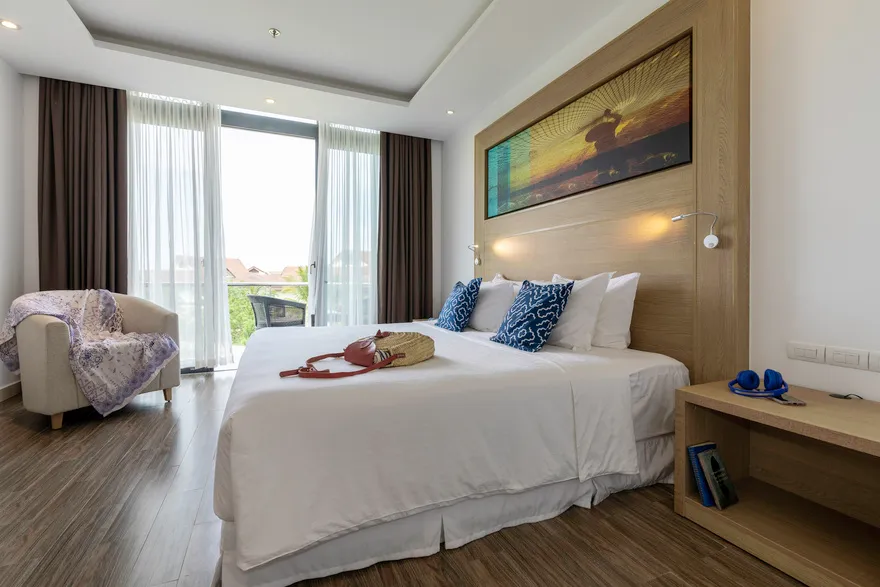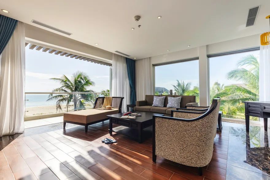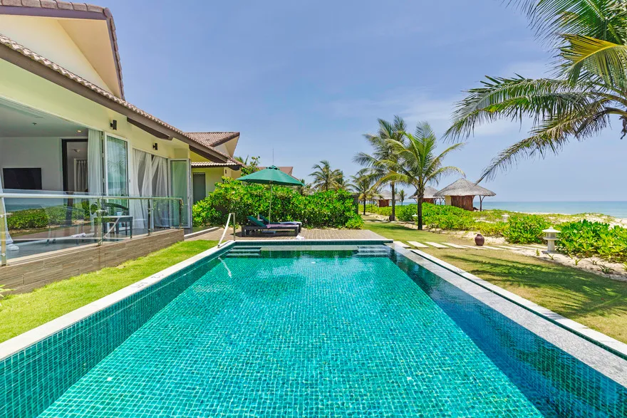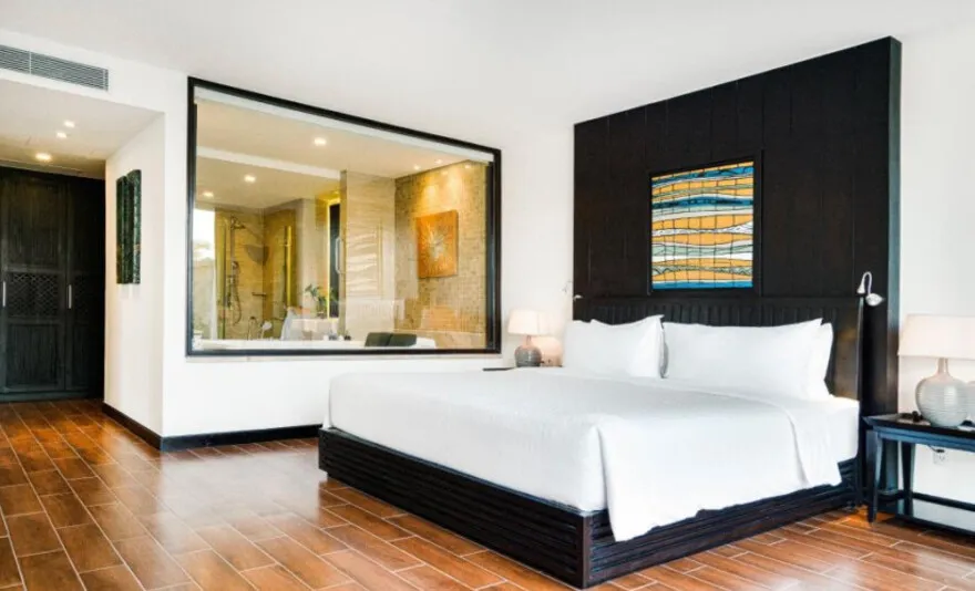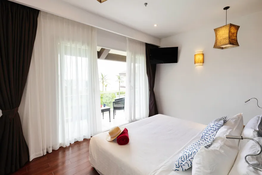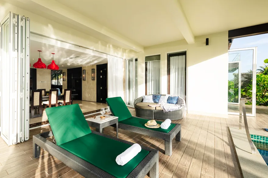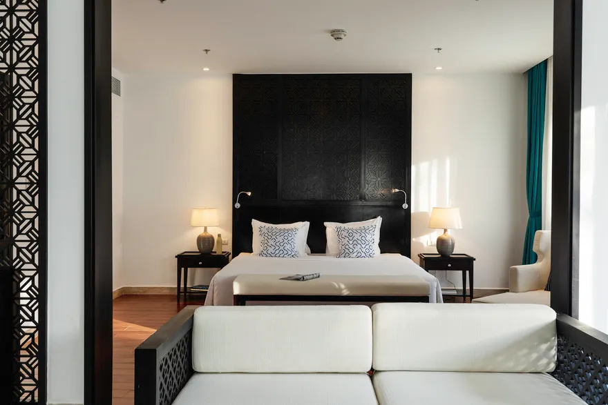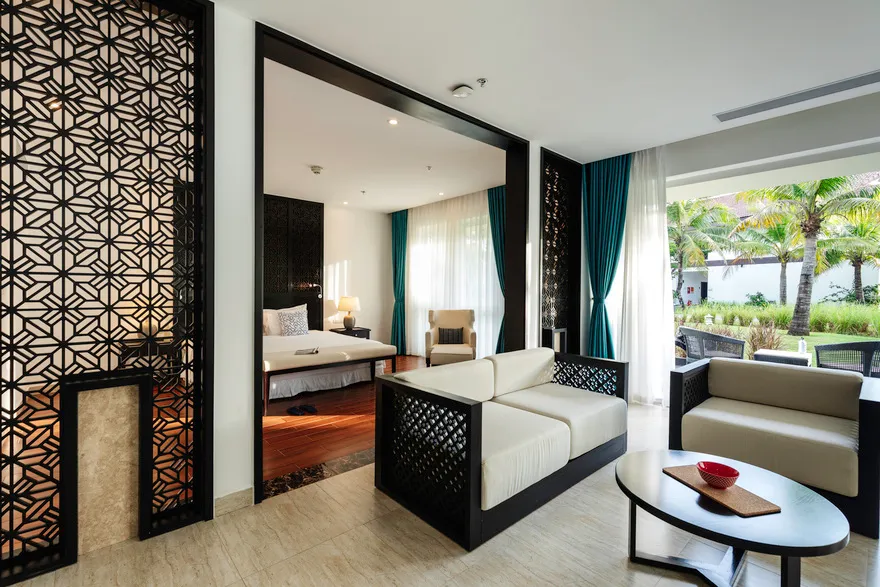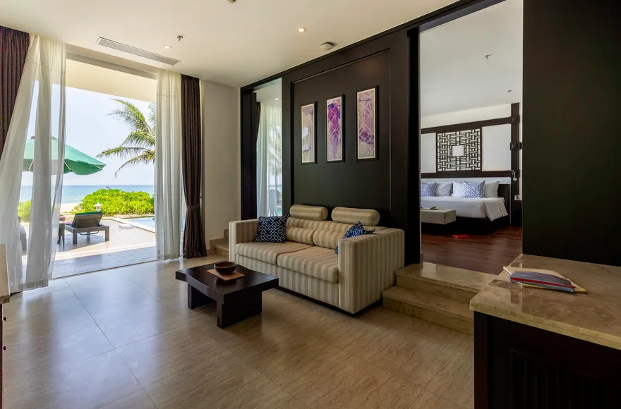 Hệ thống lưu trú tại đây là sự giao thoa hoàn hảo giữa thẩm mỹ tối giản hiện đại và các tiện nghi sang trọng. Du khách có thể lựa chọn hạng phòng Deluxe Double với thiết kế thanh lịch, ban công riêng nhìn ra vườn hoặc biển, hay trải nghiệm không gian rộng rãi của Deluxe Junior Suite với phòng khách biệt lập và bồn tắm tạo sóng hiện đại. Đối với những ai khao khát sự riêng tư tuyệt đối, hệ thống biệt thự sát biển là một lựa chọn thượng hạng. Những căn biệt thự một phòng ngủ sở hữu hồ bơi riêng và vòi sen ngoài trời độc đáo, trong khi biệt thự ba phòng ngủ với kiến trúc hai tầng bề thế là nơi lưu trú lý tưởng cho các gia đình lớn hoặc nhóm bạn. Mọi căn phòng đều được chú trọng tối đa vào chất lượng giấc ngủ thông qua hệ thống rèm cản sáng và cách âm chuyên nghiệp, giúp du khách luôn thức dậy với tâm thế sảng khoái nhất.