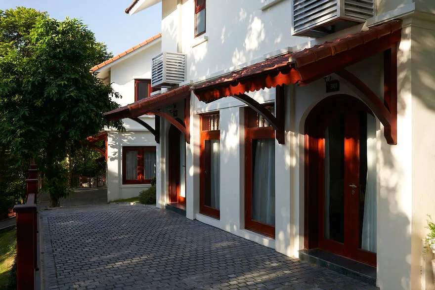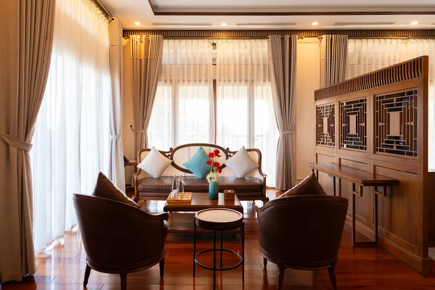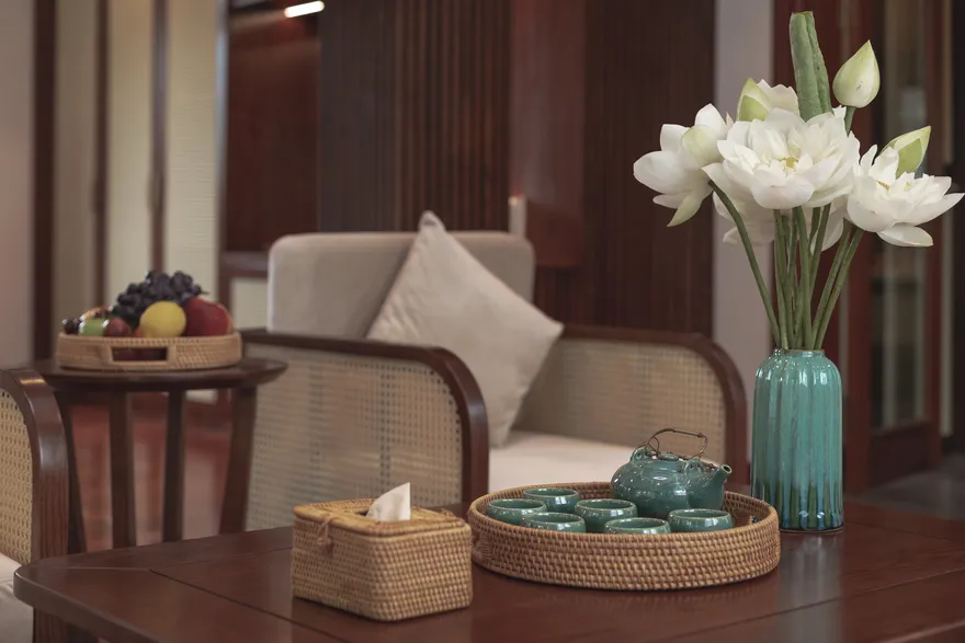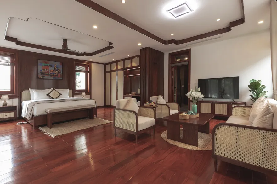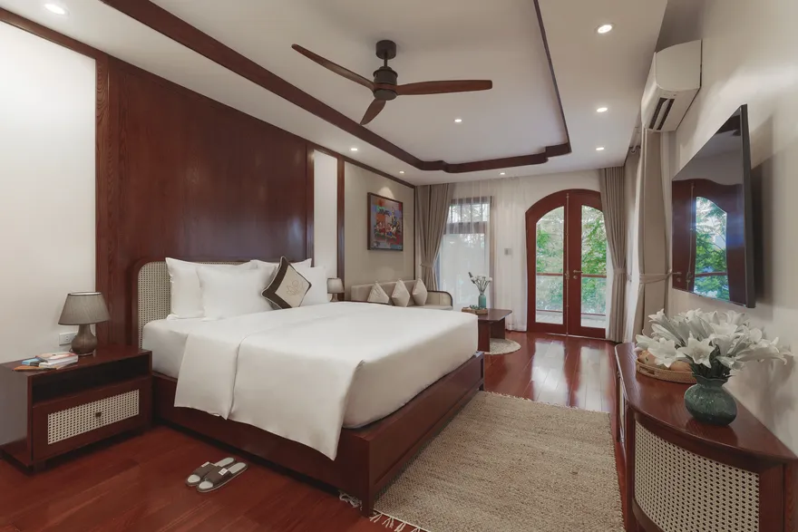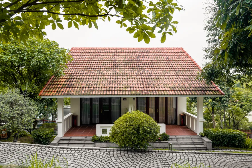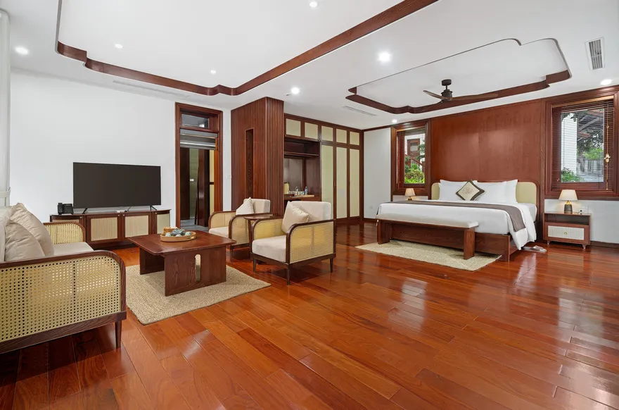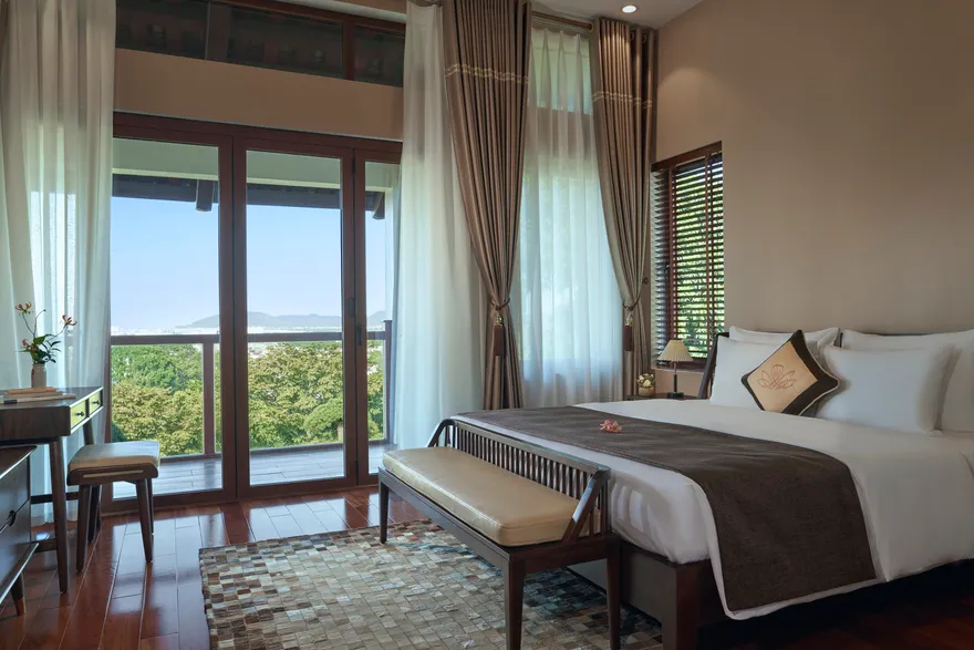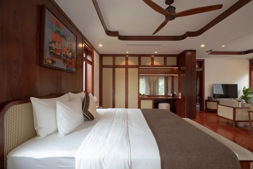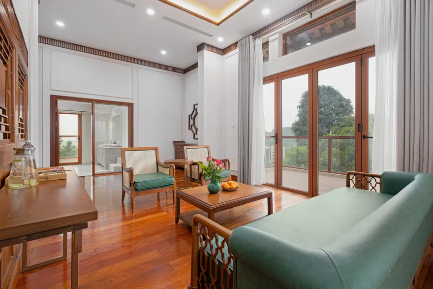 Kiến trúc tại đây được quy hoạch tinh tế dựa trên thuyết Ngũ hành nhằm tối ưu hóa các dòng chảy năng lượng và mang lại sự cân bằng trọn vẹn cho kỳ nghỉ. Phân khu Earth Residence (hành Thổ) tập trung vào sự vững chãi với các phòng Superior thiết kế tối giản, ấm cúng; trong khi Water Residence (hành Thủy) mang lại sự thanh lọc qua các căn Bungalow không gian mở hướng về vườn cây và hồ cá Koi. Metal Residence (hành Kim) đại diện cho sự sang trọng với hạng phòng Deluxe và Suites tích hợp sẵn phòng trị liệu riêng biệt; còn Fire Mansion (hành Hỏa) và Air Mansion (hành Khí) là những biệt thự quy mô lớn, khoáng đạt, phù hợp cho các gia đình muốn tái tạo năng lượng sống. Toàn bộ không gian lưu trú đều được trang bị đầy đủ tiện nghi tiêu chuẩn như Smart TV, điều hòa hai chiều, bồn tắm cao cấp và két an toàn để đảm bảo sự thoải mái tối đa cho du khách.