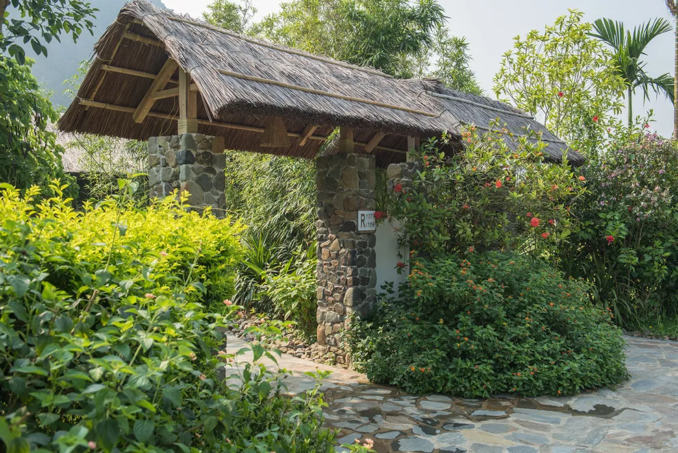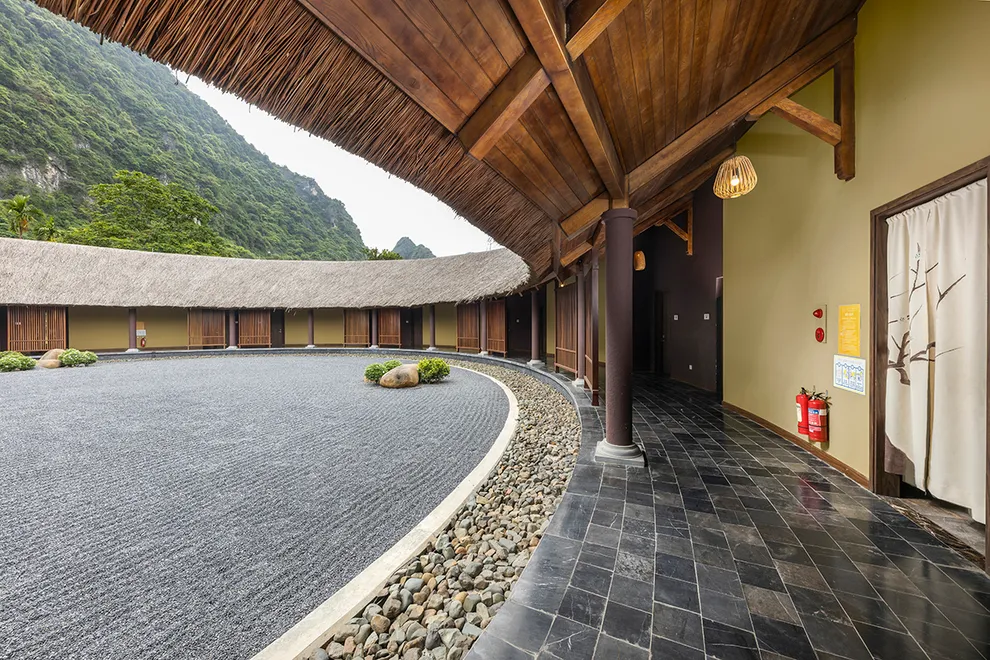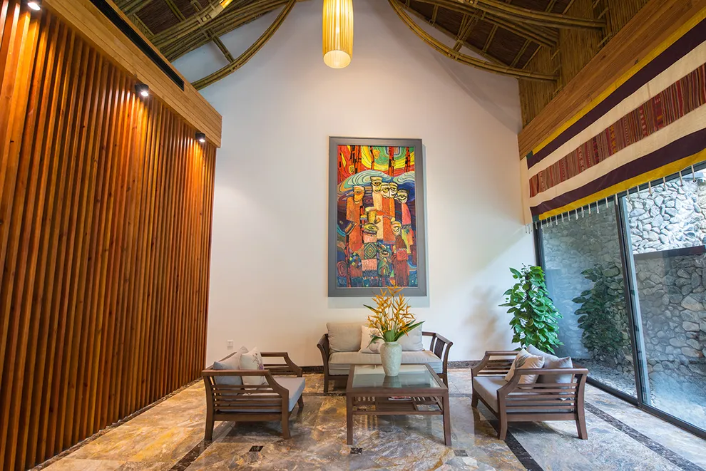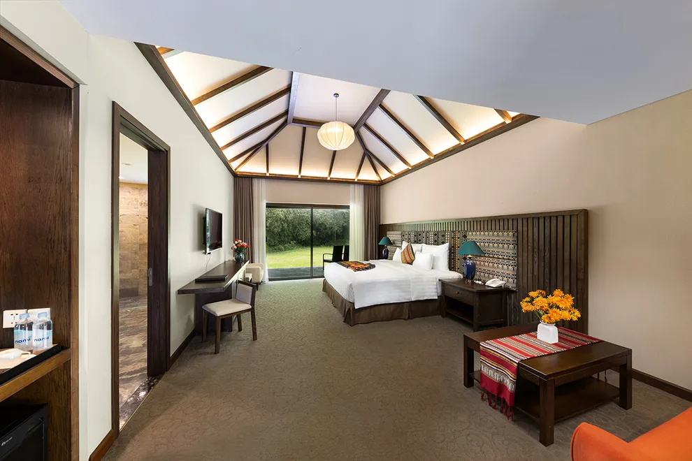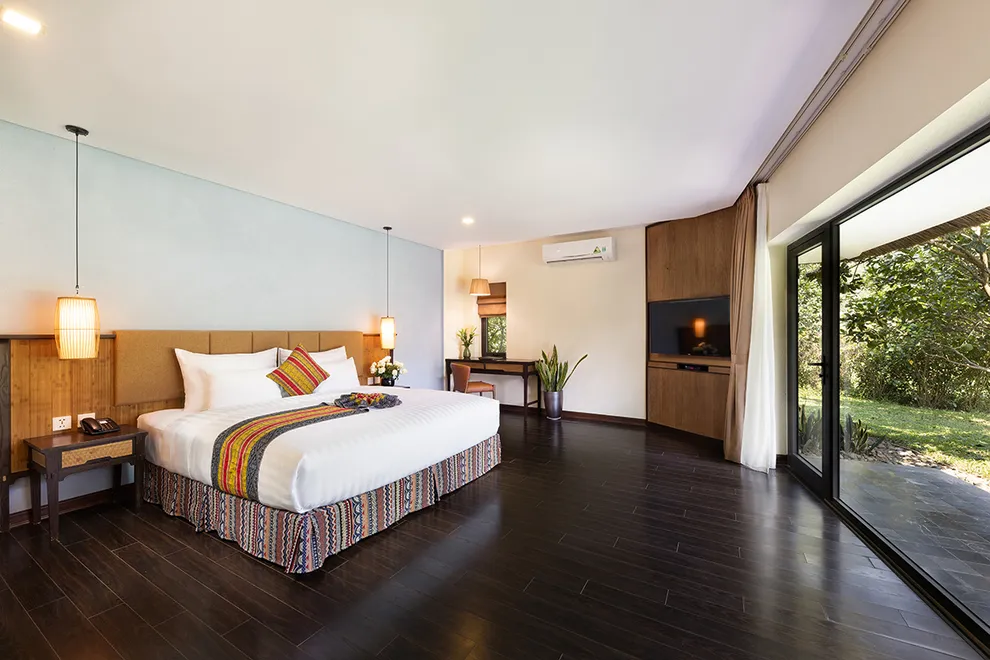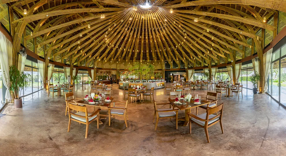 Kiến trúc của Serena Resort là sự giao thoa tinh tế giữa thiên nhiên và bản sắc văn hóa Mường. Công trình tiêu biểu nhất là Nhà hàng Nón, một kiệt tác được tạo hình theo chiếc nón lá khổng lồ, lắp ghép từ hàng ngàn thân tre và tầm vông thủ công. Thiết kế này không chỉ mang tính biểu tượng mà còn tạo ra hiệu ứng lưu thông không khí tự nhiên hiệu quả. Toàn bộ 155 phòng nghỉ, bungalow và biệt thự đều tuân thủ quy tắc kiến trúc xanh, sử dụng các vật liệu gần gũi như mái lá, gỗ, đá tảng và rèm thổ cẩm. Mỗi không gian lưu trú đều được thiết kế mở, tối ưu hóa tầm nhìn hướng ra dòng sông hoặc những dãy núi trùng điệp, mang lại cảm giác ấm cúng nhưng không kém phần sang trọng.