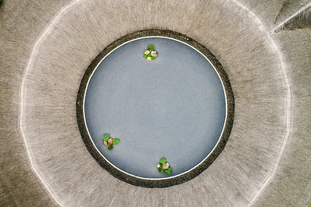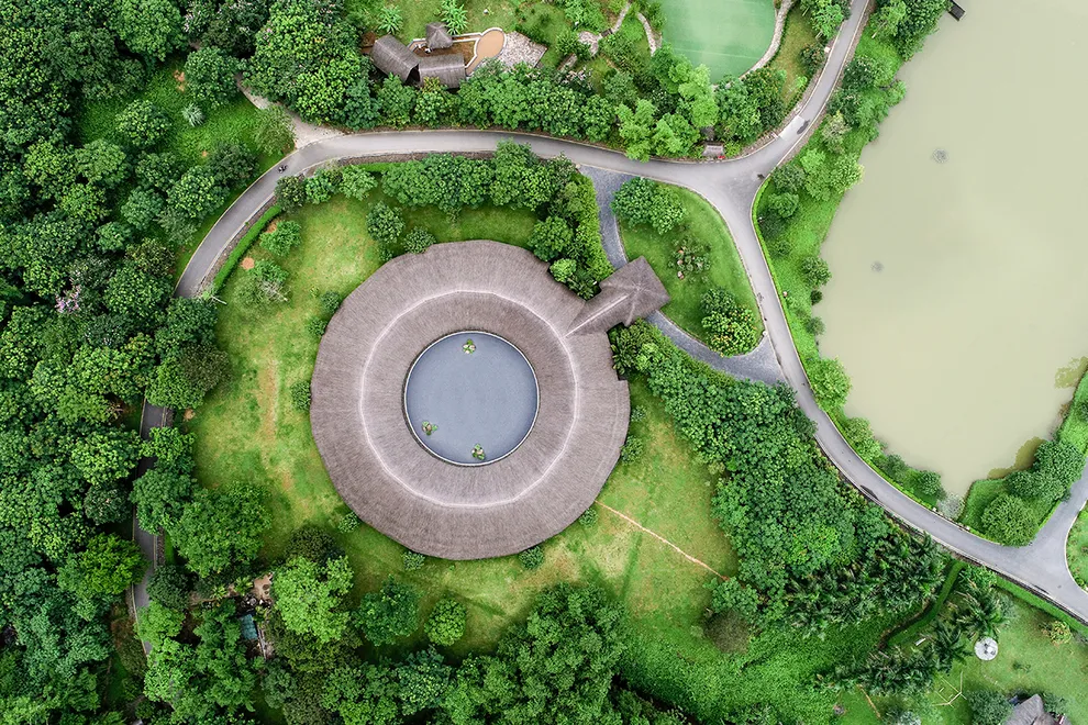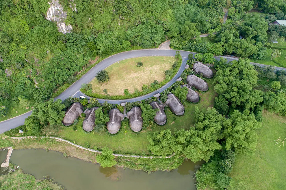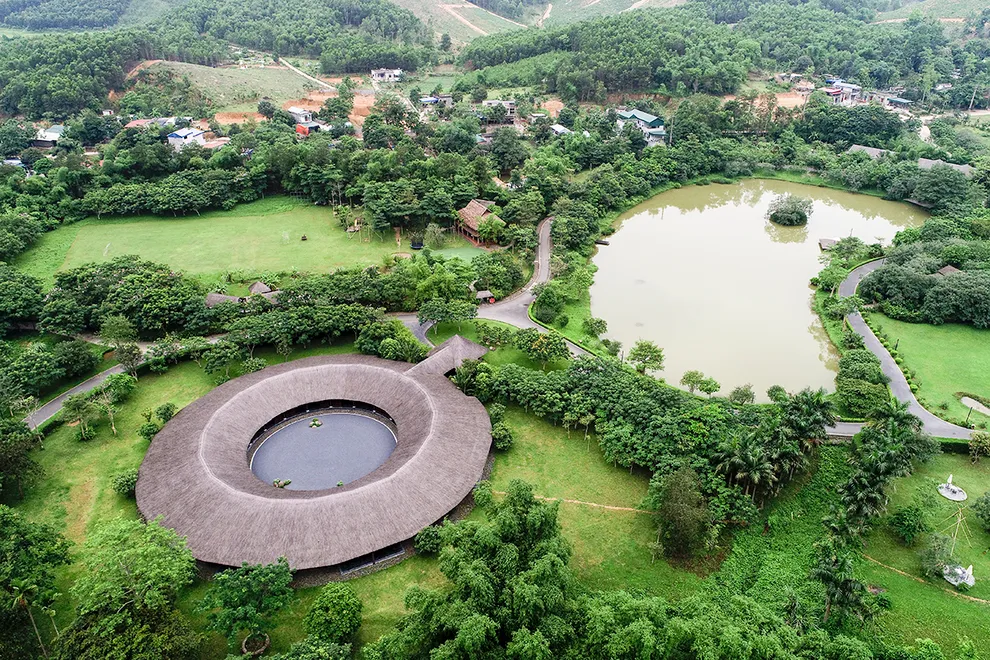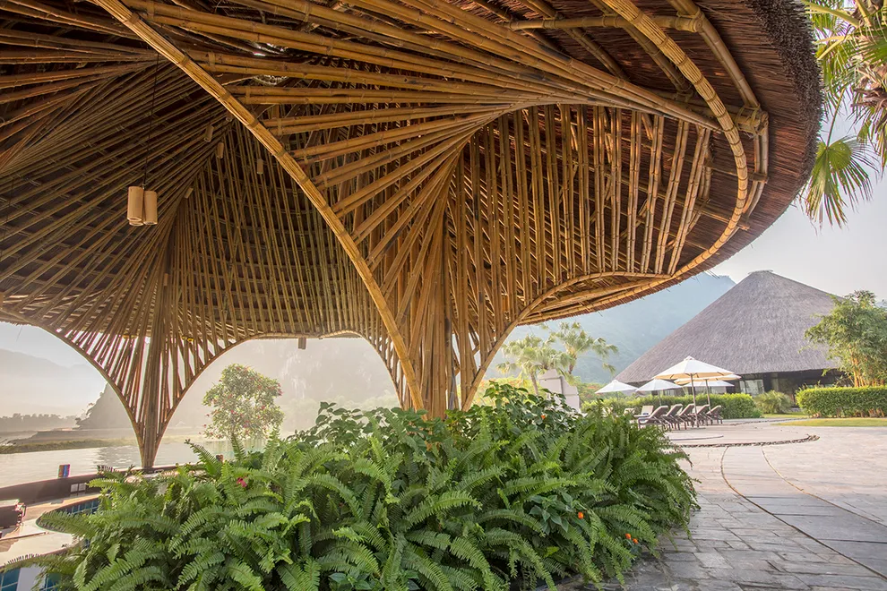 Kiến trúc của Serena Resort là sự giao thoa tinh tế giữa thiên nhiên và bản sắc văn hóa Mường. Công trình tiêu biểu nhất là Nhà hàng Nón, một kiệt tác được tạo hình theo chiếc nón lá khổng lồ, lắp ghép từ hàng ngàn thân tre và tầm vông thủ công. Thiết kế này không chỉ mang tính biểu tượng mà còn tạo ra hiệu ứng lưu thông không khí tự nhiên hiệu quả. Toàn bộ 155 phòng nghỉ, bungalow và biệt thự đều tuân thủ quy tắc kiến trúc xanh, sử dụng các vật liệu gần gũi như mái lá, gỗ, đá tảng và rèm thổ cẩm. Mỗi không gian lưu trú đều được thiết kế mở, tối ưu hóa tầm nhìn hướng ra dòng sông hoặc những dãy núi trùng điệp, mang lại cảm giác ấm cúng nhưng không kém phần sang trọng.