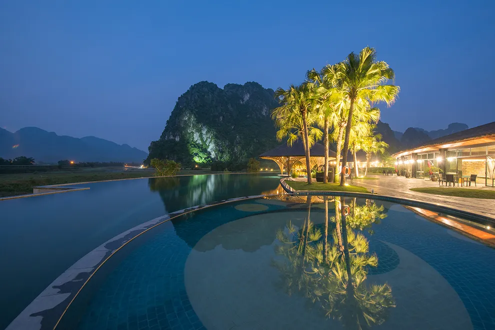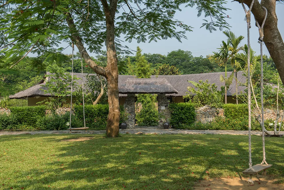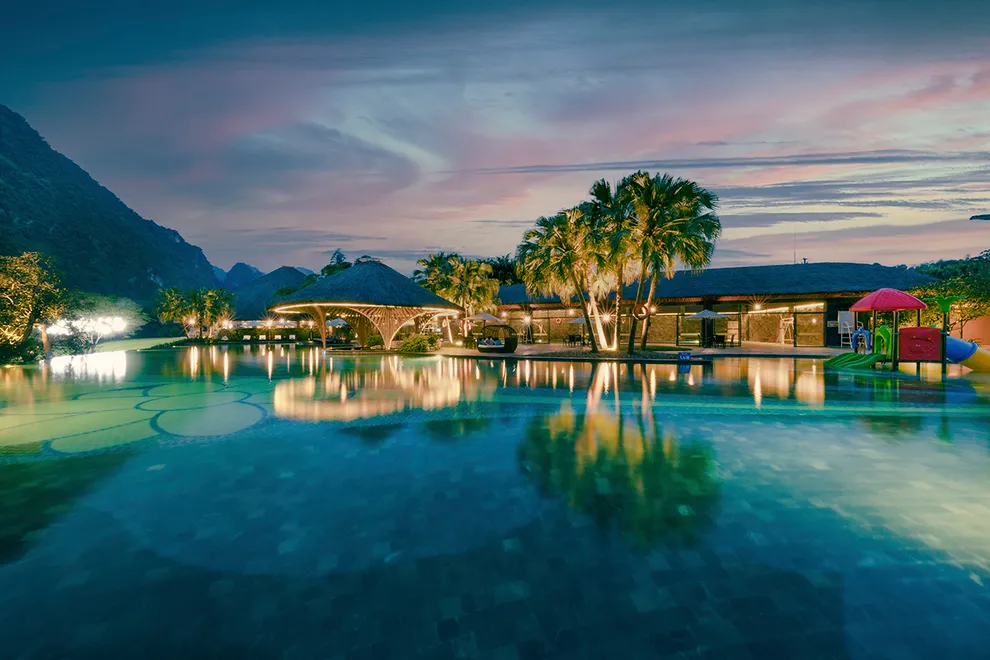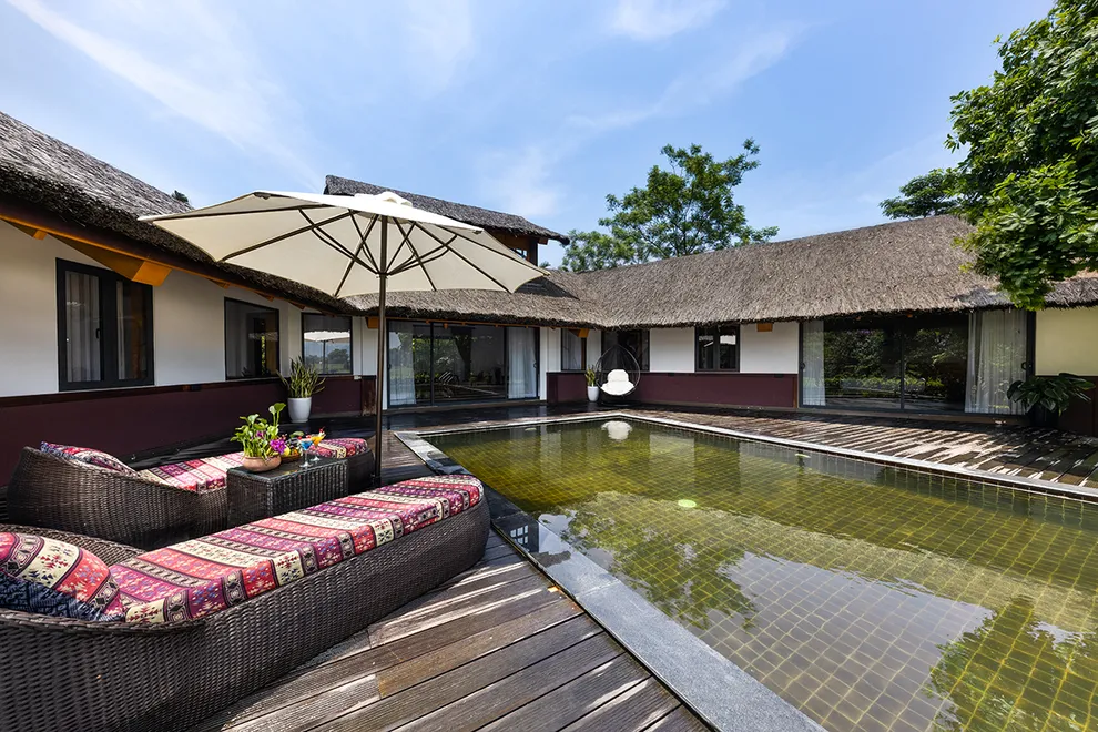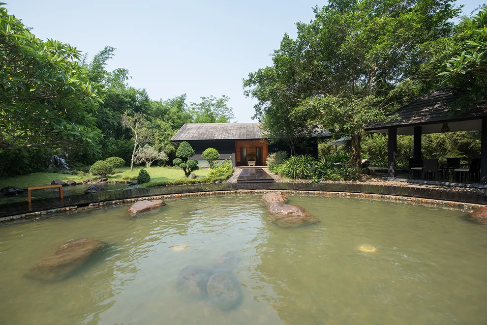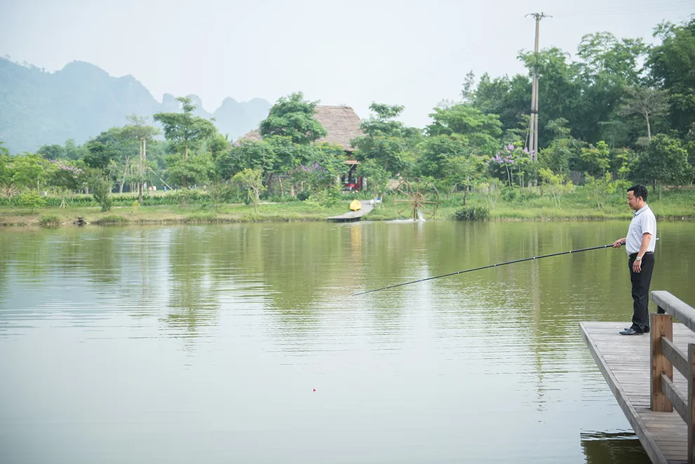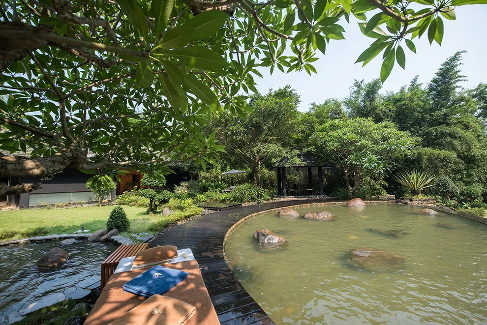 Trải nghiệm thay thế: Du khách có thể tận hưởng dòng sông Bôi hiền hòa chảy bao quanh khu nghỉ dưỡng hoặc trải nghiệm hệ thống bể bơi vô cực và hồ câu cá trong khuôn viên 30 hecta của resort.