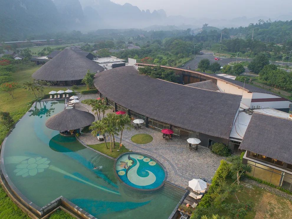 Khu nghỉ dưỡng sở hữu vị trí đắc địa tại xóm Khai Đồi, xã Sào Báy, huyện Kim Bôi, tỉnh Hòa Bình, cách trung tâm Hà Nội khoảng 80 km. Với khoảng 1,5 đến 2 giờ di chuyển bằng ô tô, đây là điểm đến lý tưởng cho những chuyến đi ngắn ngày hoặc nghỉ dưỡng cuối tuần. Địa thế của resort được bao bọc bởi dòng sông Bôi và tựa lưng vào dãy núi Quếnh hùng vĩ, tạo nên cấu trúc phong thủy “tựa sơn hướng thủy” điển hình. Điểm nhấn giá trị nhất tại đây chính là mỏ khoáng nóng Kim Bôi được hình thành từ vỉa đá vôi có niên đại hơn 250 triệu năm. Dòng khoáng luôn duy trì ổn định ở 43°C, chứa hàm lượng cao các khoáng chất như Bicarbonate, Sunphat, Canxi và Magie, mang lại giá trị trị liệu lớn cho xương khớp, tiêu hóa và làn da.