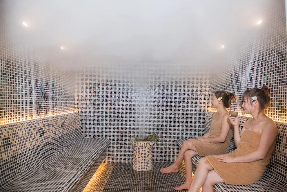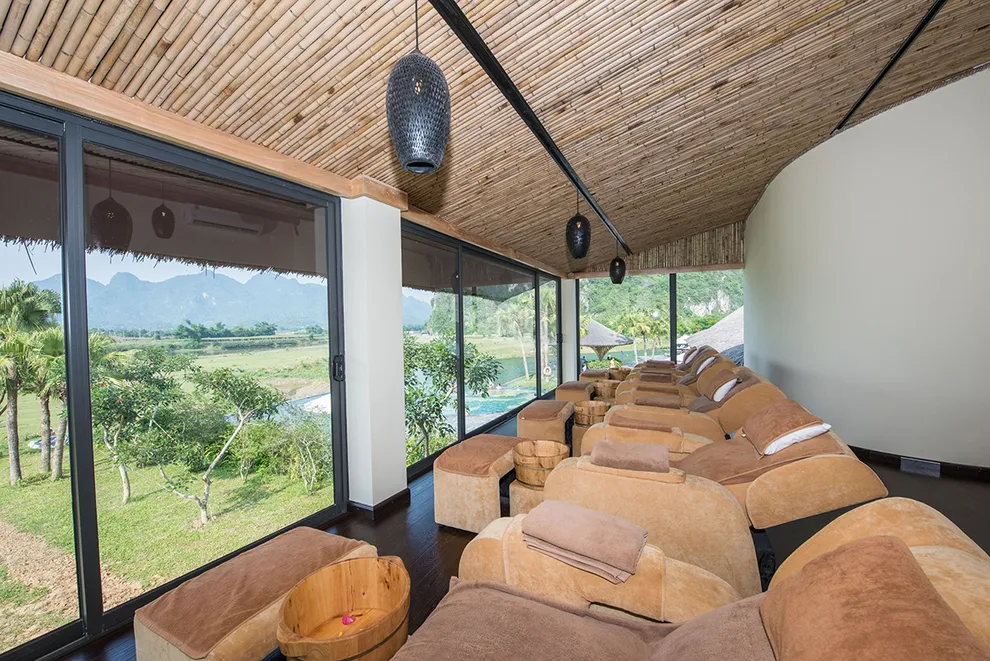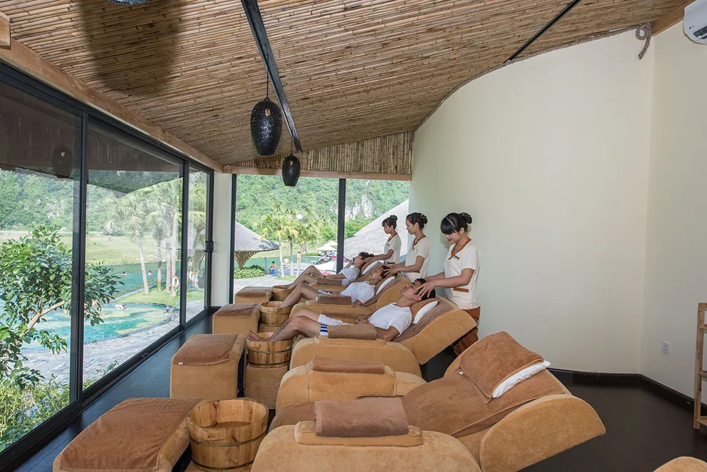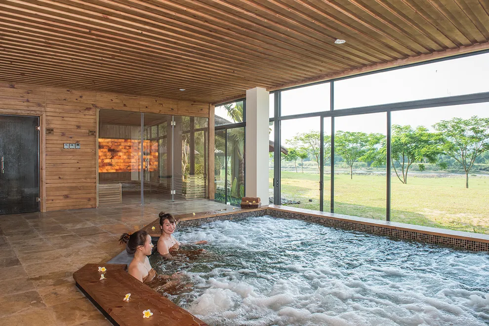 Hệ sinh thái Wellness tại đây được đầu tư bài bản với tâm điểm là khu tắm Onsen kiểu Nhật, kết hợp giữa cảnh quan đá tự nhiên và cây xanh. Resort cung cấp các bể Onsen đa dạng quy mô, từ bể nhỏ riêng tư đến bể lớn cho đoàn khách. Ngoài ra, hệ thống bể bơi khoáng nóng trong nhà rộng hơn 500 $m^2$ duy trì ở 40°C là cứu cánh cho du khách trong mùa đông, trong khi bể bơi vô cực ngoài trời lại là địa điểm check-in yêu thích với tầm nhìn bao trọn thung lũng. Dịch vụ Serena Spa bổ trợ quá trình trị liệu bằng các liệu pháp massage đá nóng, thảo dược vùng cao và xông hơi thải độc. Đặc biệt, từ năm 2026, du khách còn có thể trải nghiệm dịch vụ ngâm chân khoáng nóng tại khu vực Nhà Sàn để đa dạng hóa hành trình phục hồi sức khỏe.
