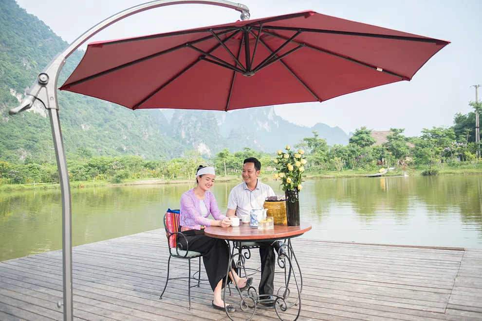 Hành trình trải nghiệm còn được nối dài qua ẩm thực tại Nhà hàng Nón, nơi hội tụ các đặc sản bản địa tươi ngon của vùng núi Hòa Bình. Du khách có thể thưởng thức những món ăn đặc trưng như lợn mán cỗ lá, cá suối nướng, gà đồi chắc thịt hay cơm lam và xôi nếp nương thơm nồng. Để đảm bảo an toàn thực phẩm và giữ gìn không gian sinh thái, resort áp dụng quy định nghiêm ngặt về việc mang thực phẩm ngoài vào khuôn viên và có thu phí phục vụ đối với đồ uống mang theo. Sự chuyên nghiệp trong vận hành kết hợp với hương vị ẩm thực truyền thống đã tạo nên một chuẩn mực mới cho du lịch tỉnh Hòa Bình.