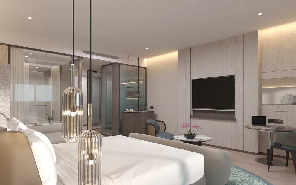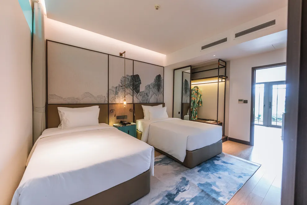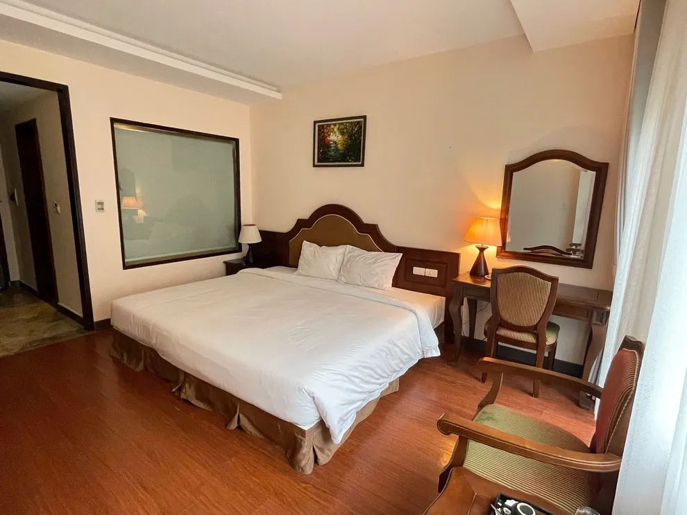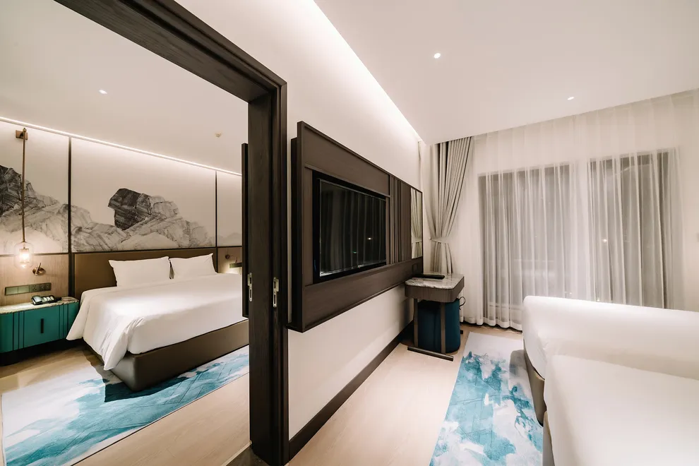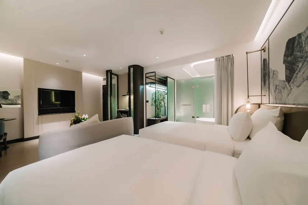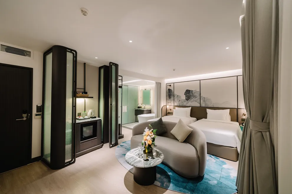 Phòng Family Suite tại The May Legend thường được thiết kế theo dạng không gian mở (Studio lớn) hoặc các giường được bố trí trong cùng một diện tích sinh hoạt chung rộng rãi (50-60m²) để tối ưu hóa sự kết nối gia đình, thay vì chia thành các phòng ngủ đóng kín cửa riêng biệt hoàn toàn.