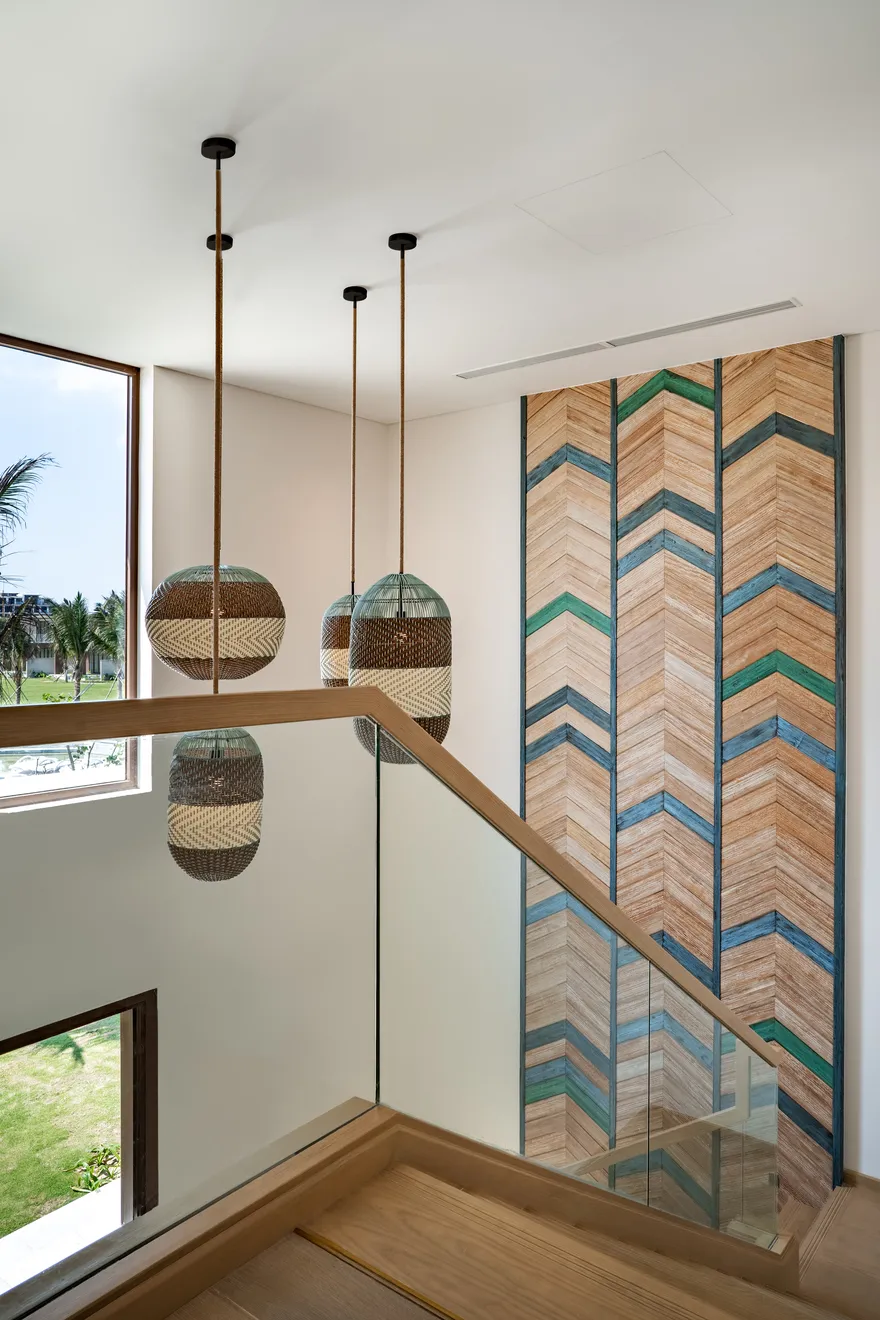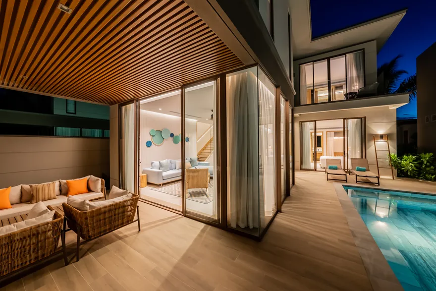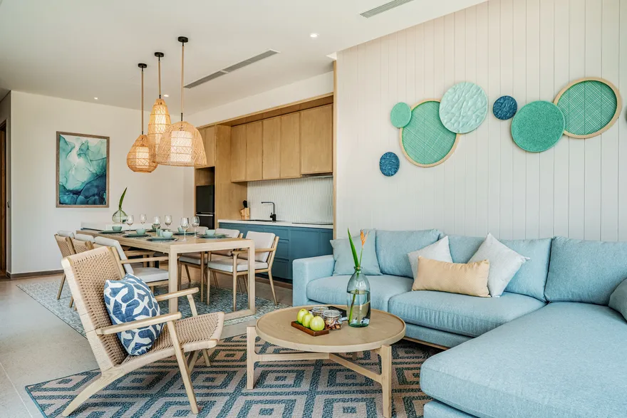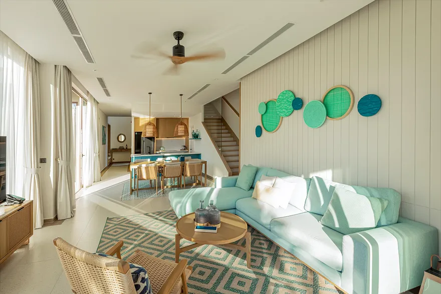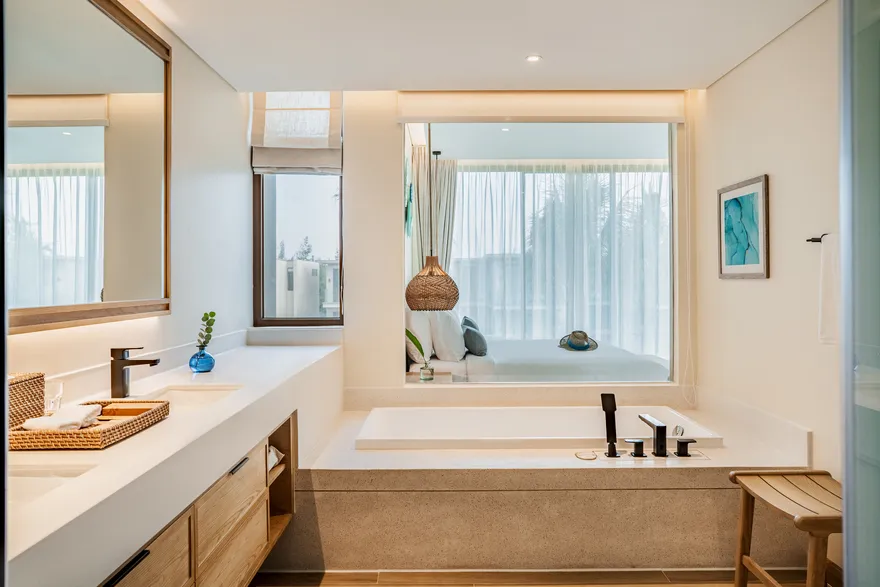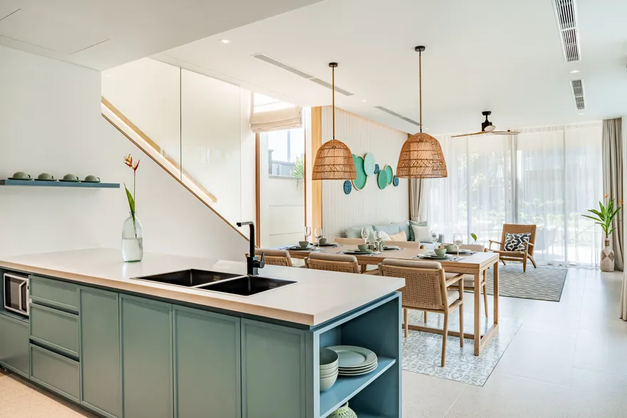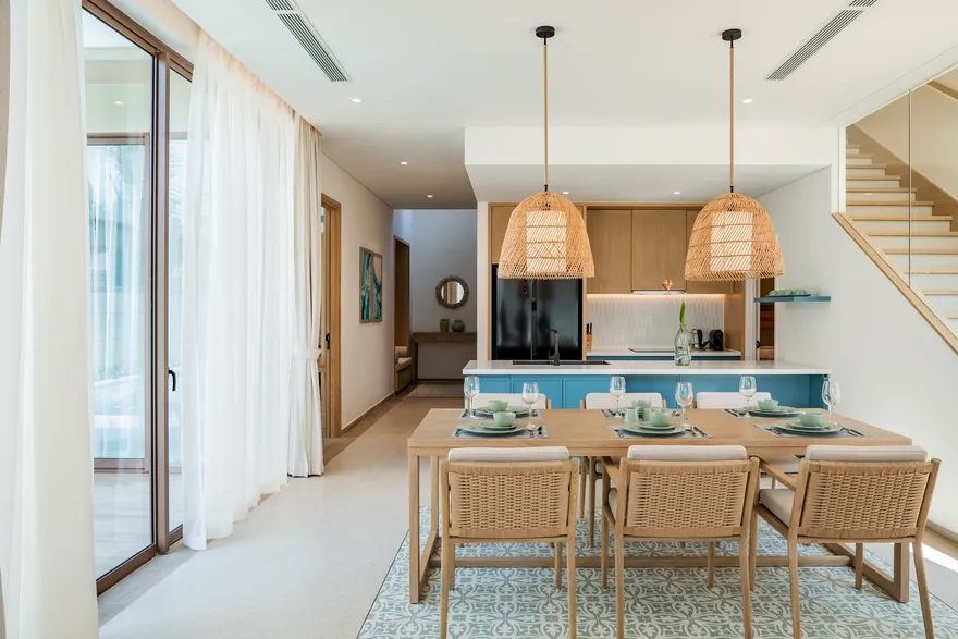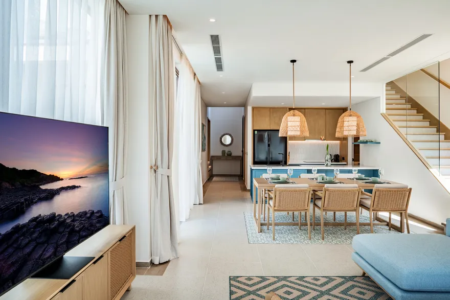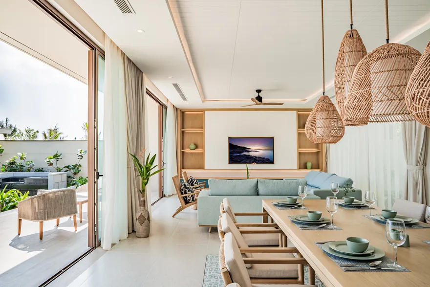 Bước chân vào không gian của các căn biệt thự, triết lý “Living the Ocean Spirit” sẽ chạm đến mọi giác quan của bạn thông qua ngôn ngữ kiến trúc mở tinh tế. Việc sử dụng các mặt bằng thông suốt cùng hệ thống cửa kính cường lực lớn sát trần không đơn thuần là để đón sáng, mà là một cách để xóa nhòa ranh giới giữa nội thất và ngoại thất, đưa thiên nhiên vào sâu trong tâm trí người ở. Những vật liệu mộc mạc như gỗ và đá tự nhiên được xử lý khéo léo để tạo nên vẻ đẹp sang trọng tối giản, giúp bạn cảm thấy được bao bọc và che chở. Với mật độ xây dựng thấp, mỗi bước chân trên những lối đi vòm tre đều là một khoảnh khắc bạn được thư giãn thực sự giữa một ốc đảo riêng tư.