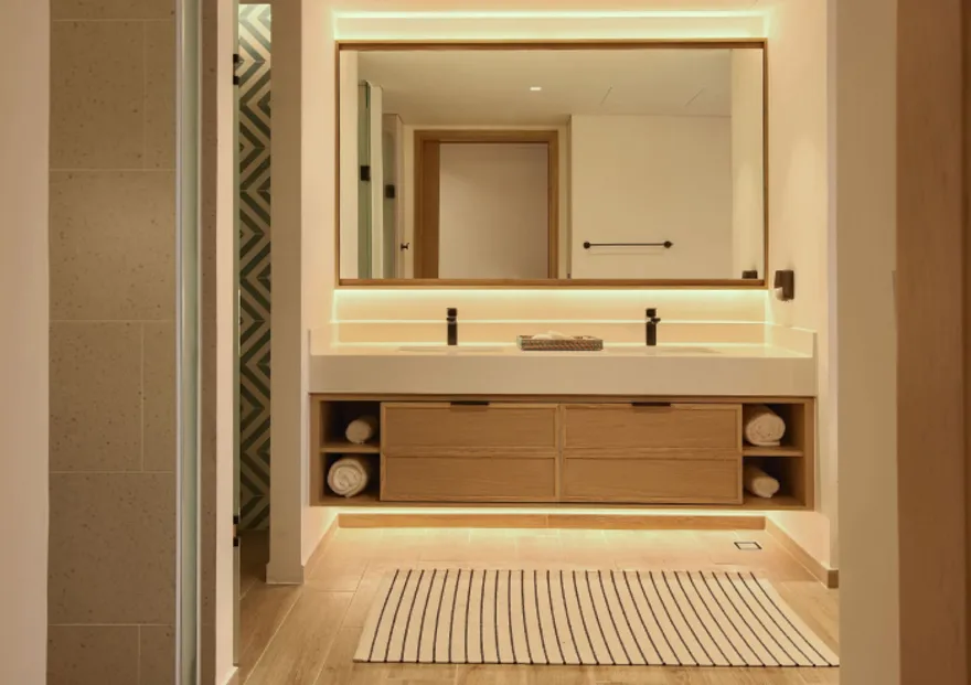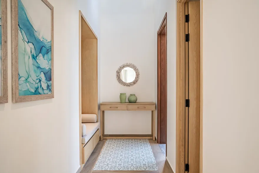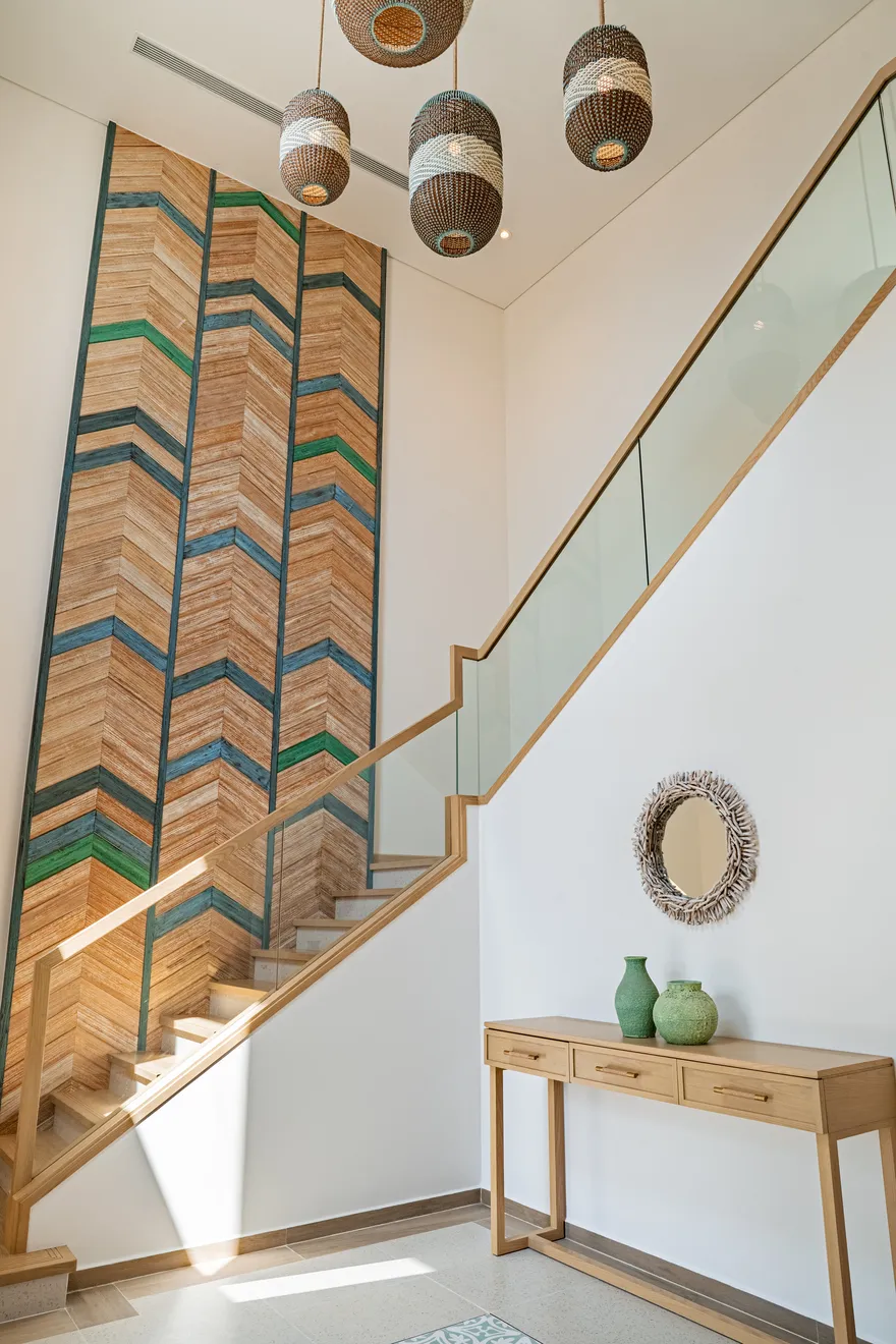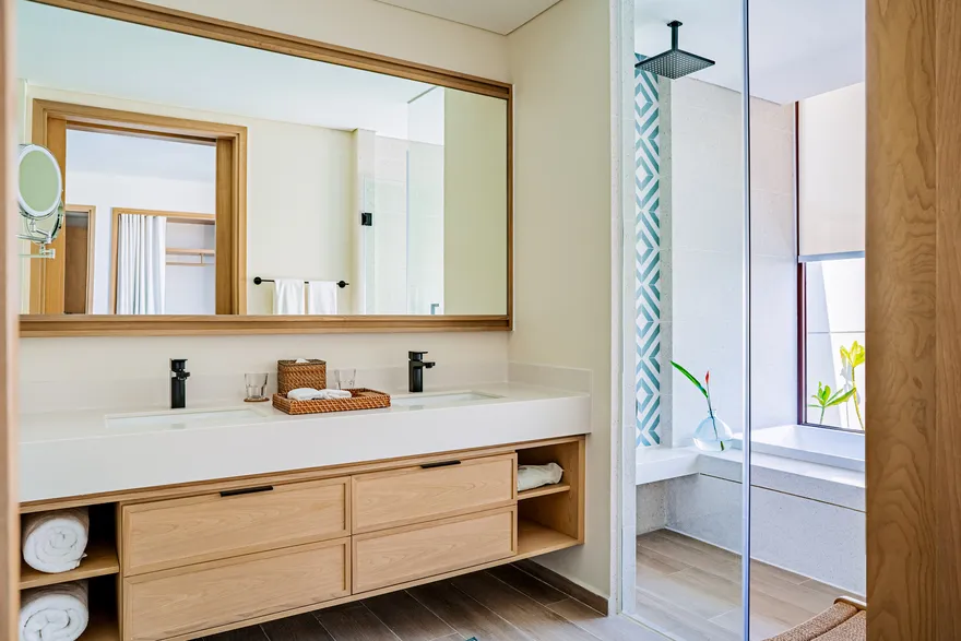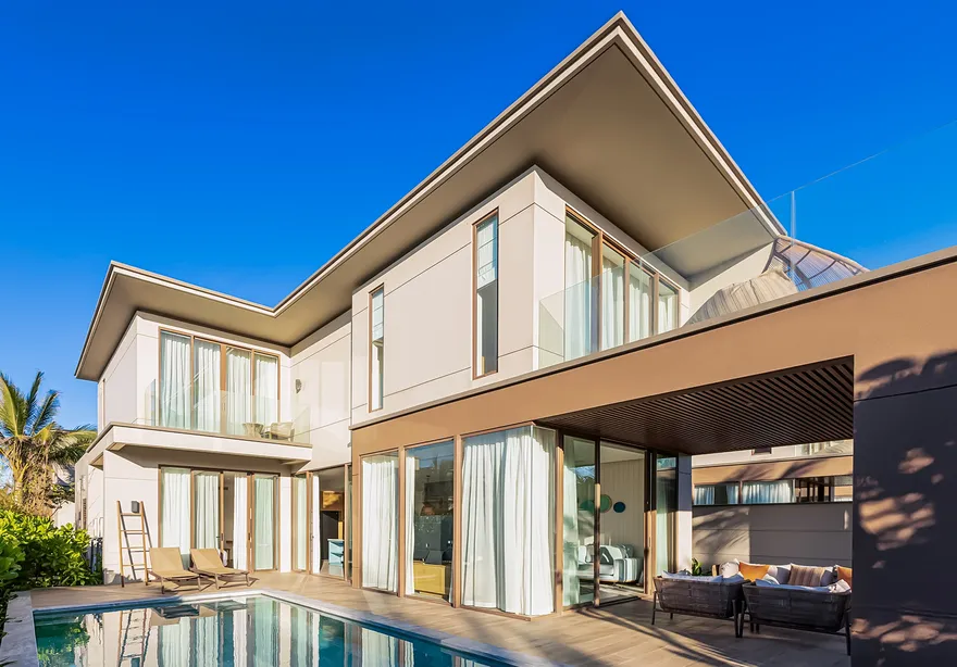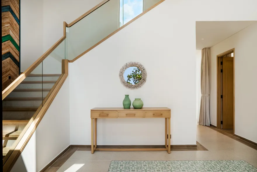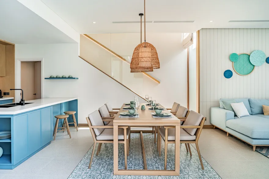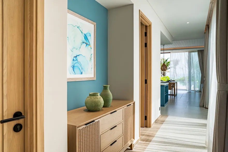 Bước chân vào không gian của các căn biệt thự, triết lý “Living the Ocean Spirit” sẽ chạm đến mọi giác quan của bạn thông qua ngôn ngữ kiến trúc mở tinh tế. Việc sử dụng các mặt bằng thông suốt cùng hệ thống cửa kính cường lực lớn sát trần không đơn thuần là để đón sáng, mà là một cách để xóa nhòa ranh giới giữa nội thất và ngoại thất, đưa thiên nhiên vào sâu trong tâm trí người ở. Những vật liệu mộc mạc như gỗ và đá tự nhiên được xử lý khéo léo để tạo nên vẻ đẹp sang trọng tối giản, giúp bạn cảm thấy được bao bọc và che chở. Với mật độ xây dựng thấp, mỗi bước chân trên những lối đi vòm tre đều là một khoảnh khắc bạn được thư giãn thực sự giữa một ốc đảo riêng tư.
