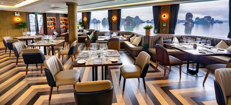 Du thuyền tự hào sở hữu hệ thống hai nhà hàng 5 sao với tổng sức chứa lên đến 500 khách, nơi các đầu bếp tài hoa mang đến những bữa tiệc vị giác đặc sắc, dù là thực đơn buffet quốc tế phong phú trong tour ngày hay buffet/set menu thượng hạng vào buổi tối, đều là sự kết hợp hài hòa giữa tinh hoa ẩm thực Á – Âu. Đặc biệt, các món ăn luôn chú trọng sử dụng nguồn hải sản tươi ngon nhất, được tuyển chọn kỹ lưỡng từ chính vùng biển Hạ Long trù phú.