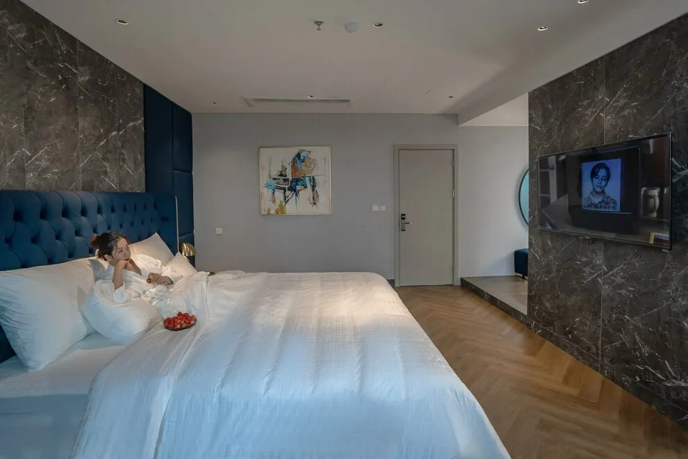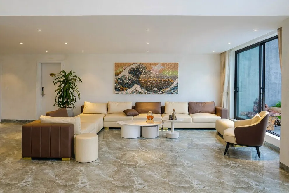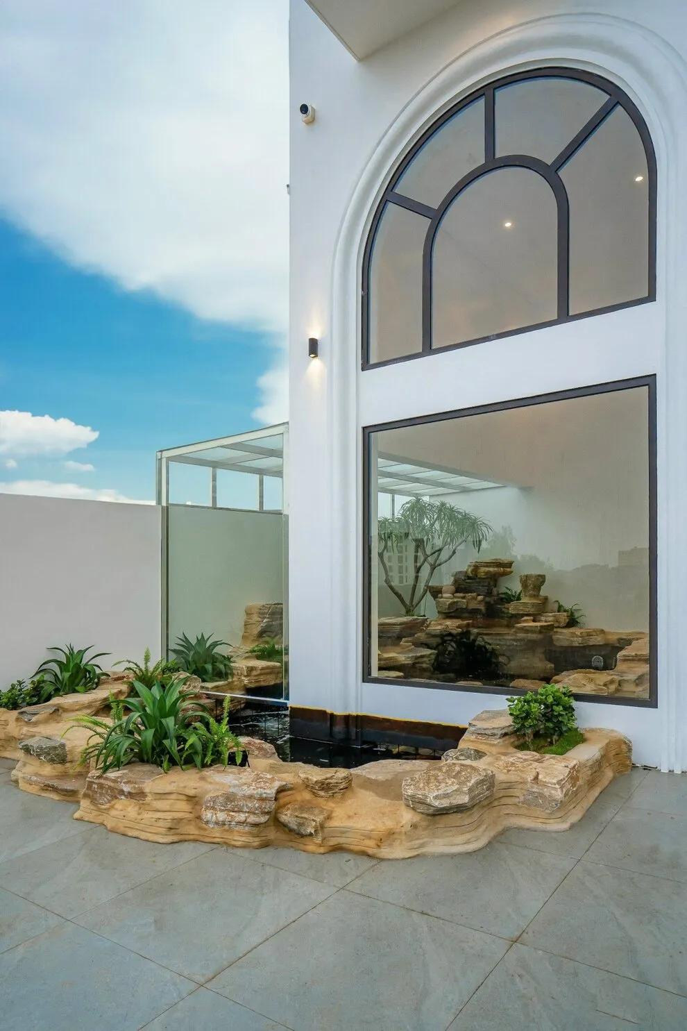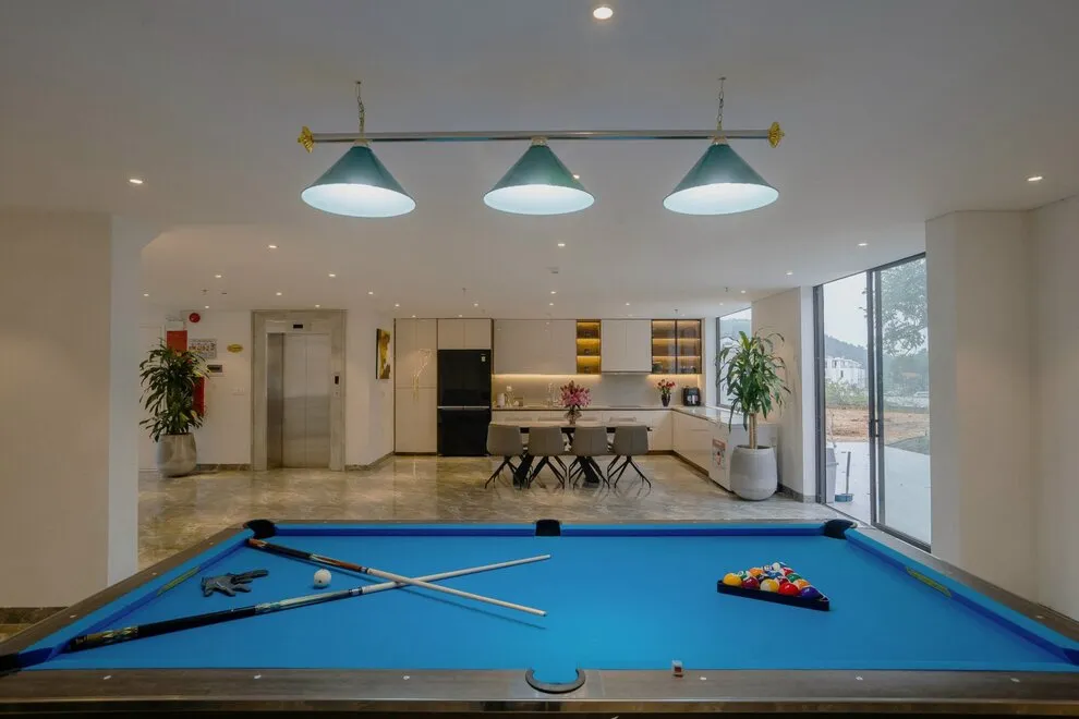 Hành trình trải nghiệm tại A25 Villa bắt đầu từ tầng 1 với không gian phòng khách rộng tới 210m2, nơi du khách bị choáng ngợp bởi bể cá Koi trong nhà diện tích 50m2 cùng các góc check-in nghệ thuật. Đây cũng là khu vực kết nối cộng đồng với bàn Billiard, bi lắc và hệ thống bếp nấu chuyên nghiệp dành cho những bữa tiệc BBQ quy mô lớn. Điểm độc đáo nhất của villa nằm ở sự phân tầng concept: từ tầng 2 đến tầng 5, mỗi tầng đều có 4 phòng ngủ Deluxe đi kèm một phòng khách riêng biệt với phong cách check-in không trùng lặp, đảm bảo mỗi bước chân của du khách đều là một khám phá mới lạ. Riêng tầng lửng được thiết kế dành riêng cho “đại tiệc âm thanh” với phòng Karaoke sức chứa lên đến 60 – 80 người, kết nối trực tiếp với sảnh ăn ngoài trời thoáng đạt.