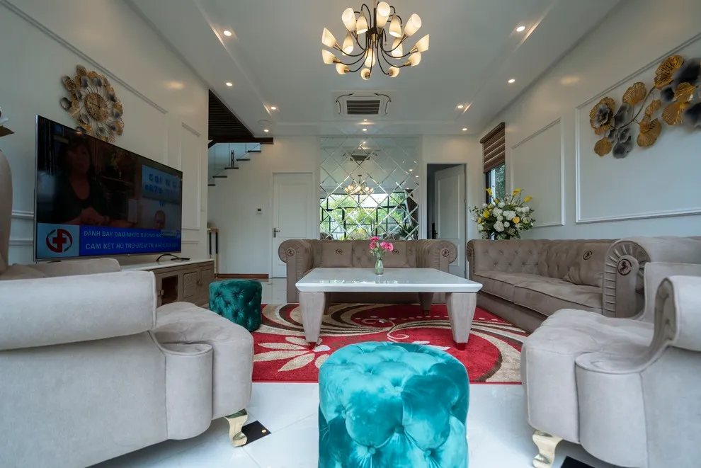 Nội thất của villa được đầu tư bài bản với cấu trúc 07 phòng ngủ riêng biệt, bao gồm 06 giường King size (1m8 x 2m) và một hệ thống giường tầng linh hoạt, tất cả đều được trang bị đầy đủ các thiết bị cần thiết như điều hòa, tivi, máy sấy tóc và wifi tốc độ cao. Trái tim của biệt thự là phòng khách rộng lớn tích hợp tivi màn hình 65 inch cùng hệ thống loa đài karaoke chuyên nghiệp, kết nối trực tiếp với phòng bếp hiện đại. Khu vực bếp được chuẩn bị sẵn sàng với đầy đủ từ bếp từ, tủ lạnh công suất lớn đến từng bộ bát đũa và gia vị nấu nướng, giúp quý khách dễ dàng trổ tài chuẩn bị những bữa cơm gia đình đầm ấm.