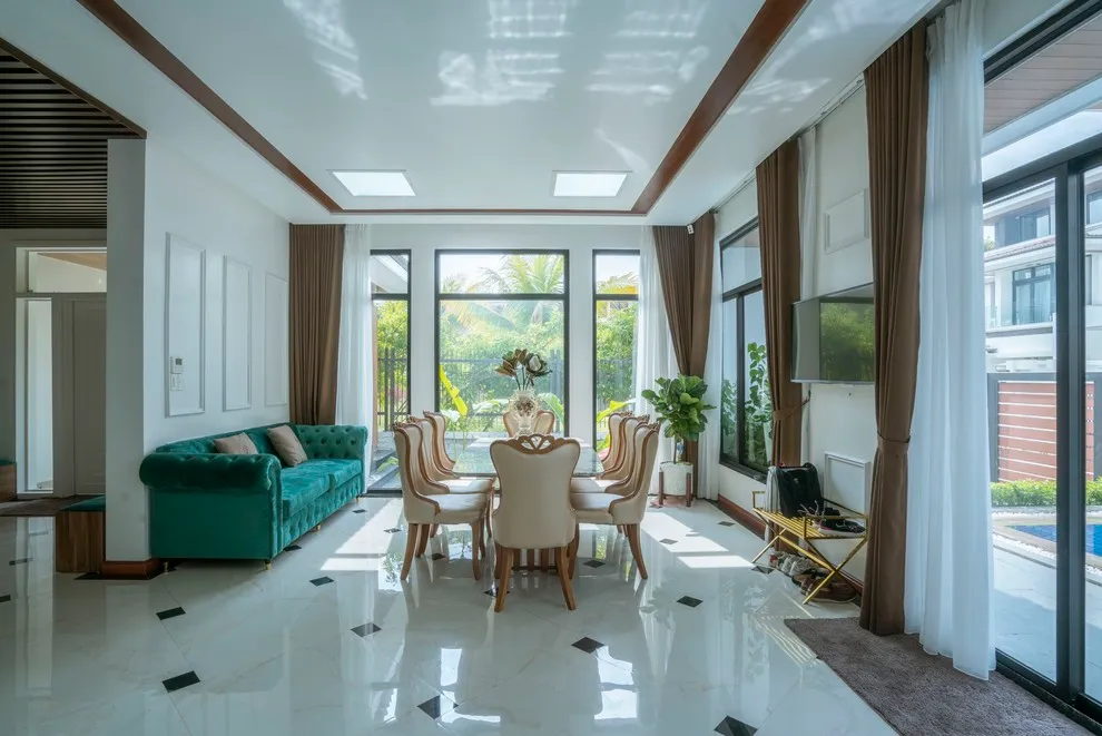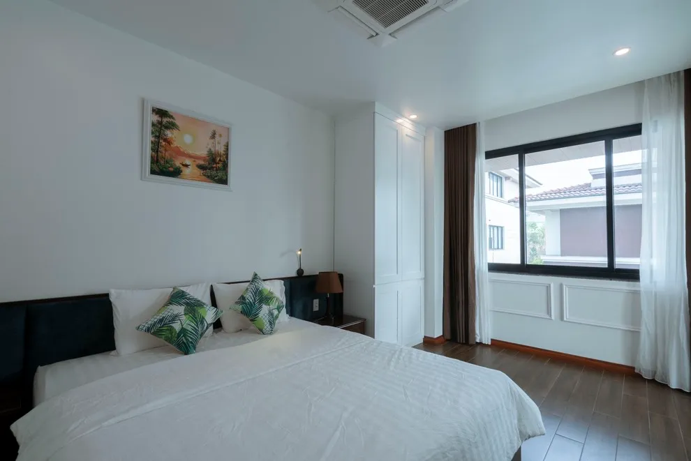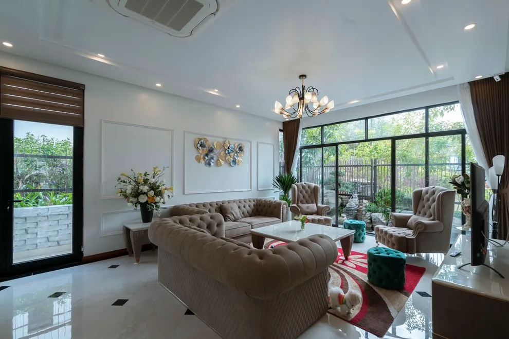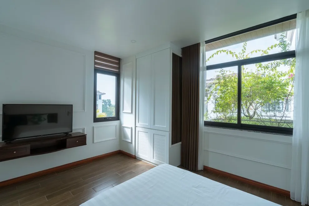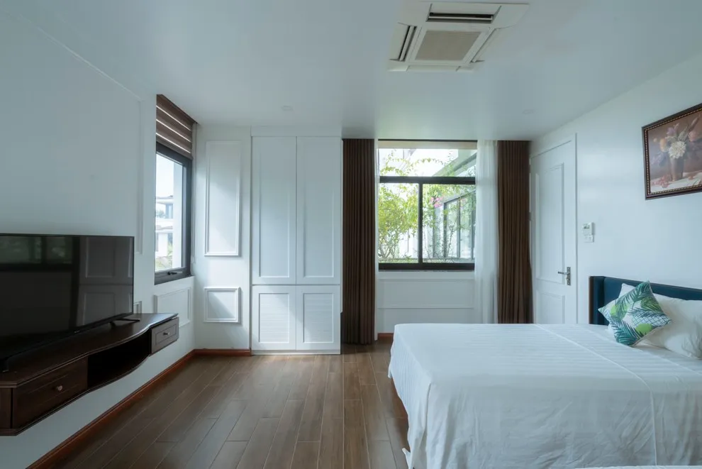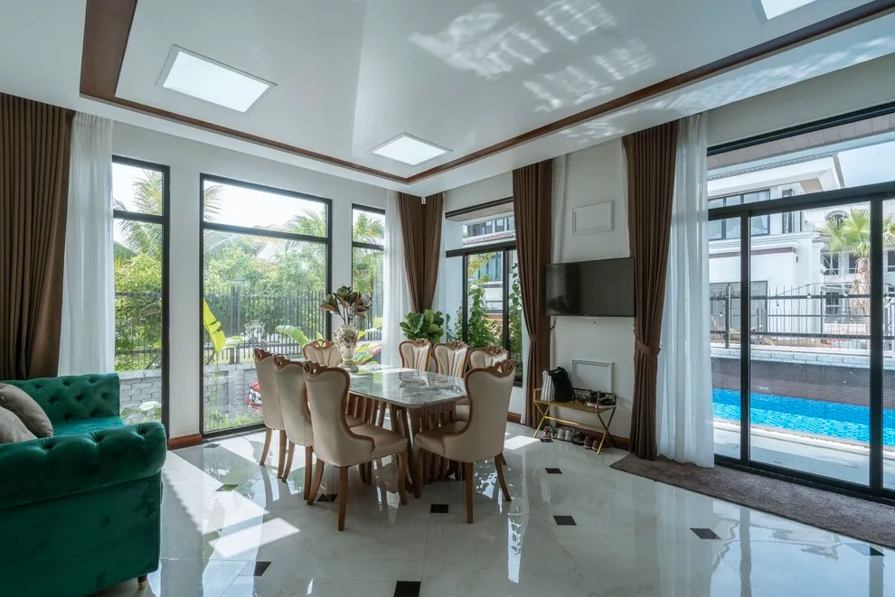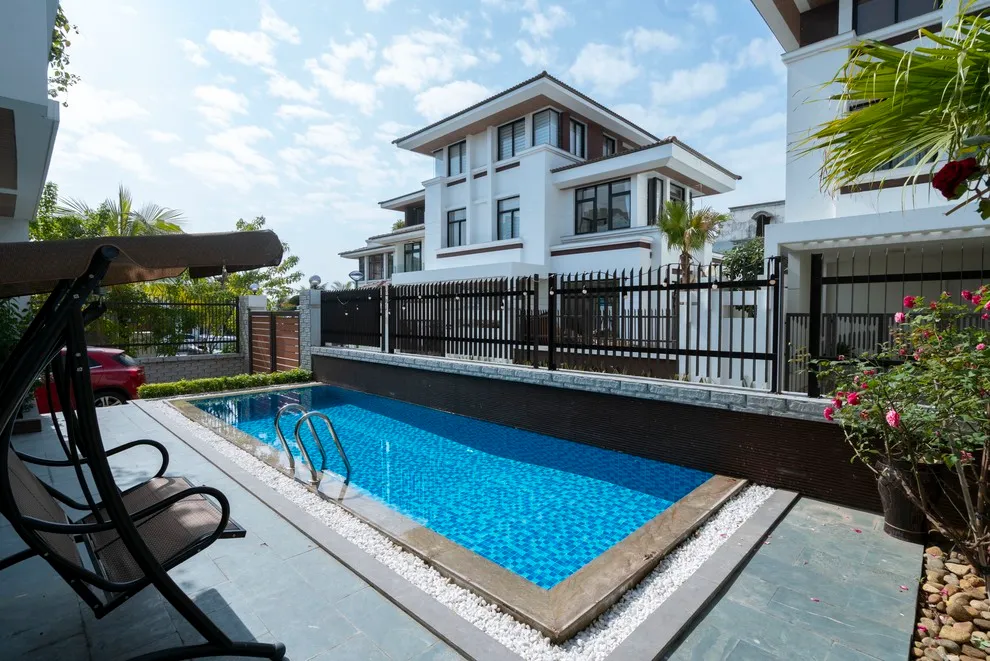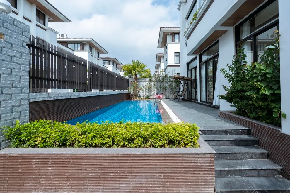 Không gian bên trong được chăm chút tỉ mỉ với nội thất hiện đại, bao gồm 06 phòng ngủ rộng rãi và 05 nhà vệ sinh tiện nghi. Trái tim của biệt thự là phòng bếp được trang bị đầy đủ từ bát đũa đến các thiết bị gia dụng cao cấp như điều hòa trung tâm, tủ lạnh, lò vi sóng và bếp từ, giúp quý khách dễ dàng tổ chức những bữa cơm gia đình đầm ấm. Điểm nhấn ấn tượng nhất chính là bể bơi riêng rộng 35m, nơi quý khách có thể thả mình trong làn nước mát và thư giãn sau một ngày dài khám phá.
