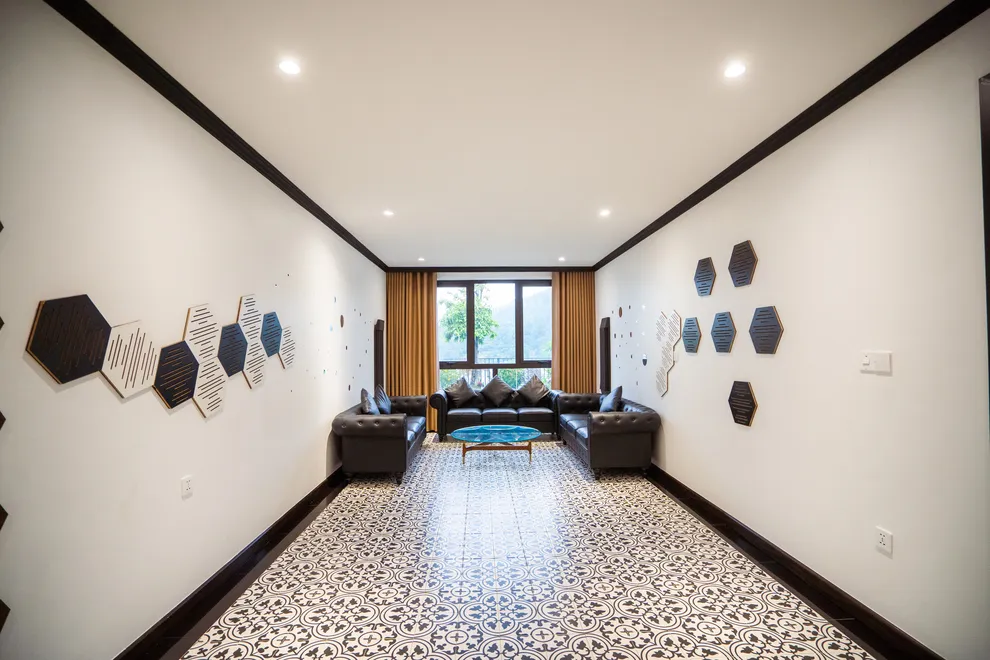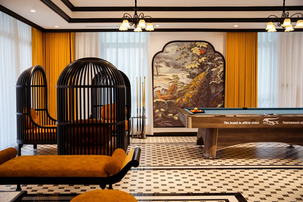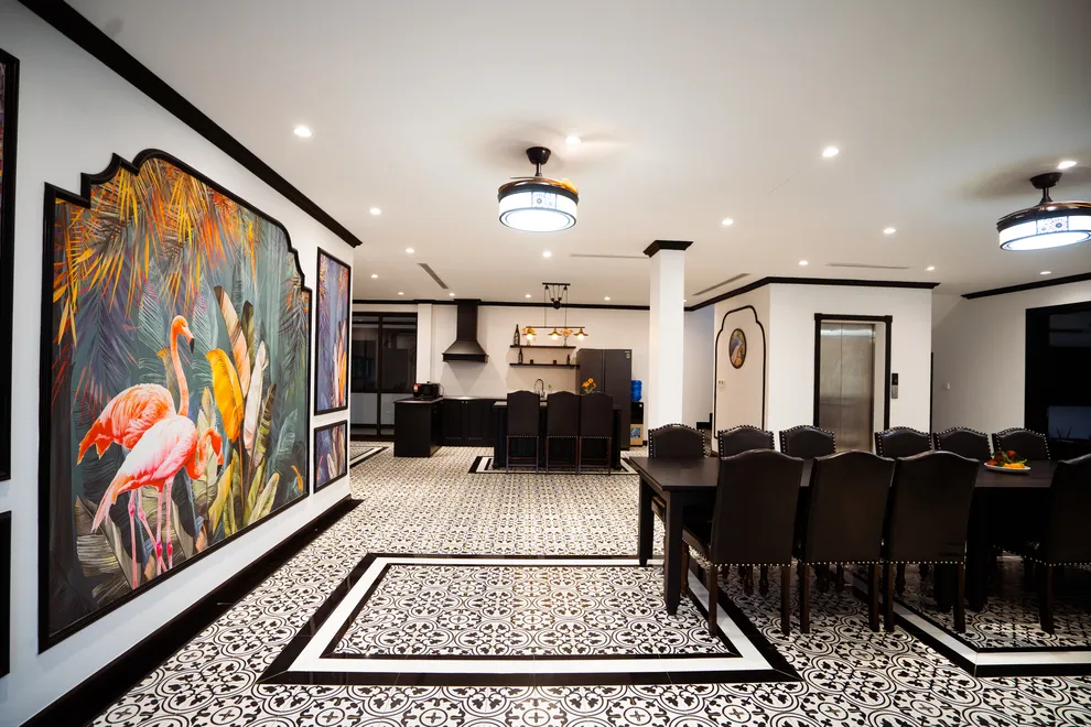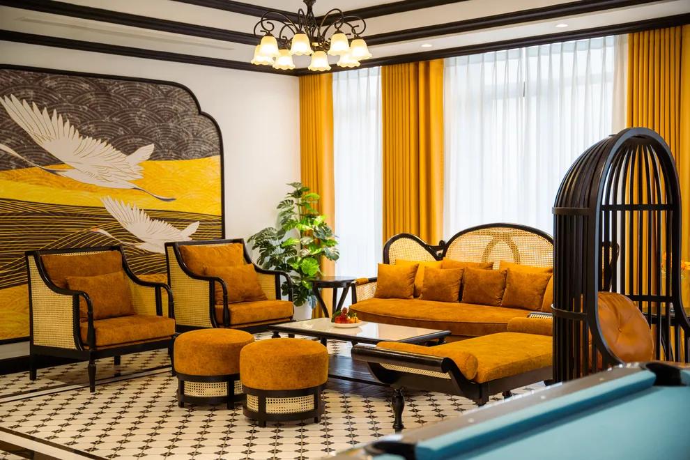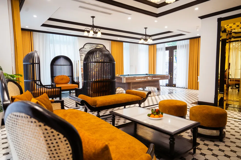 Bước chân vào biệt thự, du khách sẽ ngay lập tức bị chinh phục bởi lối kiến trúc Indochine tinh tế, nơi những chi tiết nội thất gỗ, mây tre đan và gạch bông cổ điển được sắp đặt khéo léo tạo nên không gian ấm cúng, sang trọng. Điểm nhấn của sự tiện nghi nằm ở hệ thống thang máy hiện đại, giúp việc di chuyển giữa 4 tầng lầu trở nên nhẹ nhàng cho cả người già và trẻ nhỏ. Hành trình khám phá bắt đầu từ tầng 1 – không gian tiếp khách thượng lưu với phòng khách rộng rãi và một bàn Bi-a cao cấp đặt ngay sảnh, nơi các cơ thủ có thể giao lưu ngay khi vừa check-in. Tại đây cũng bố trí 01 phòng ngủ Twin rộng rãi, thuận tiện cho việc sinh hoạt.