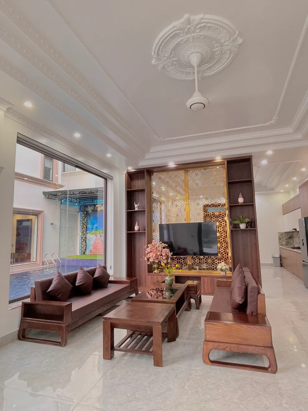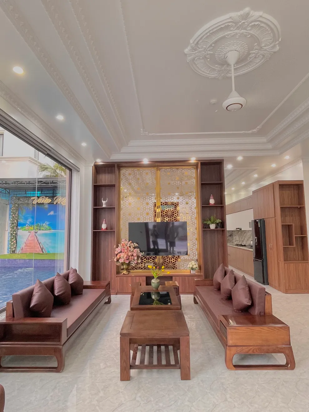 Không gian sinh hoạt chung của villa được thiết kế mở với phòng khách rộng rãi, mang phong cách sang trọng và tinh tế. Khu vực phòng bếp và phòng ăn được đầu tư đầy đủ dụng cụ nấu nướng hiện đại, từ bếp nấu đến lò nướng và bếp nướng BBQ, sẵn sàng cho những bữa tiệc gia đình đầm ấm. Đặc biệt, sự hiện diện của máy phát điện công suất lớn tại căn giúp du khách hoàn toàn yên tâm tận hưởng kỳ nghỉ mà không lo bị gián đoạn bởi các sự cố về điện lưới.