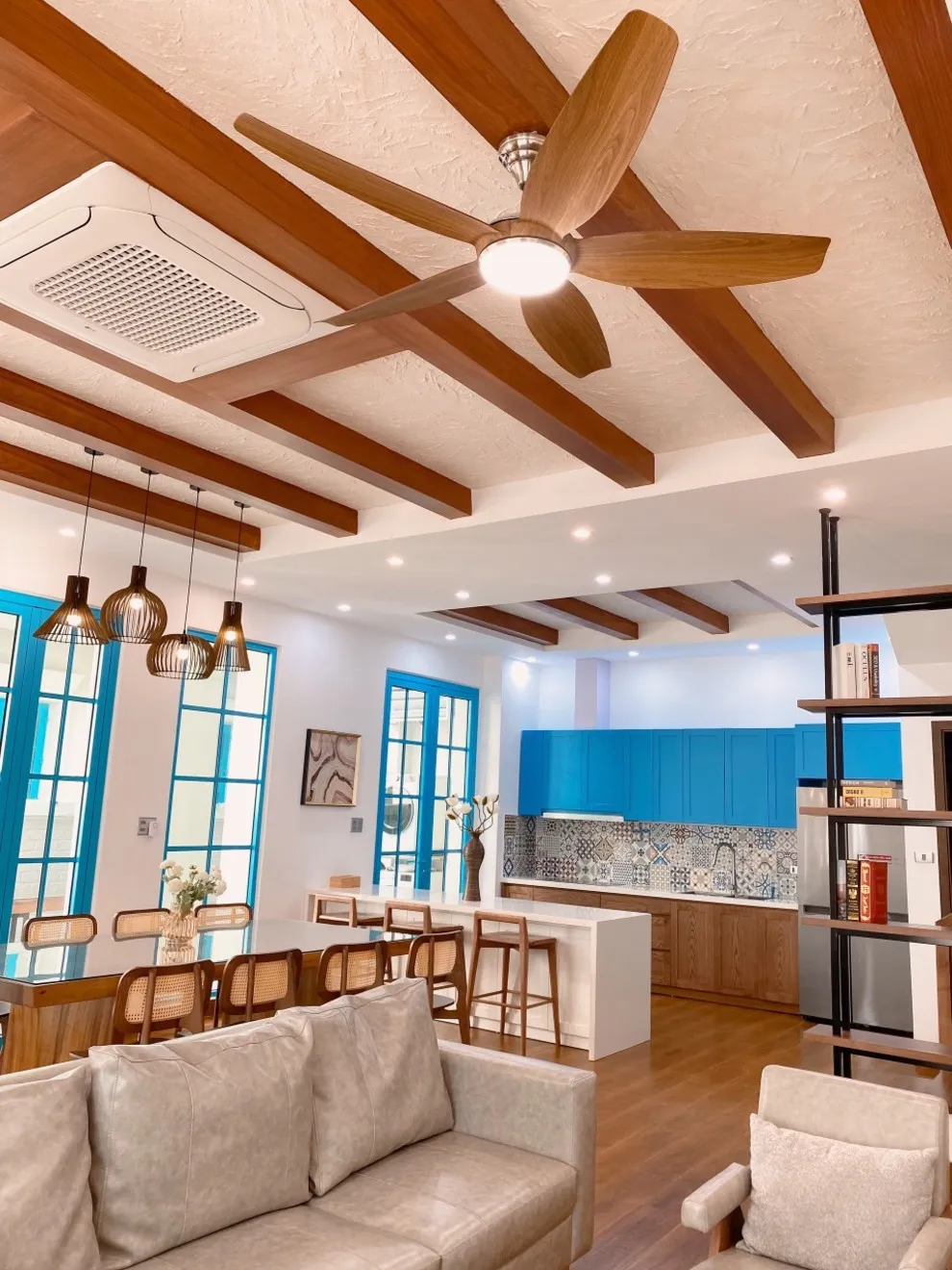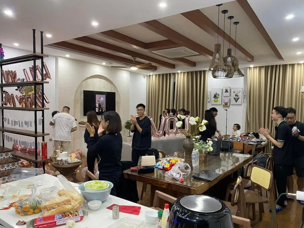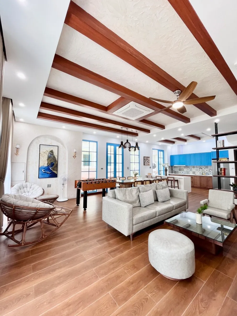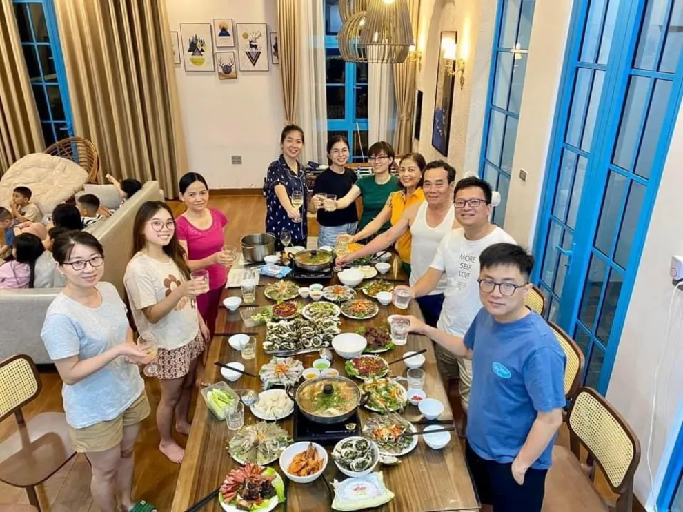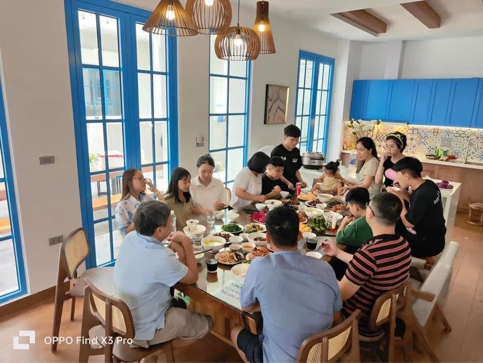 Mọi nhu cầu sinh hoạt thường ngày đều được đáp ứng tối đa với khu vực bếp hiện đại, đầy đủ đồ dùng nấu nướng cho đoàn từ 20 đến 25 người, từ lò vi sóng đến nồi lẩu chuyên dụng. Khu vực sân vườn ngoài trời là nơi lý tưởng để tổ chức những bữa tiệc BBQ hải sản thơm phức trong gió biển. Đặc biệt, villa còn trang bị sẵn máy giặt và máy sấy quần áo, giúp trang phục của cả đoàn luôn sạch sẽ, thơm tho sau những buổi tắm biển thỏa thích.