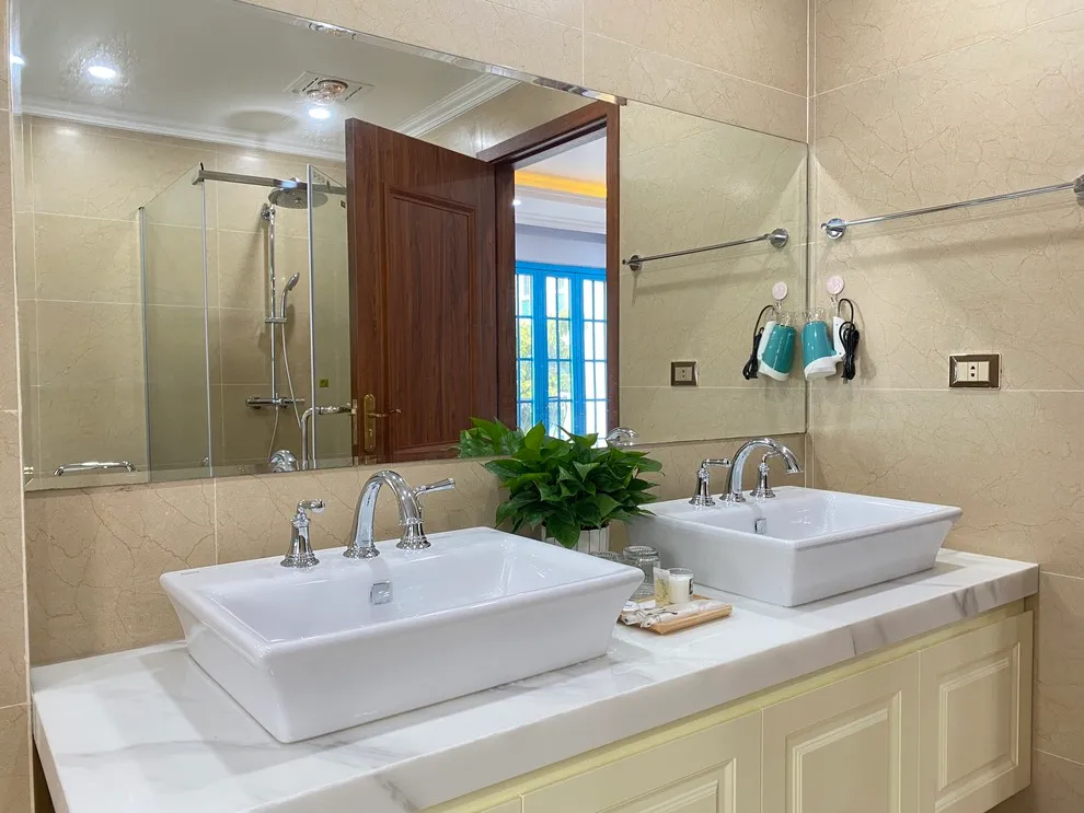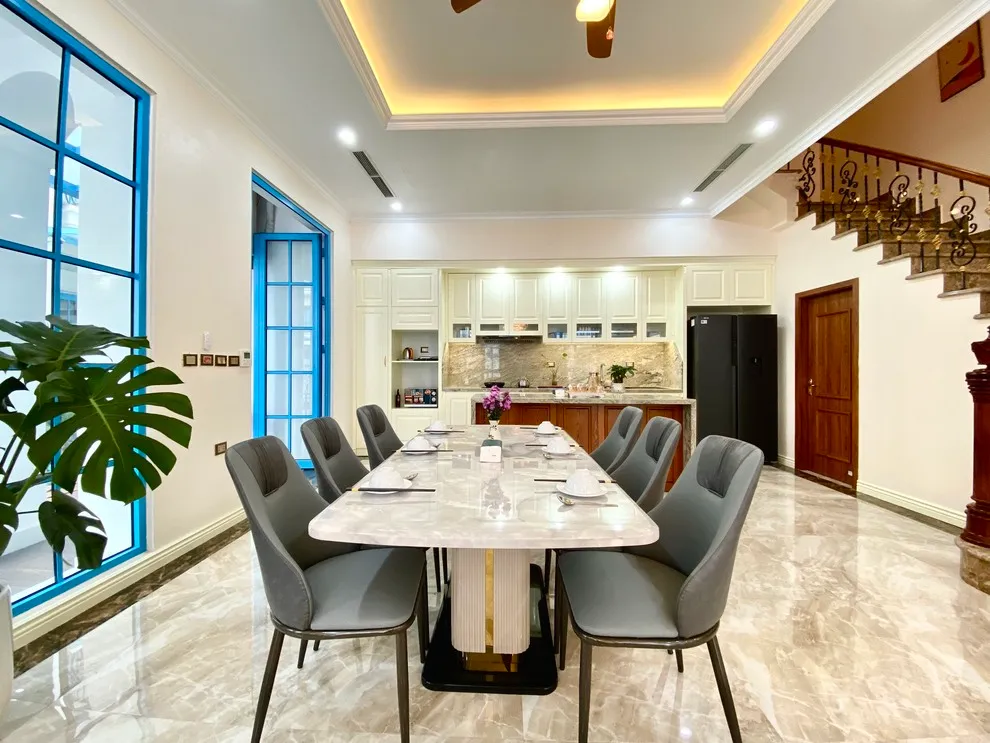 Trái tim của villa là phòng khách rộng lớn với Smart TV 65 inch và dàn Karaoke loa kéo công suất mạnh mẽ, sẵn sàng cho những buổi tối giải trí bùng nổ. Đặc biệt, khu vực bếp và phòng ăn được thiết kế thông minh với đầy đủ dụng cụ nấu nướng cho 20 người, bao gồm cả hai bộ bàn ghế ăn sang trọng trong nhà và ngoài trời kết hợp cùng bếp nướng BBQ than hoa, tạo nên không gian tuyệt vời để cả đoàn cùng nhau chế biến hải sản tươi ngon.