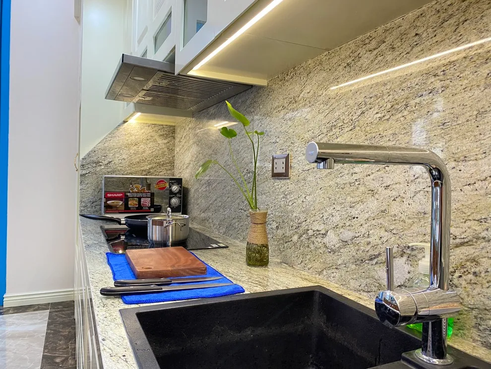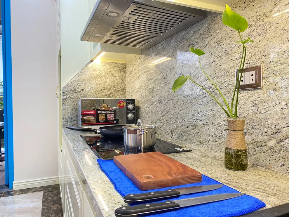 • Tiện ích bếp: Quý khách được sử dụng miễn phí bếp từ, tủ lạnh, lò vi sóng, ấm siêu tốc và đầy đủ bát đũa cho 20 người.