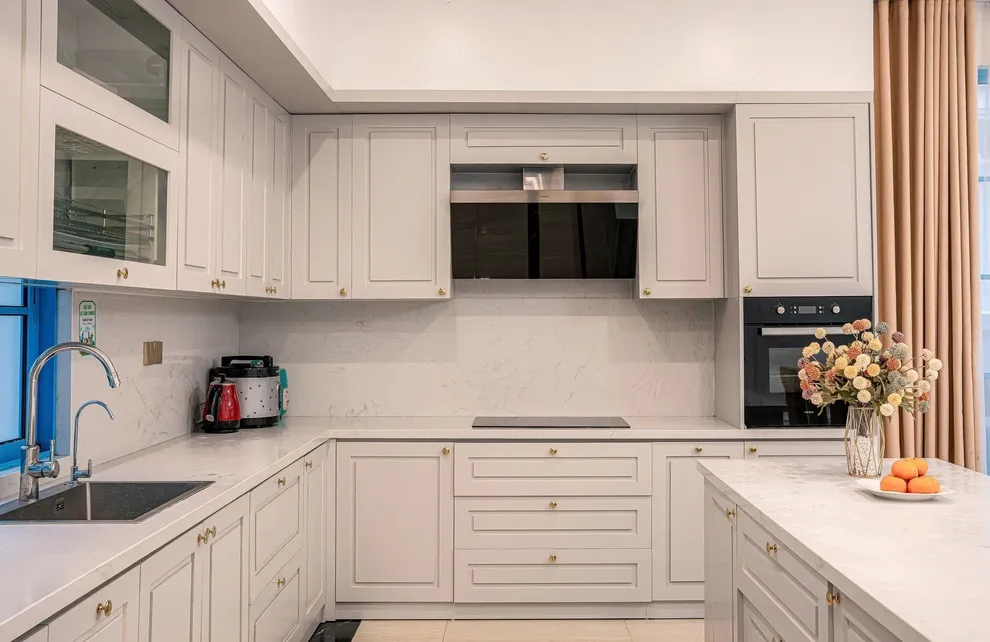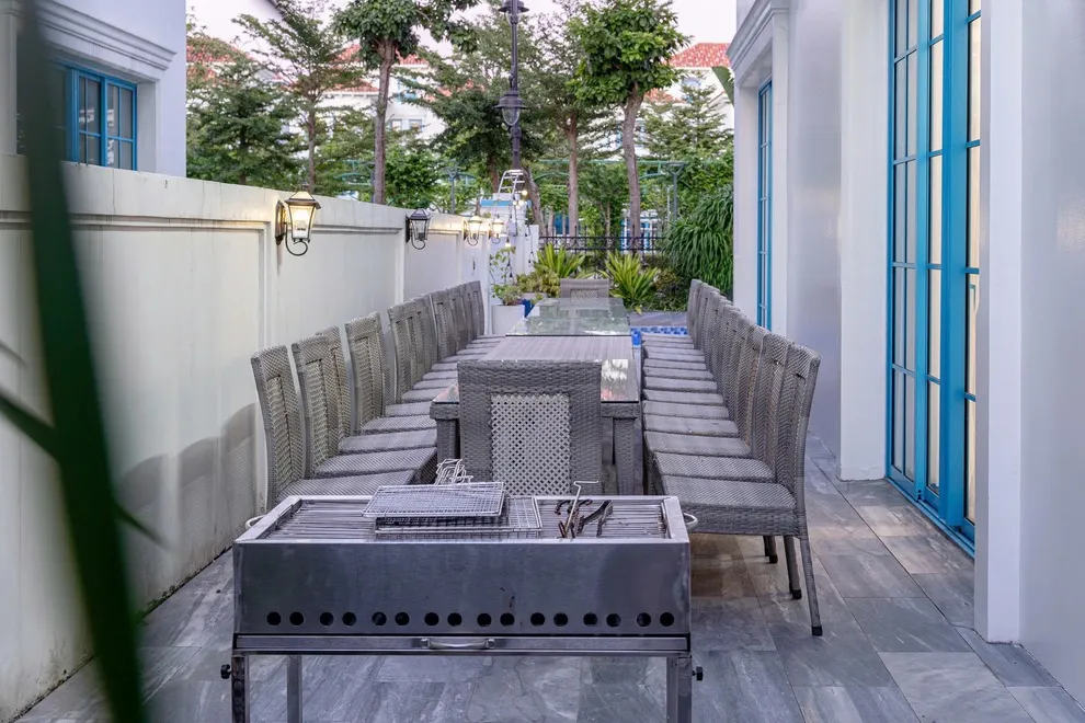 Để tối ưu trải nghiệm, Quý khách có thể sử dụng bếp trong nhà (có điều hòa) để ăn uống mát mẻ và bếp ngoài trời (có khu vực bồn rửa sơ chế riêng) để tổ chức tiệc BBQ. Thiết kế này giúp không gian trong nhà luôn sạch sẽ, không bị ám mùi khói nướng.