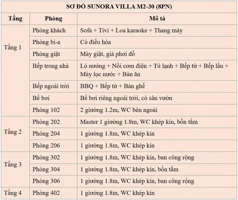 Điểm nhấn vượt trội của M2-30 Villa nằm ở quy mô ấn tượng với cấu trúc 4 tầng gồm 8 phòng ngủ siêu VIP, được trang bị 7 giường lớn và 2 giường đơn, đáp ứng không gian nghỉ ngơi thoải mái cho đoàn khách lớn. Mọi chi tiết trong biệt thự đều được chăm chút kỹ lưỡng, từ hệ thống 8 nhà vệ sinh đầy đủ đồ dùng cá nhân cao cấp đến thang máy trong nhà hiện đại giúp việc di chuyển trở nên dễ dàng. Đặc biệt, biệt thự sở hữu hệ thống bếp kép vô cùng tiện lợi: gian bếp trong nhà hiện đại với đầy đủ thiết bị và bếp ngoài trời có khu vực sơ chế riêng, kết hợp cùng ánh đèn lung linh tạo nên không gian lý tưởng cho những bữa tiệc BBQ buổi tối.