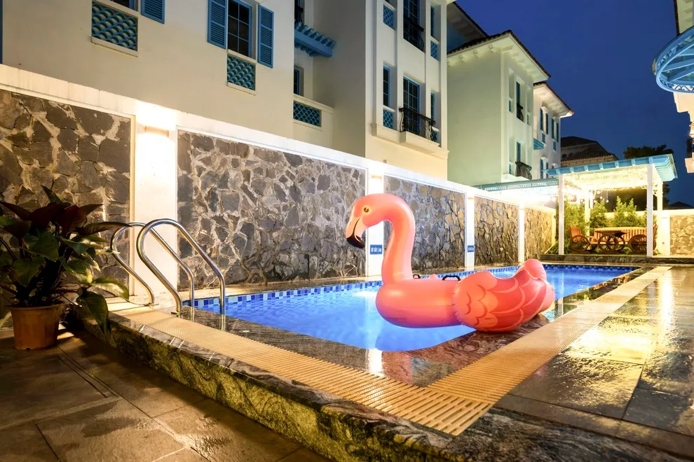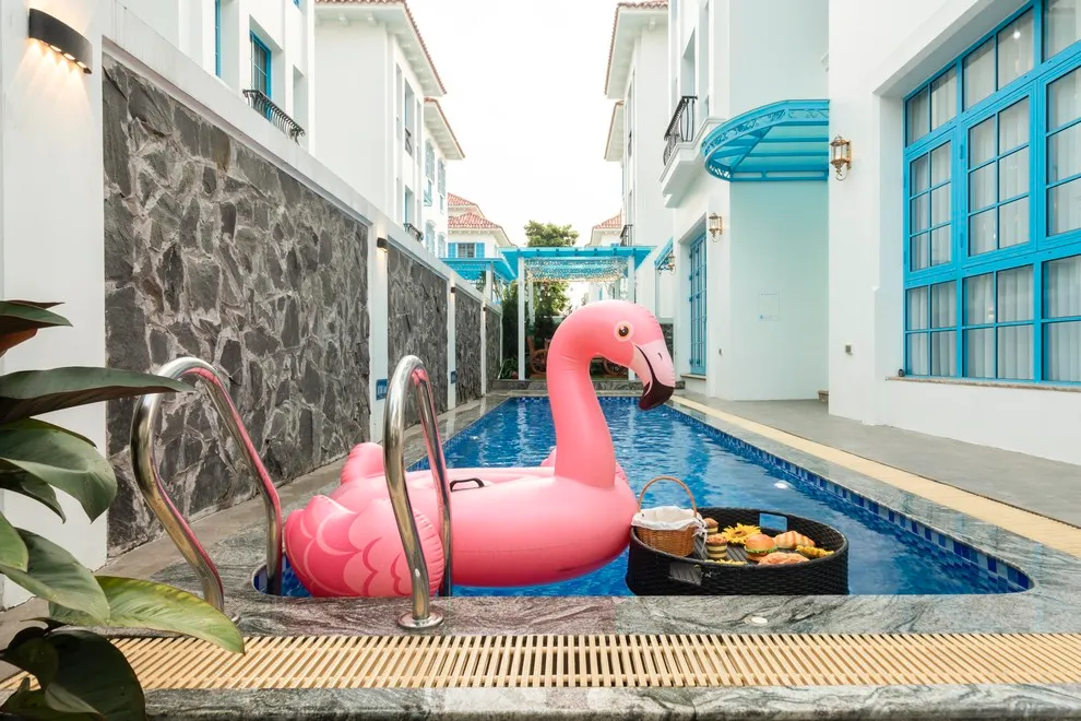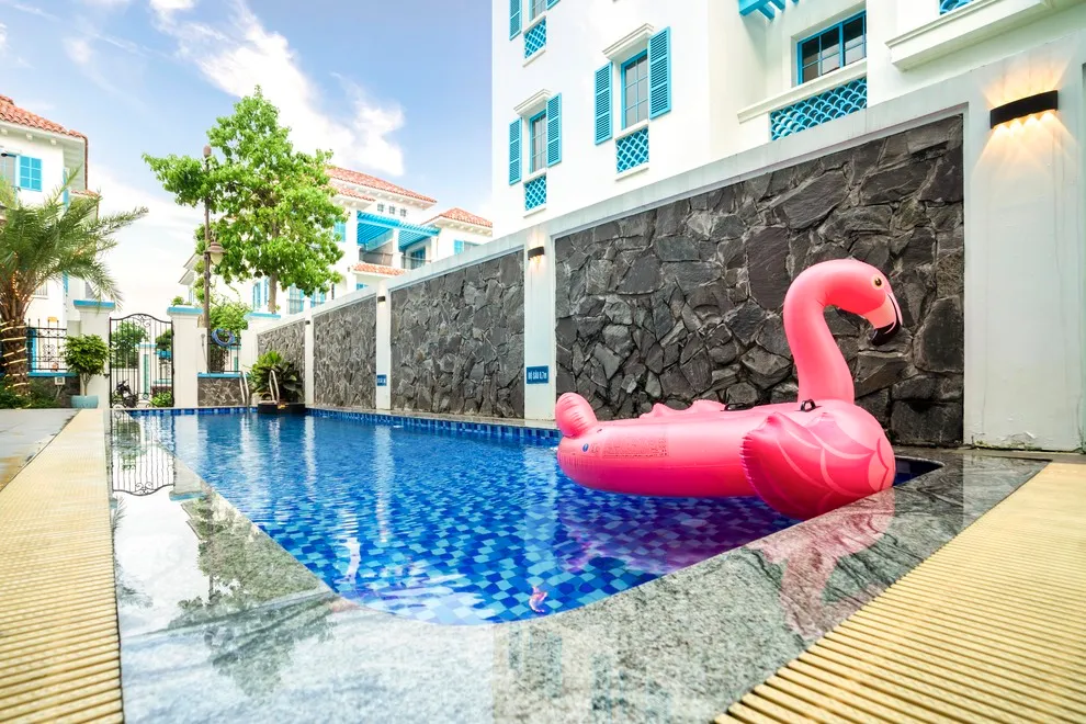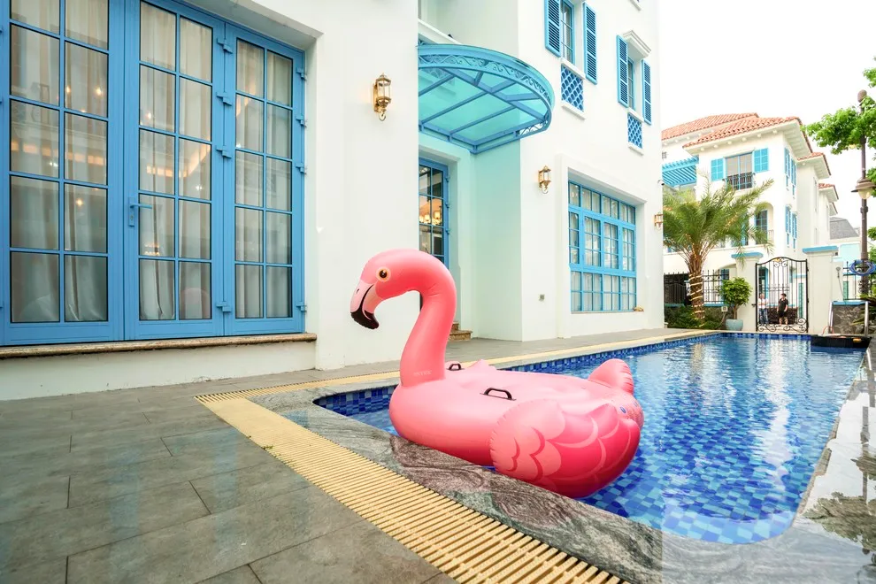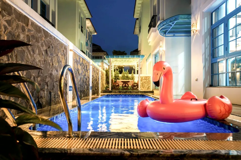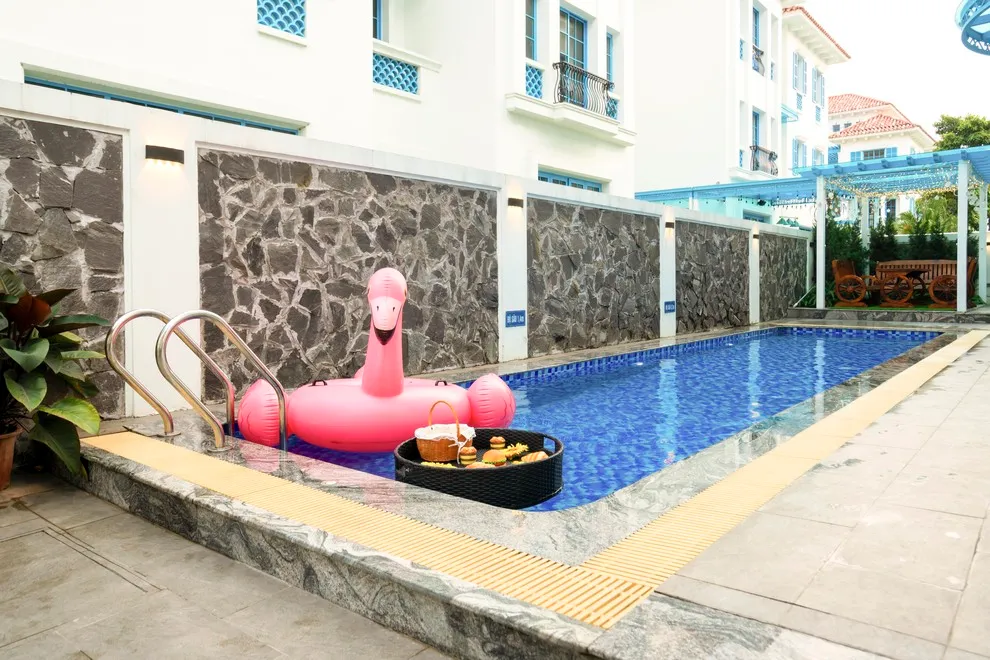 Bể bơi nằm trong khuôn viên sân vườn, là bể nước ngọt ngoài trời (nhiệt độ theo thời tiết tự nhiên). Độ sâu được thiết kế an toàn tiêu chuẩn cho gia đình. Tuy nhiên, nếu gia đình có trẻ nhỏ, ba mẹ vui lòng luôn để mắt đến các bé khi vui chơi dưới nước để đảm bảo an toàn tuyệt đối.