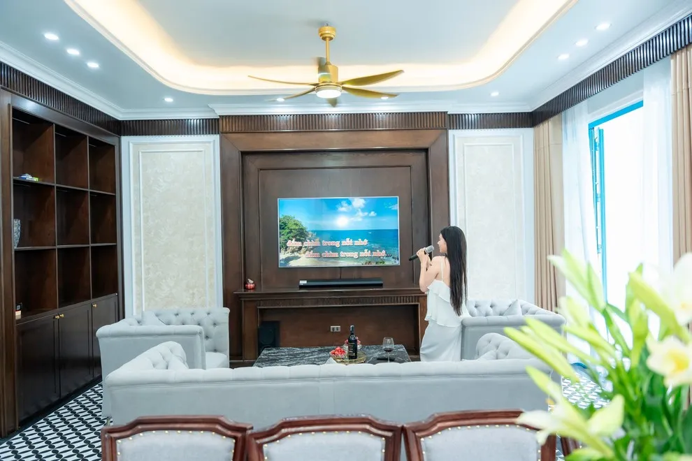 Dàn Karaoke gia đình kết nối hiện đại qua Bluetooth hoặc Smart TV. Về thời gian, do nằm trong khu quần thể nghỉ dưỡng cao cấp, Quý khách vui lòng giảm âm lượng hoặc đóng kín cửa sau 22h00 để đảm bảo không gian yên tĩnh chung.