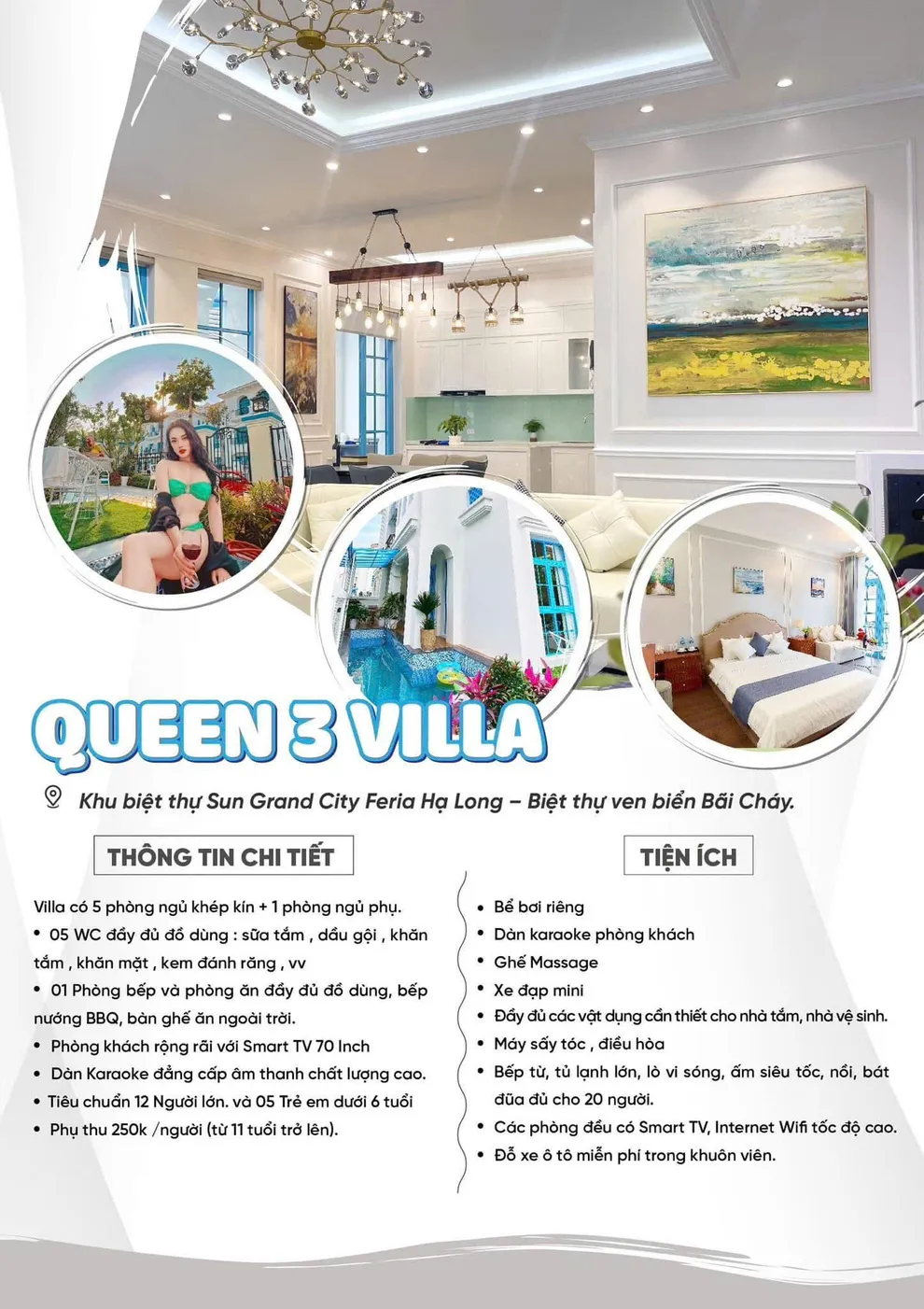 Chào mừng bạn đến với Queen 3 Villa (C5-17), tọa lạc tại phân khu Sun Grand City Feria Hạ Long – điểm dừng chân lý tưởng cho những ai khao khát một kỳ nghỉ sang trọng có bể bơi riêng ngay sát bãi tắm Bãi Cháy. Với vị trí đắc địa, từ biệt thự bạn chỉ mất khoảng 3-5 phút đi bộ là có thể hòa mình vào làn nước biển xanh mát của bãi tắm lớn nhất Miền Bắc.