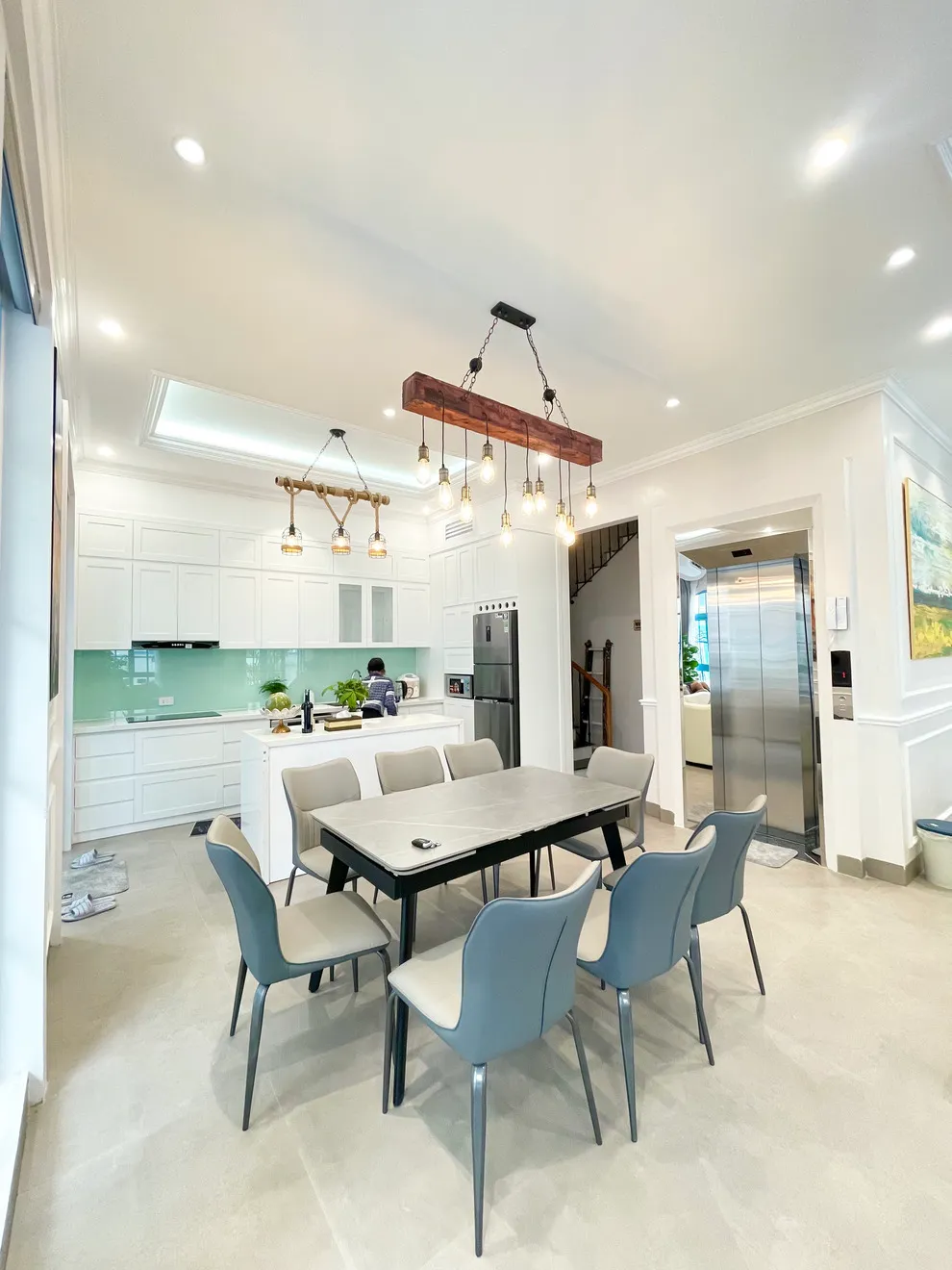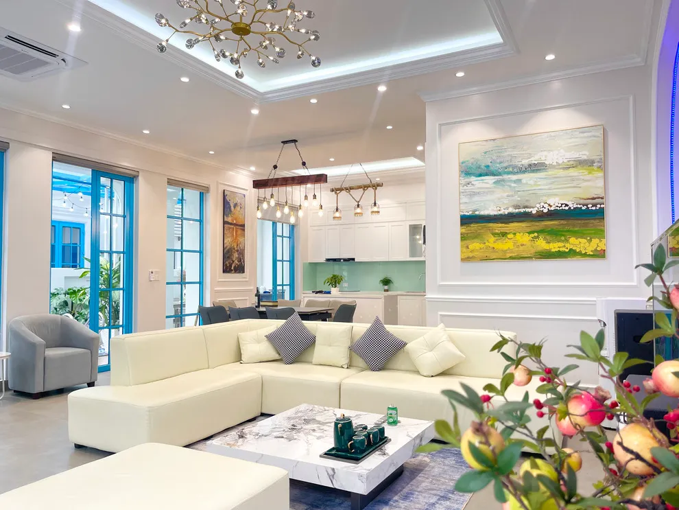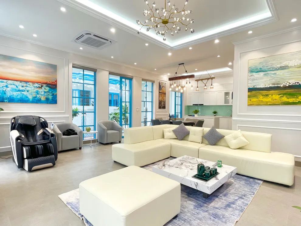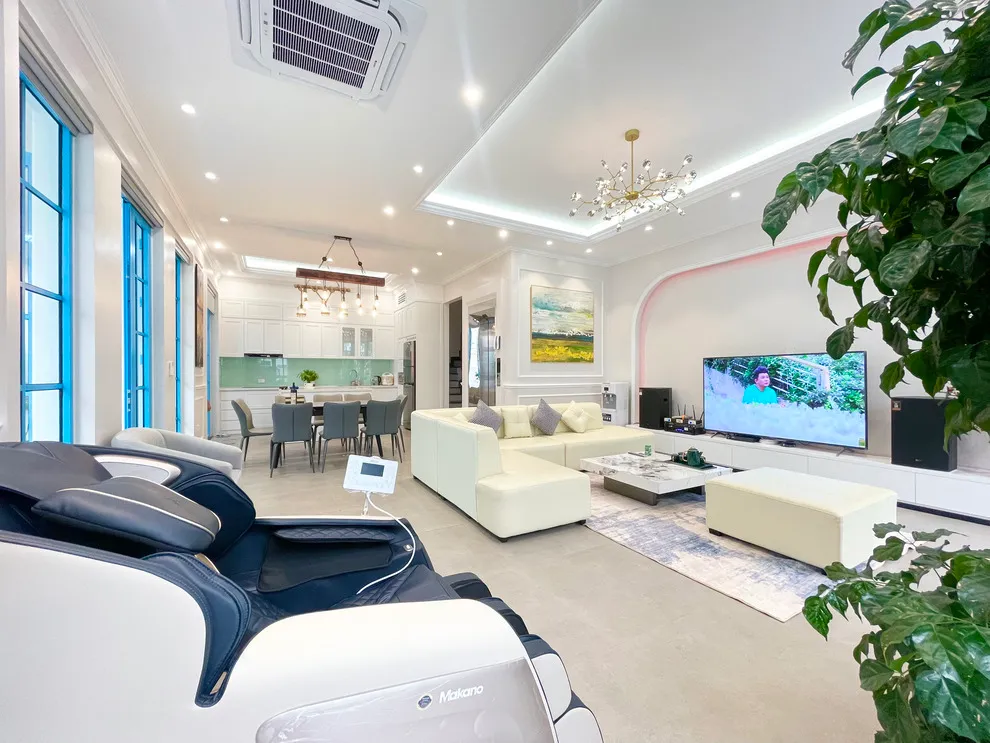 Trái tim của căn biệt thự chính là phòng khách đẳng cấp, nơi sở hữu Smart TV 70 Inch khổng lồ cùng dàn Karaoke âm thanh chất lượng cao, sẵn sàng biến những buổi tối sum họp thành một sân khấu âm nhạc bùng nổ. Để kỳ nghỉ thêm phần thư giãn, bạn có thể thả mình trên chiếc ghế Massage cao cấp sau những giờ vui chơi hoặc dạo quanh khu biệt thự bằng xe đạp mini có sẵn tại đây. Tất nhiên, không thể không nhắc đến bể bơi riêng ngay trong khuôn viên – nơi lý tưởng để cả đoàn tận hưởng những phút giây thư giãn riêng tư nhất.
