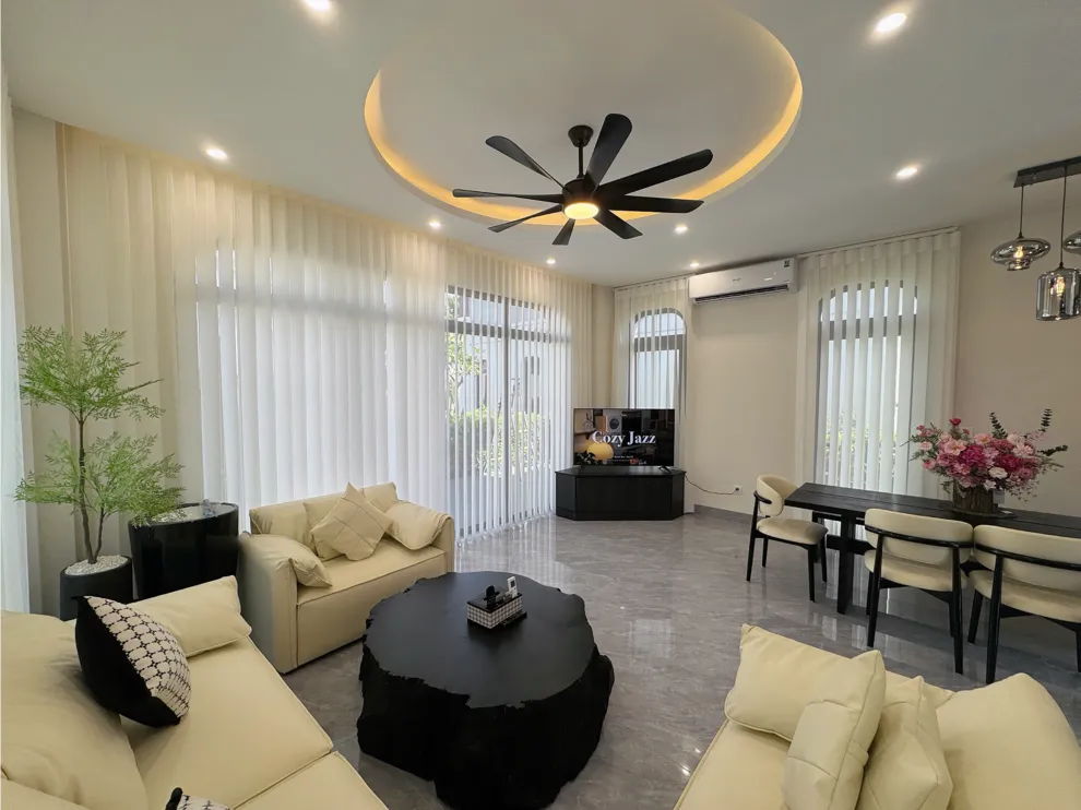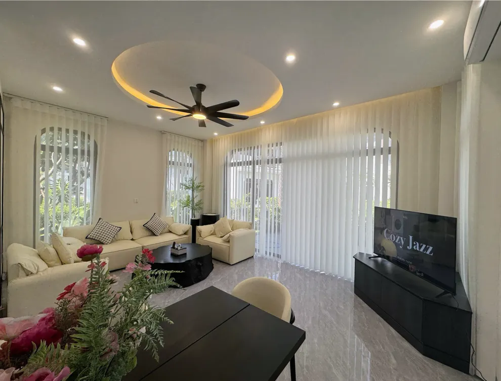 Về cấu trúc, căn villa sở hữu 3 phòng ngủ biệt lập cùng 3 giường lớn, là lựa chọn ưu việt cho các gia đình hạt nhân hoặc nhóm bạn từ 6 đến 8 thành viên. Kiến trúc của V3M02 tận dụng tối đa lợi thế của phong cách hiện đại với không gian mở, cho phép ánh sáng tự nhiên và luồng gió biển tươi mát tràn ngập khắp các phòng. Khu vực phòng khách và bếp được thiết kế liên thông, tạo nên một không gian sinh hoạt chung ấm cúng, nơi quý khách có thể cùng nhau tổ chức những bữa cơm gia đình thân mật hoặc đơn giản là thư giãn trên ghế sofa và ngắm nhìn cảnh sắc xanh mát của phân khu.