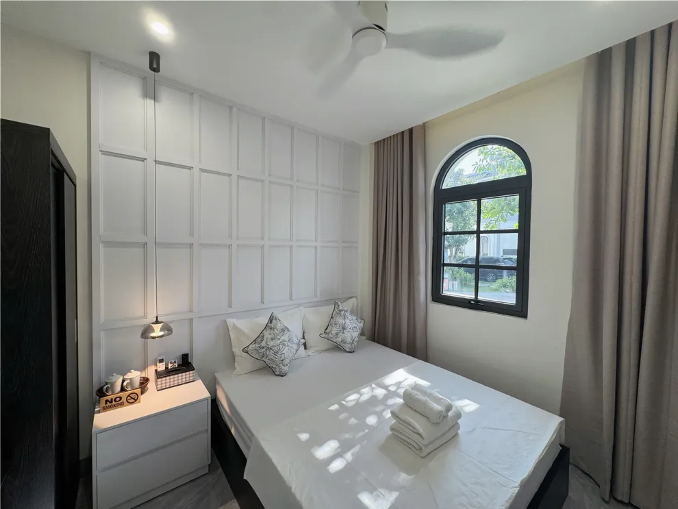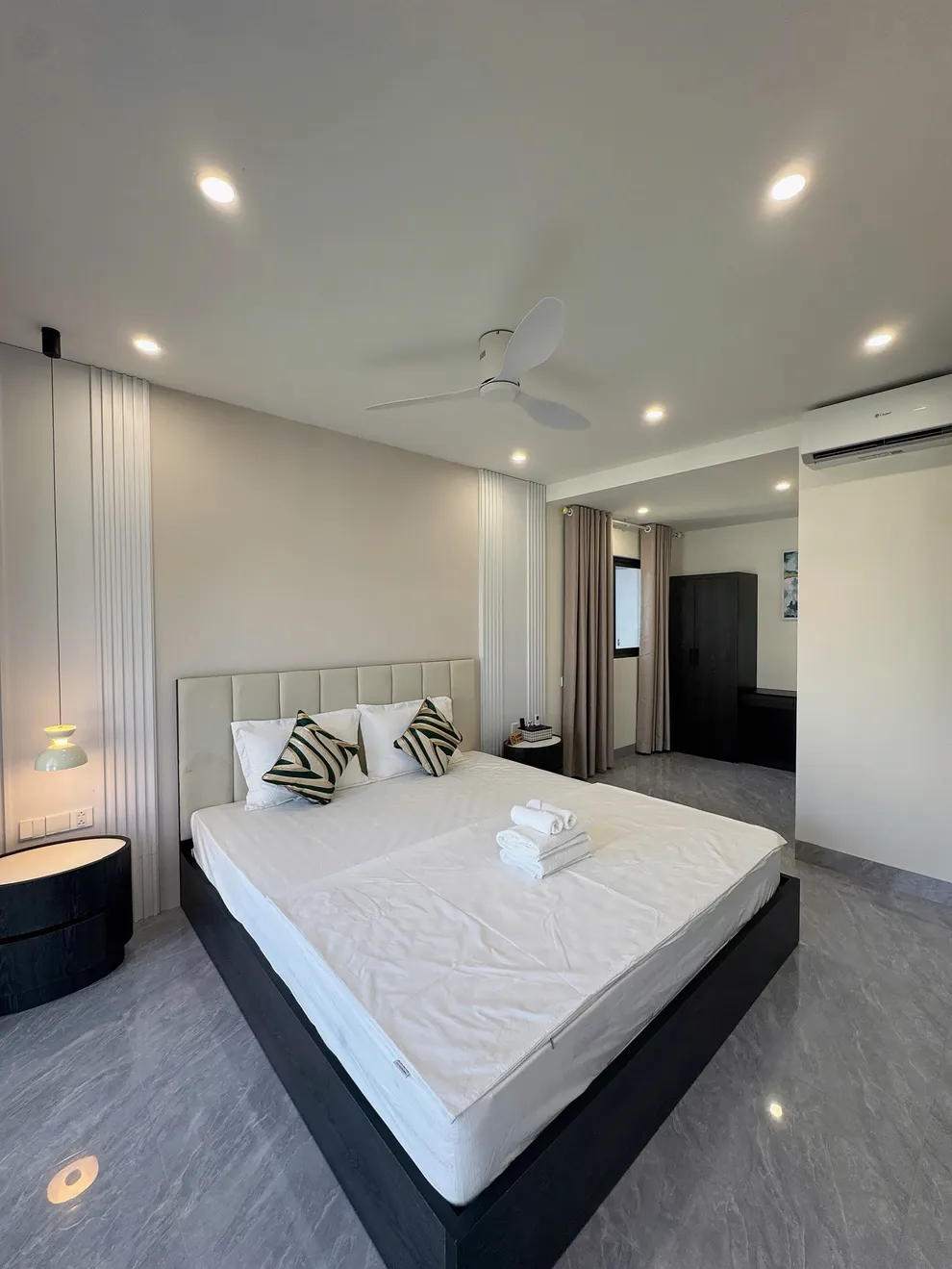 Căn villa này có 3 phòng ngủ với 3 giường lớn cố định. Với đoàn 10 người (bao gồm cả trẻ em), không gian sinh hoạt vẫn đảm bảo rộng rãi, tuy nhiên một số thành viên sẽ cần ngủ chung giường hoặc sử dụng thêm đệm phụ trải sàn (có phụ phí).